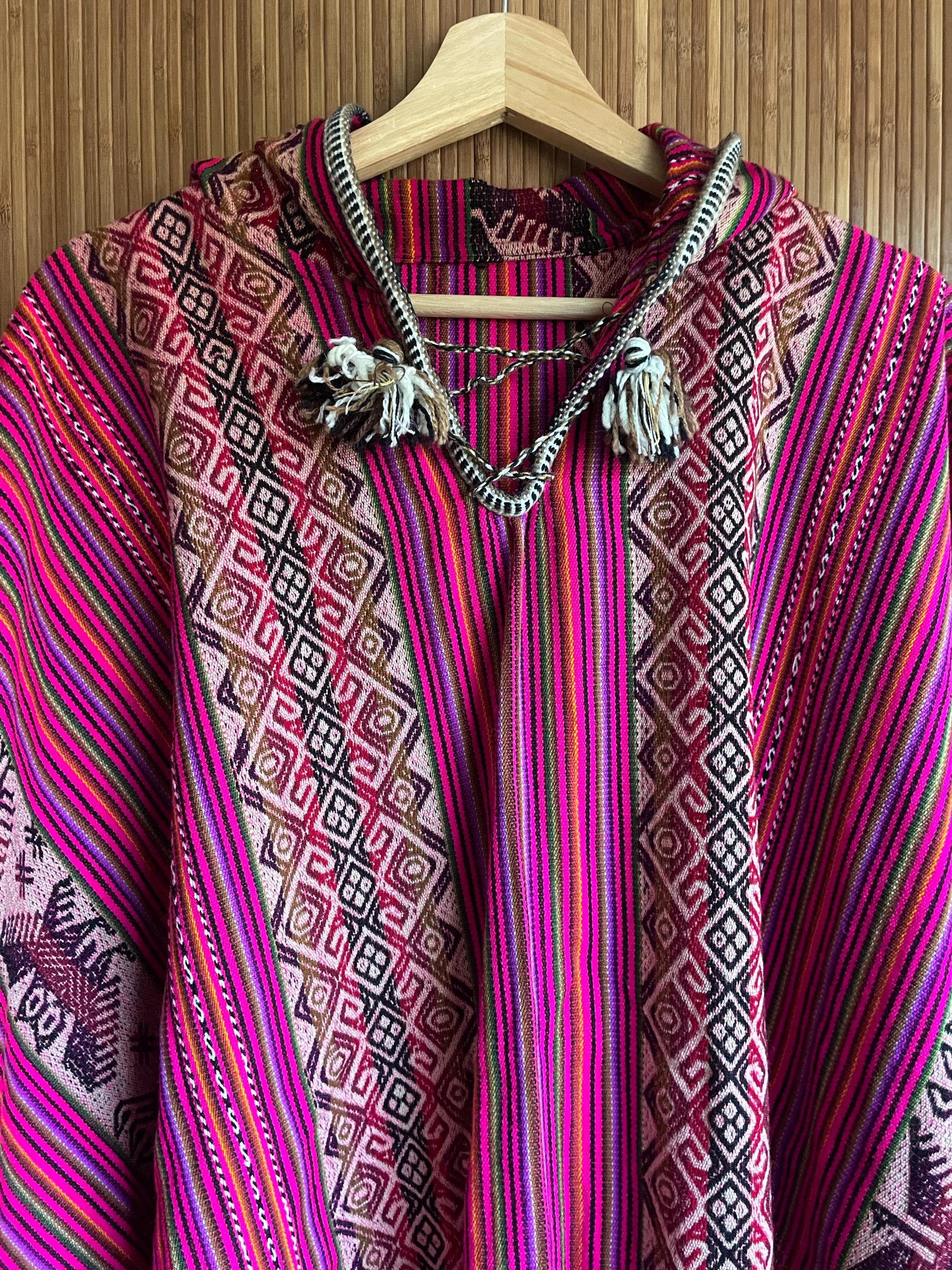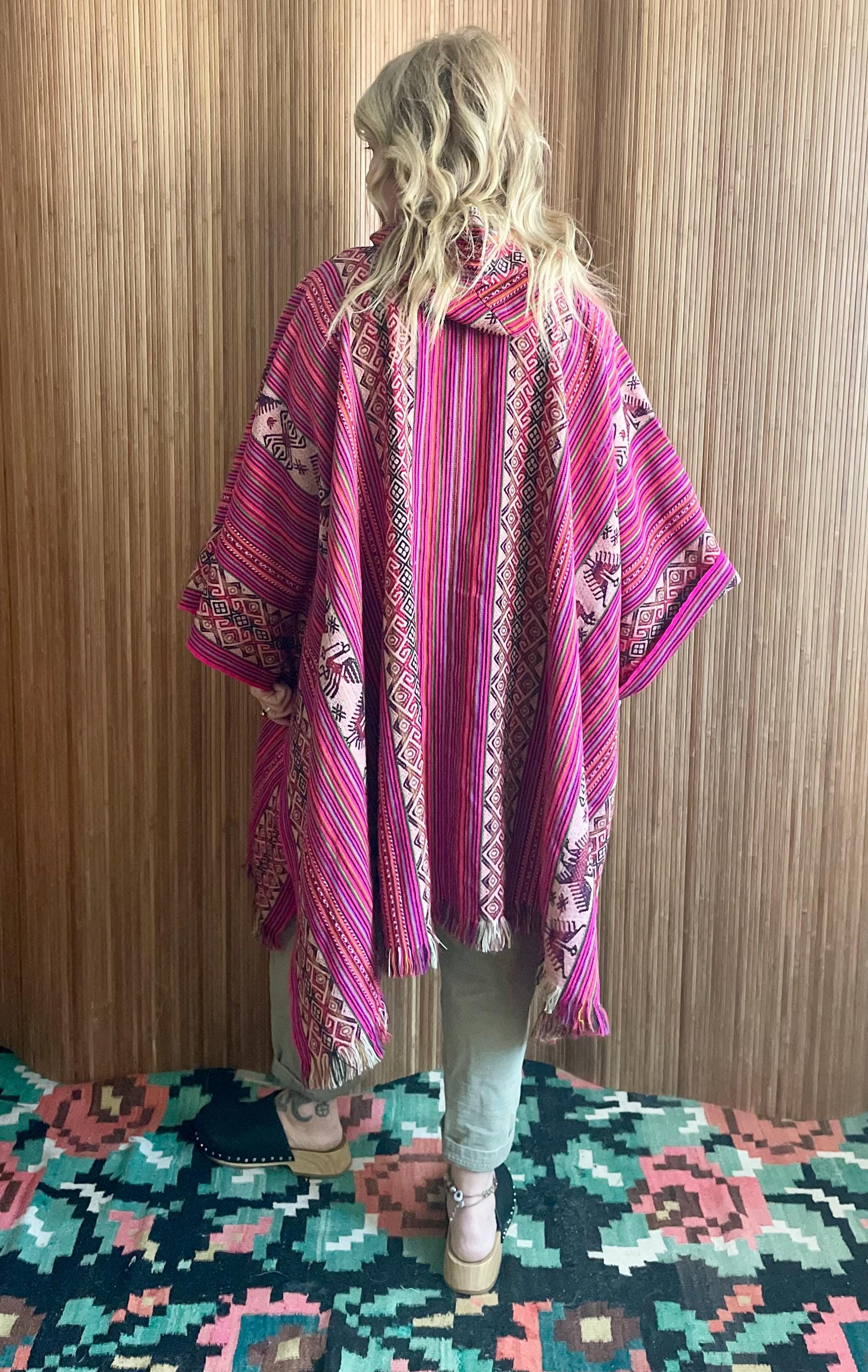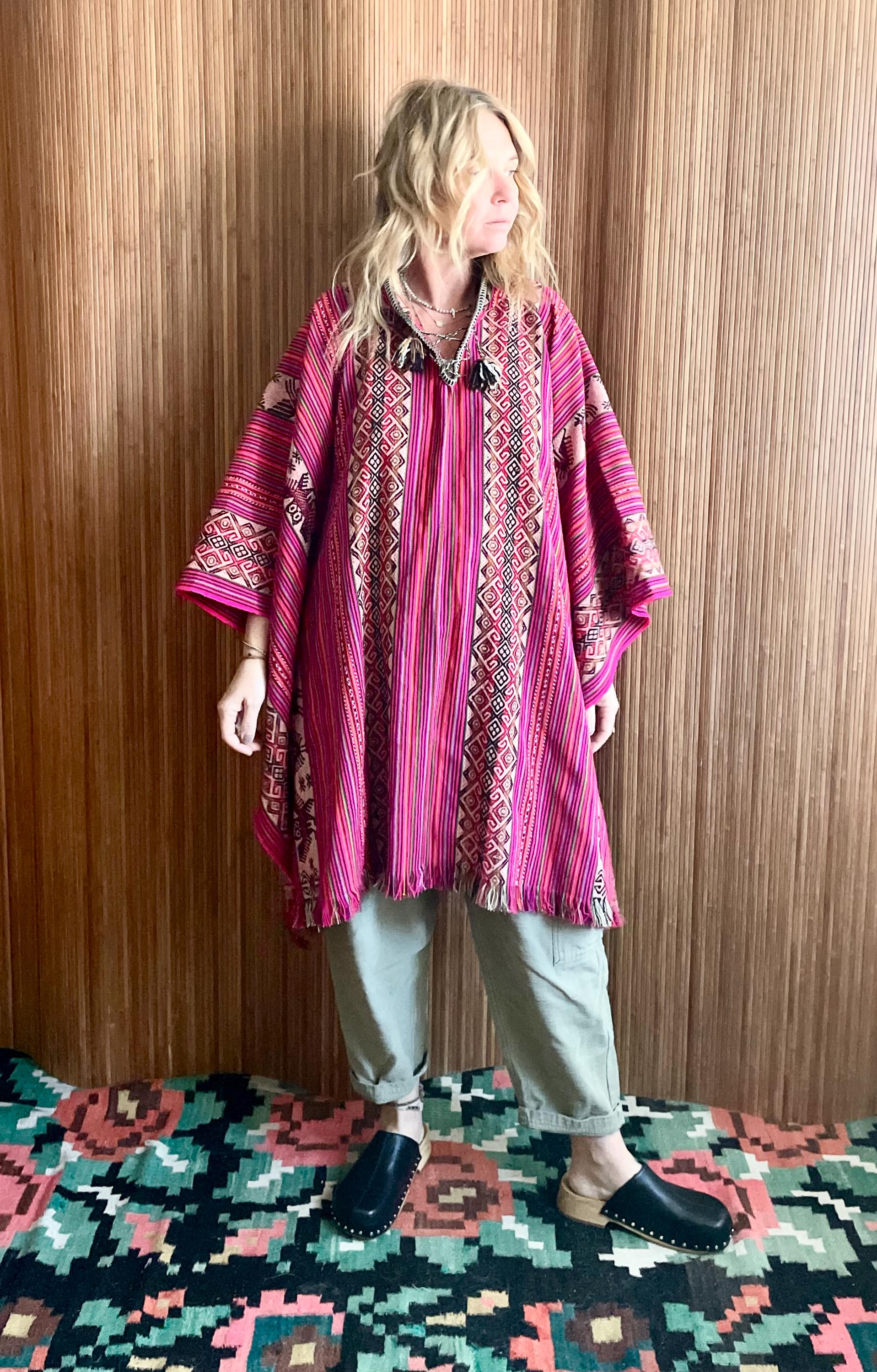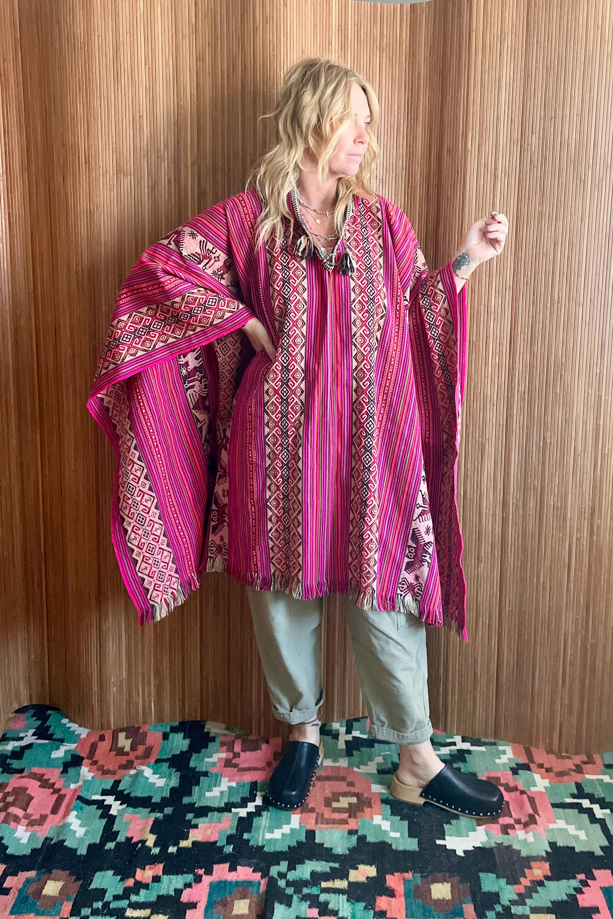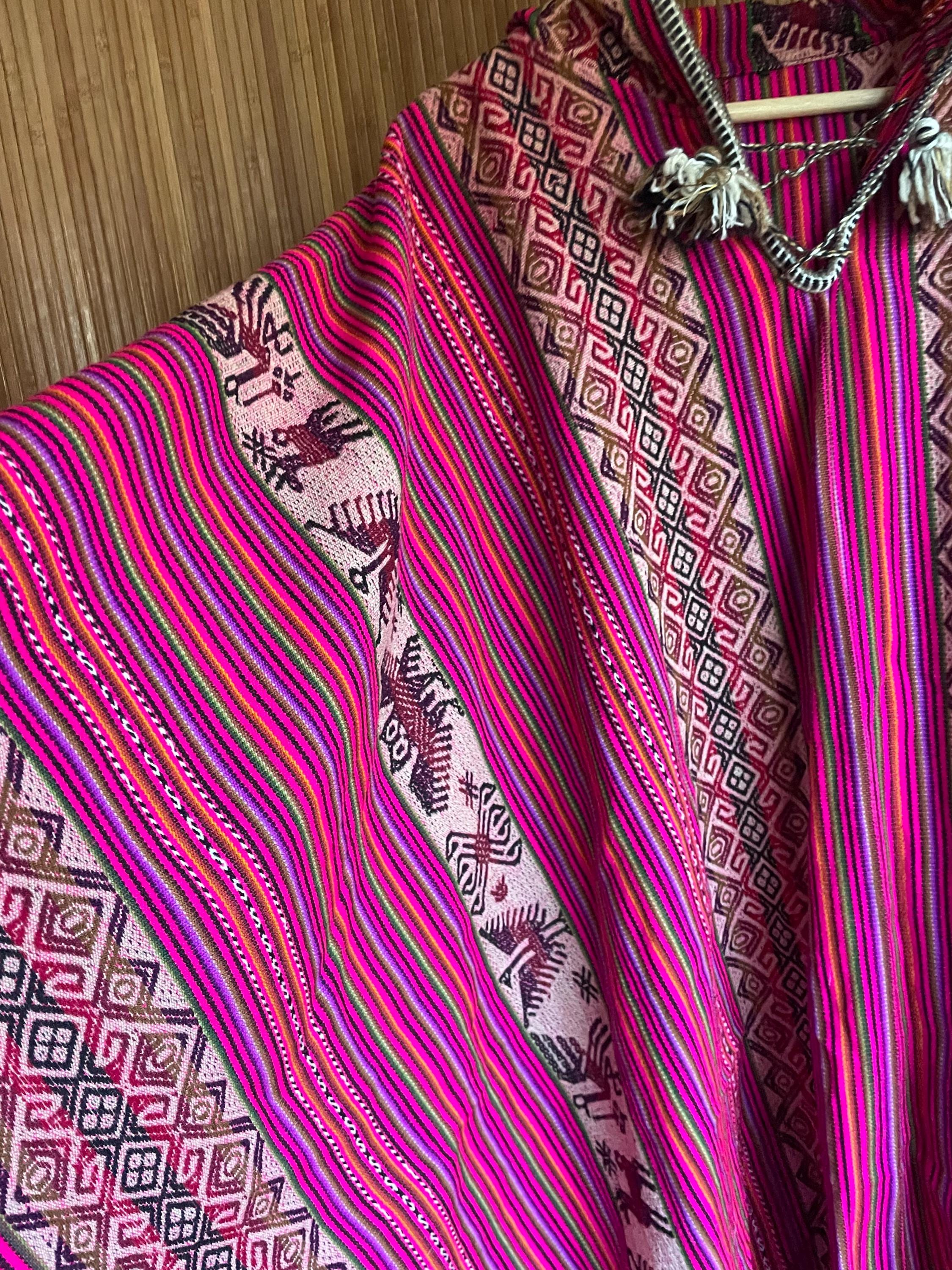 Stunning vintage Peruvian poncho in bold pink with traditional Andean patterns and llama motifs. Hand loomed textile with beautiful drape and tassel ties at the neck. A true statement boho / festival piece.