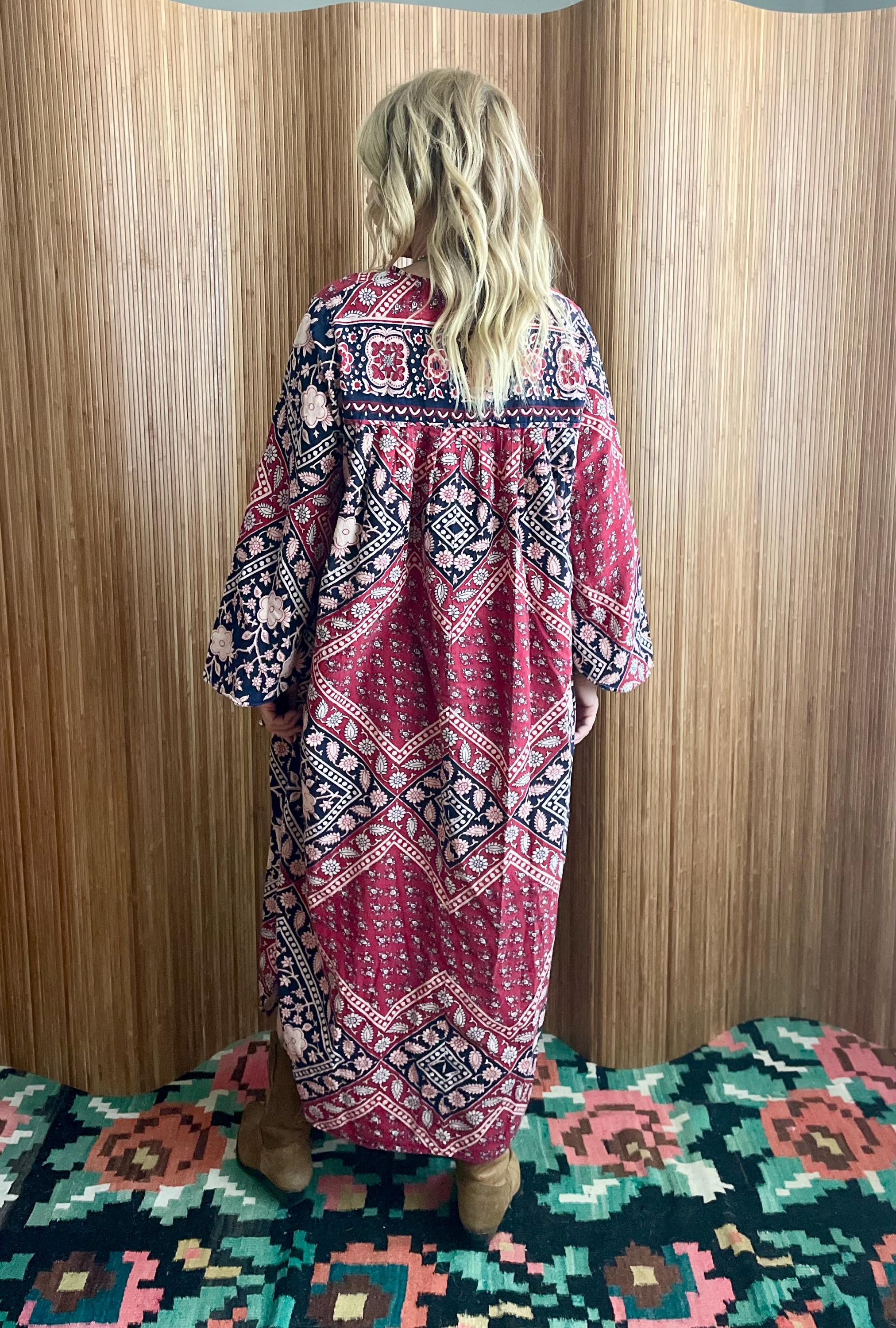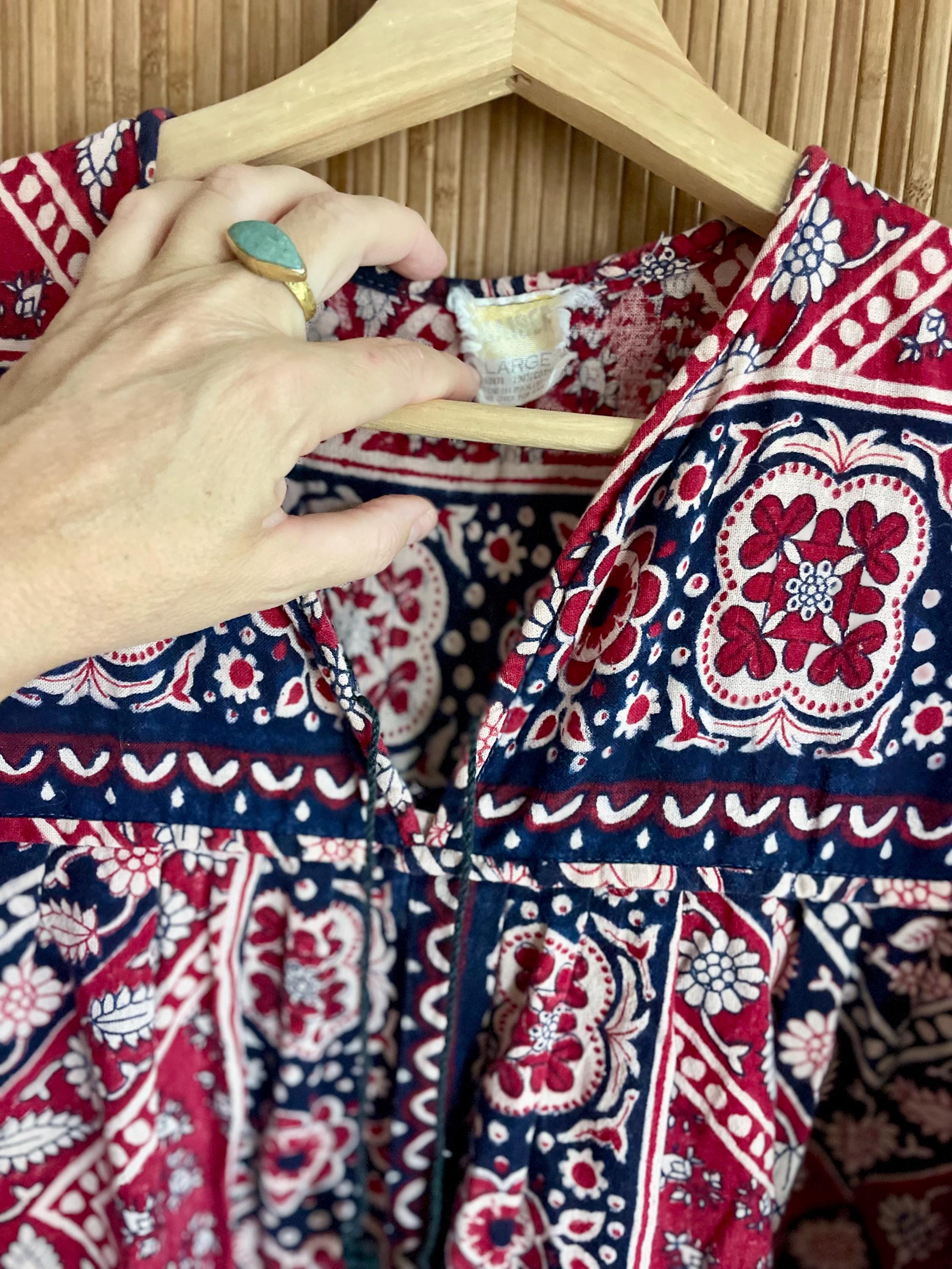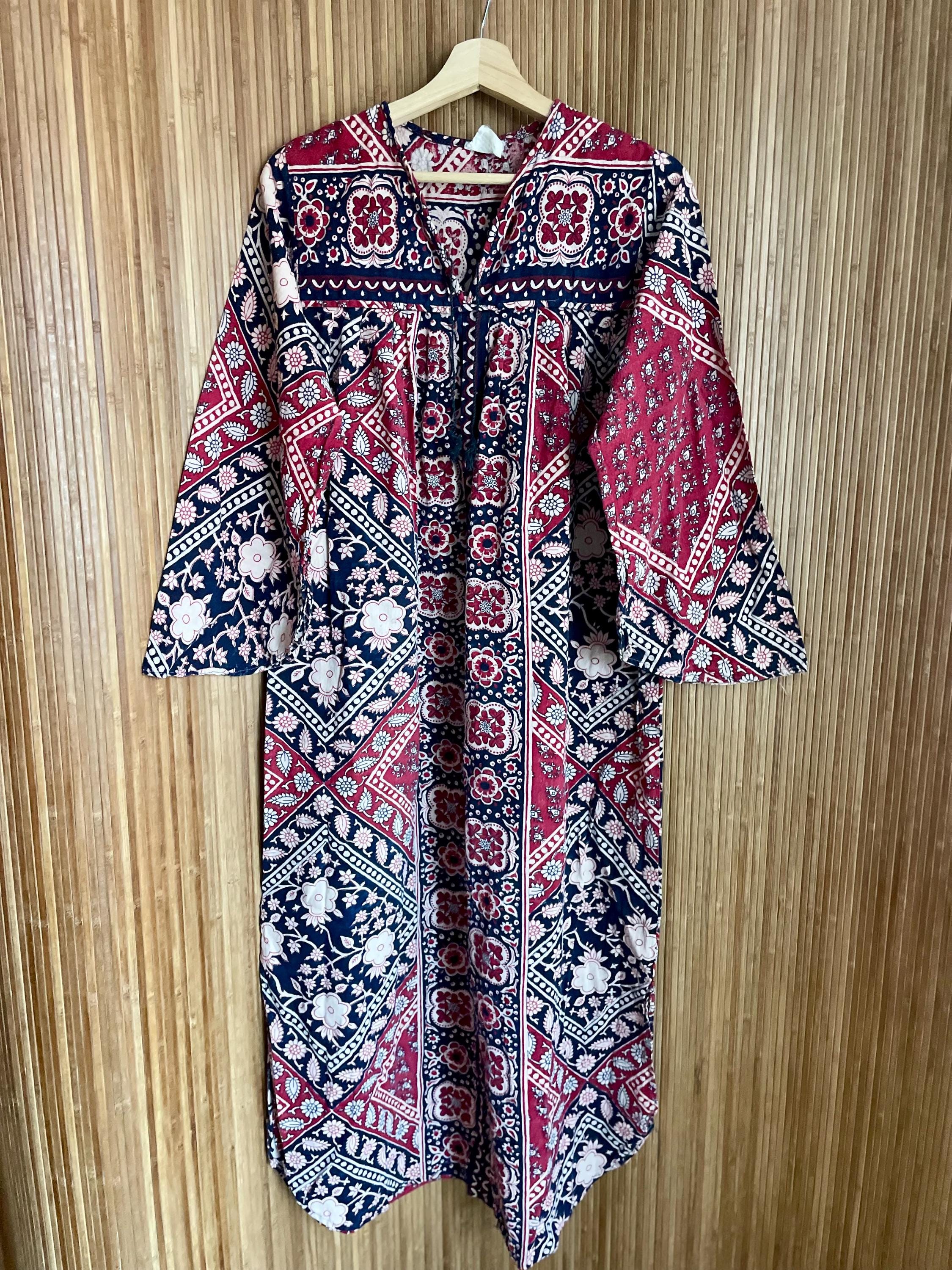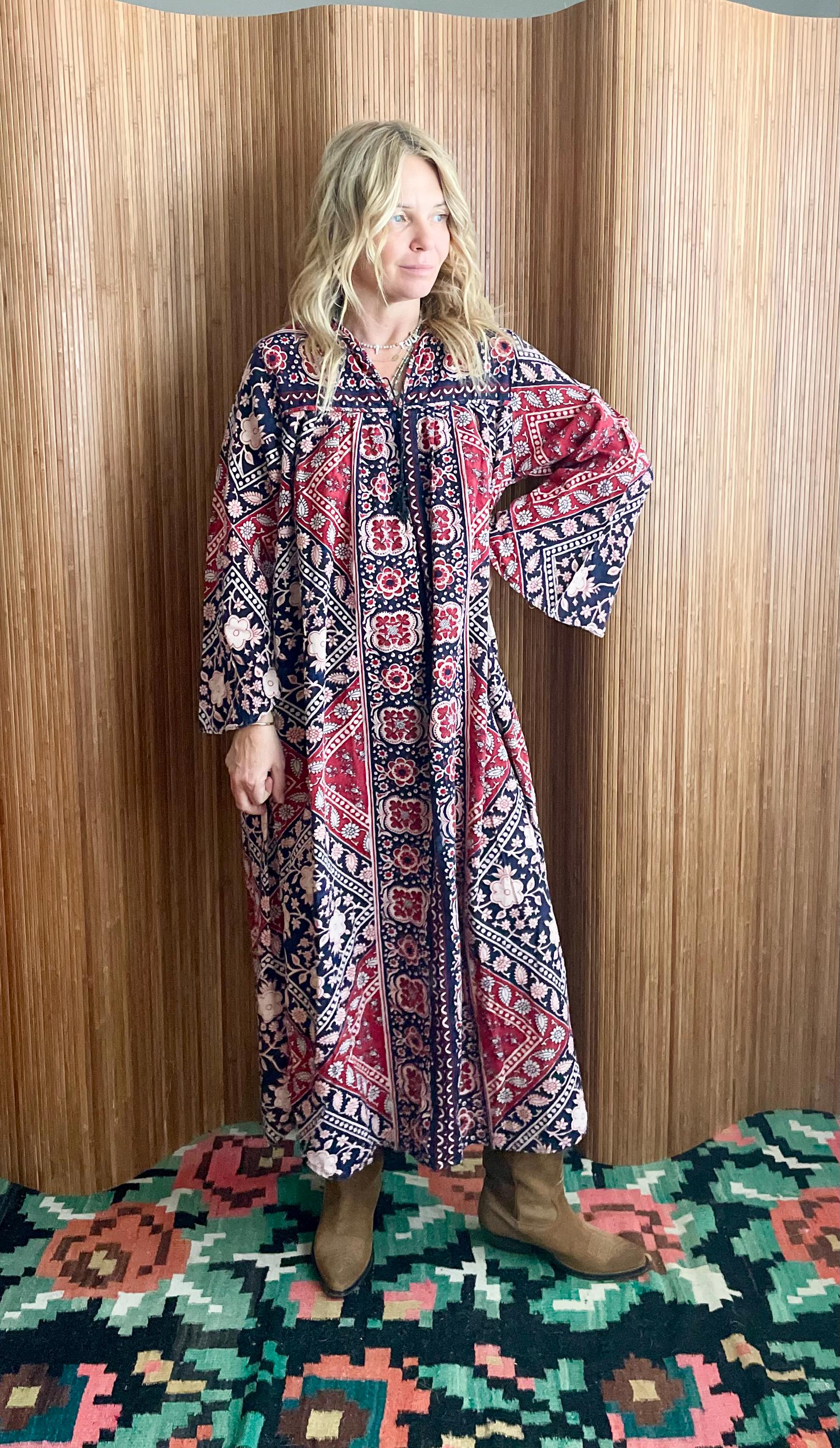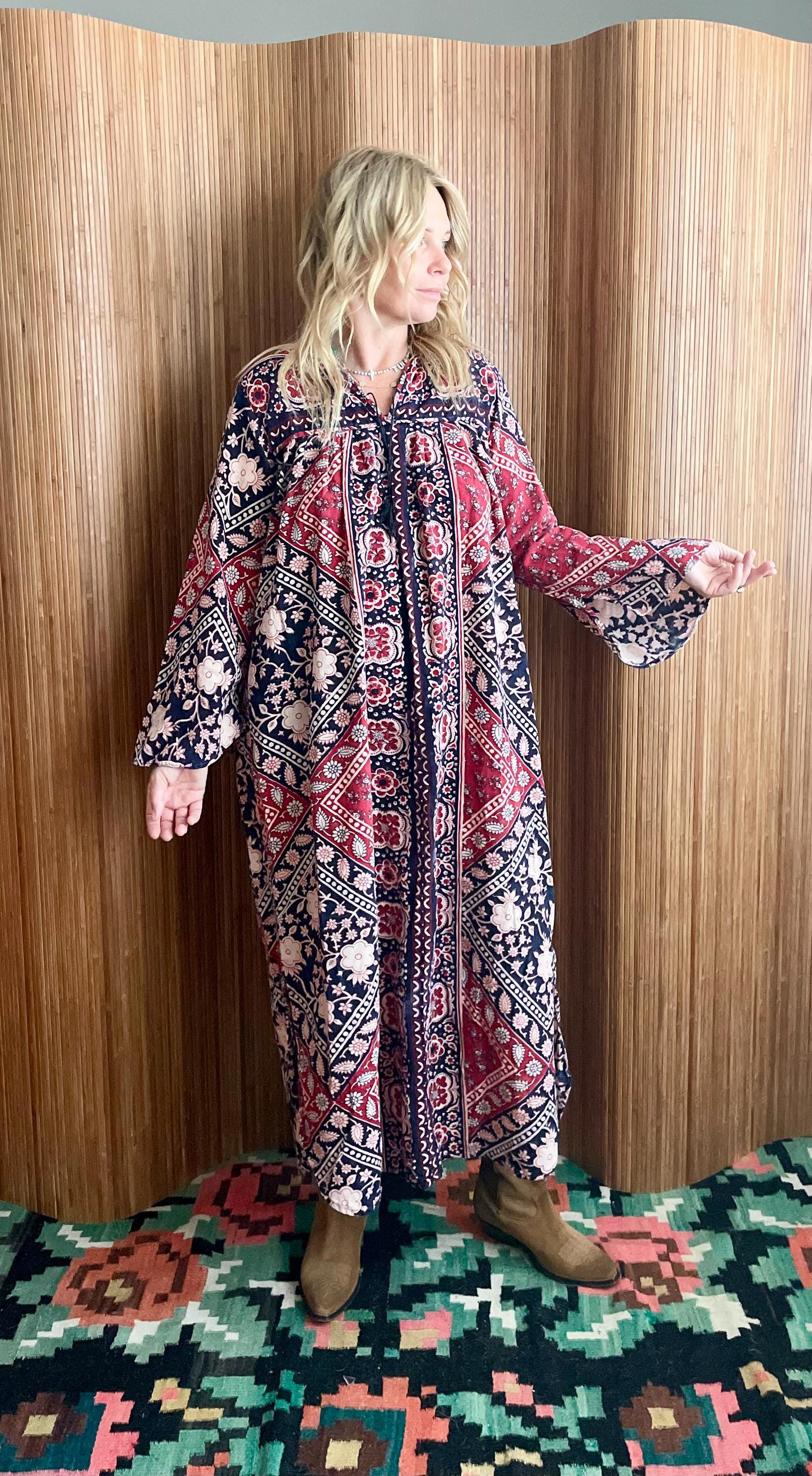 Beautiful vintage Kaiser block print cotton dress in red, navy, and cream with an allover floral and geometric pattern. Easy, relaxed caftan-style fit with long sleeves and a breezy maxi length – perfect as a boho house dress, lounge piece, or statement day dress