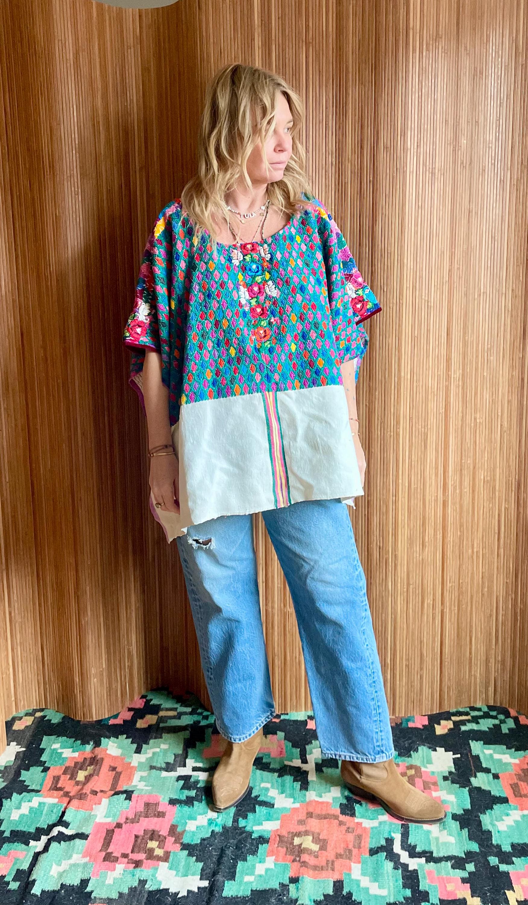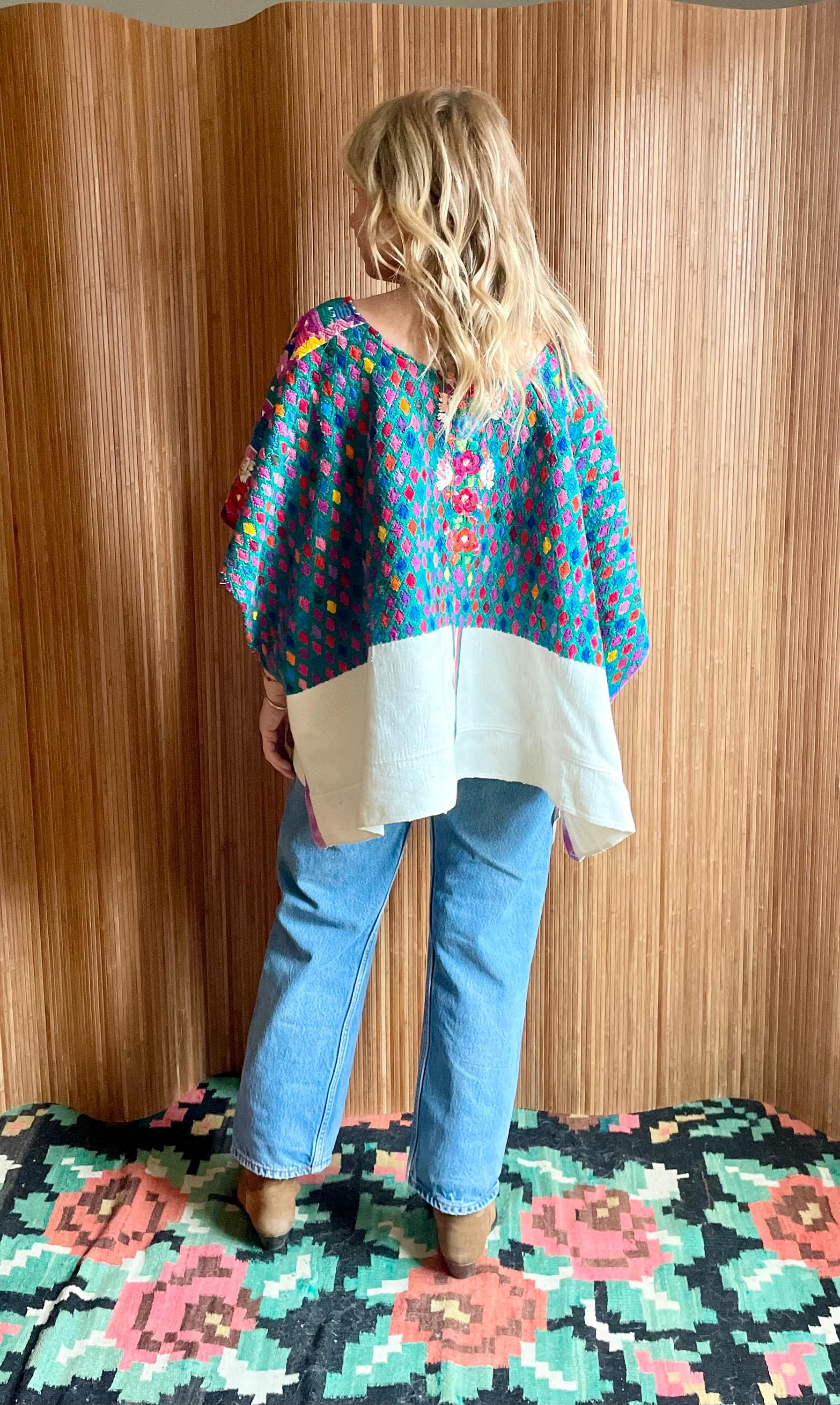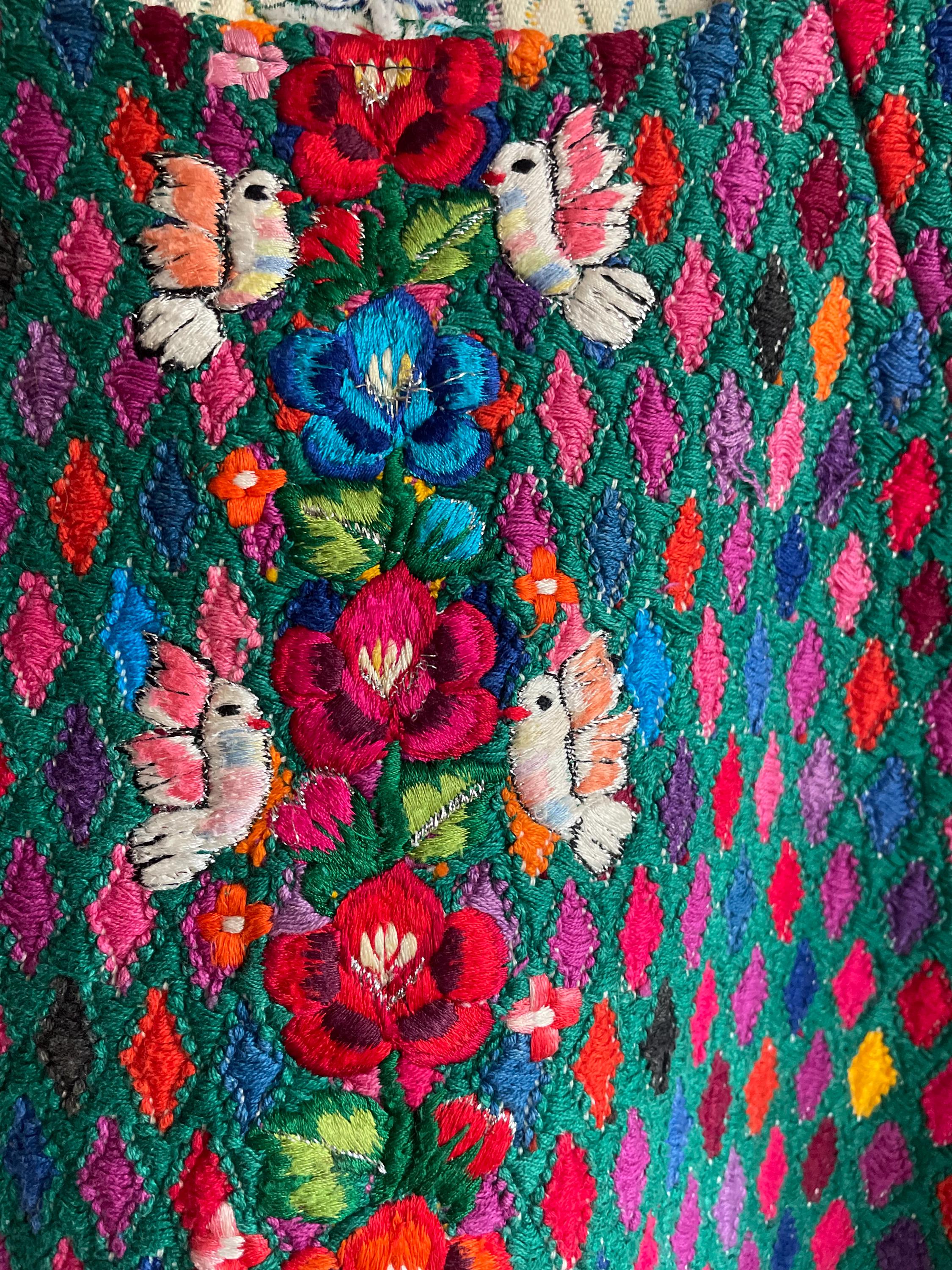 Stunning vintage Guatemalan huipil, hand loomed and richly embroidered in a vibrant diamond weave with multicolor floral details down the front. A true wearable work of art and a beautiful example of traditional Mayan textile craftsmanship. Huipil has open sides