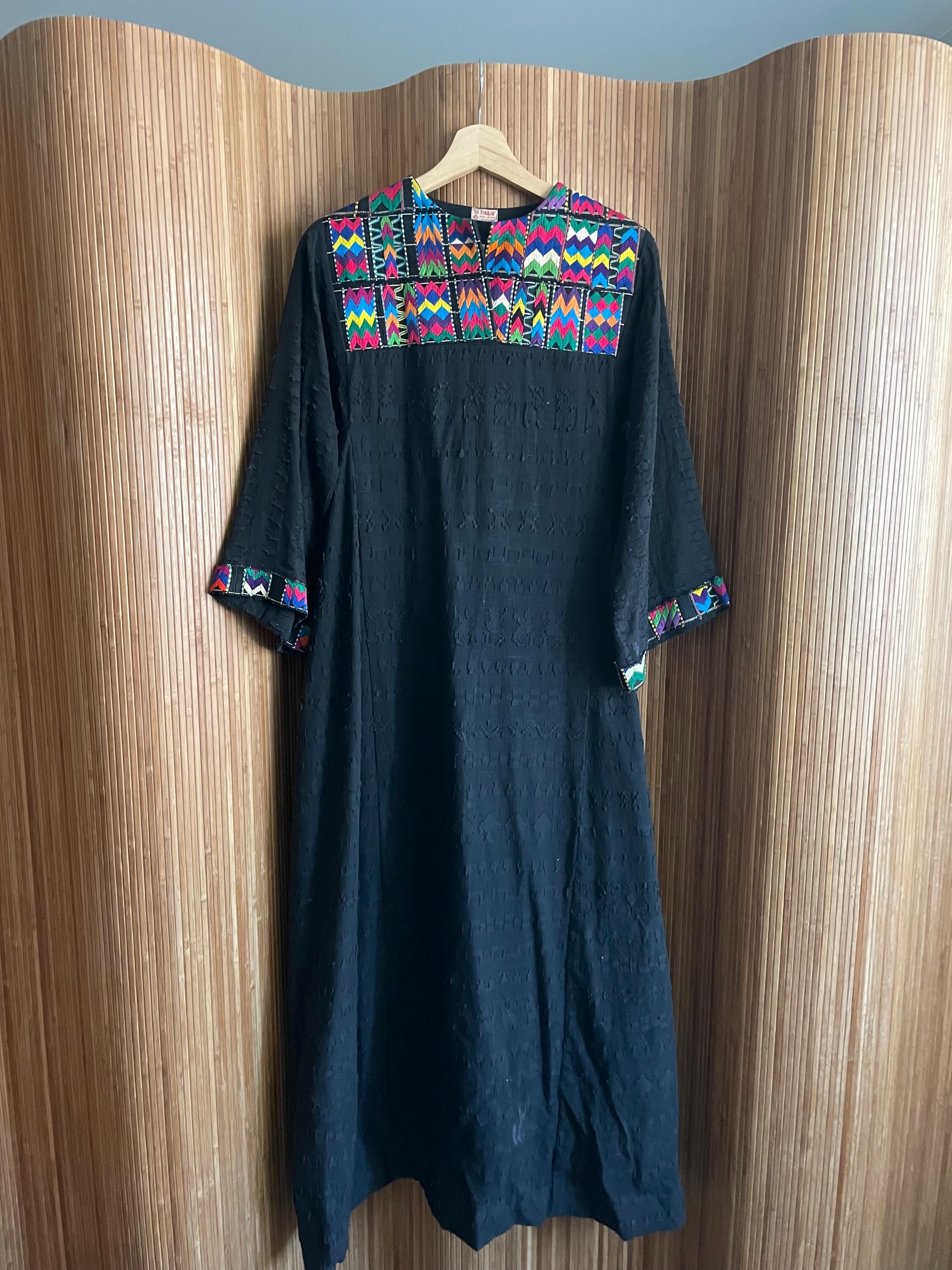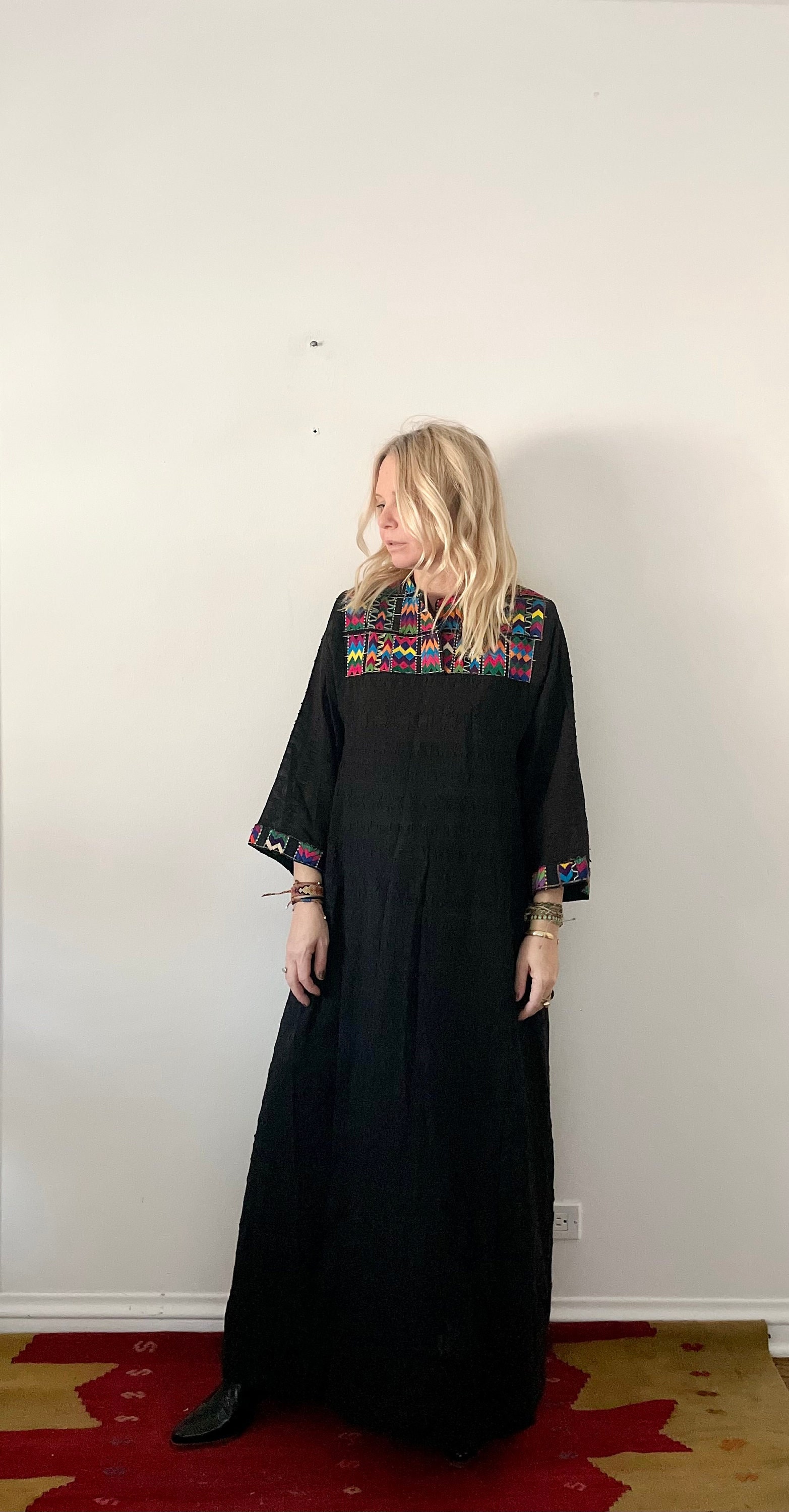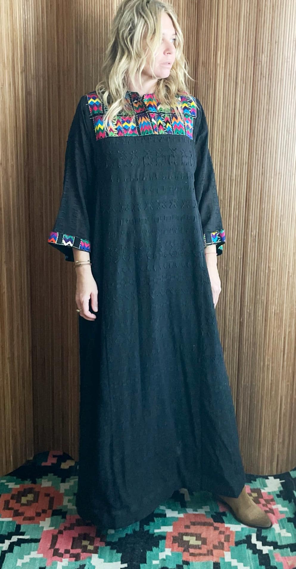 Beautiful vintage Guatemalan kaftan in a deep black hand‑loomed textile, featuring a brightly embroidered huipil‑style chest panel and matching sleeve trim. A striking, easy silhouette that works as a statement boho dress, house dress, or festival piece.
