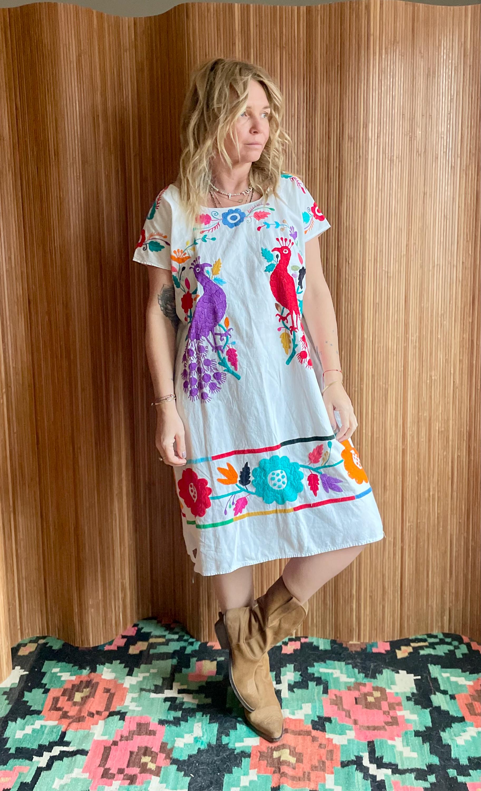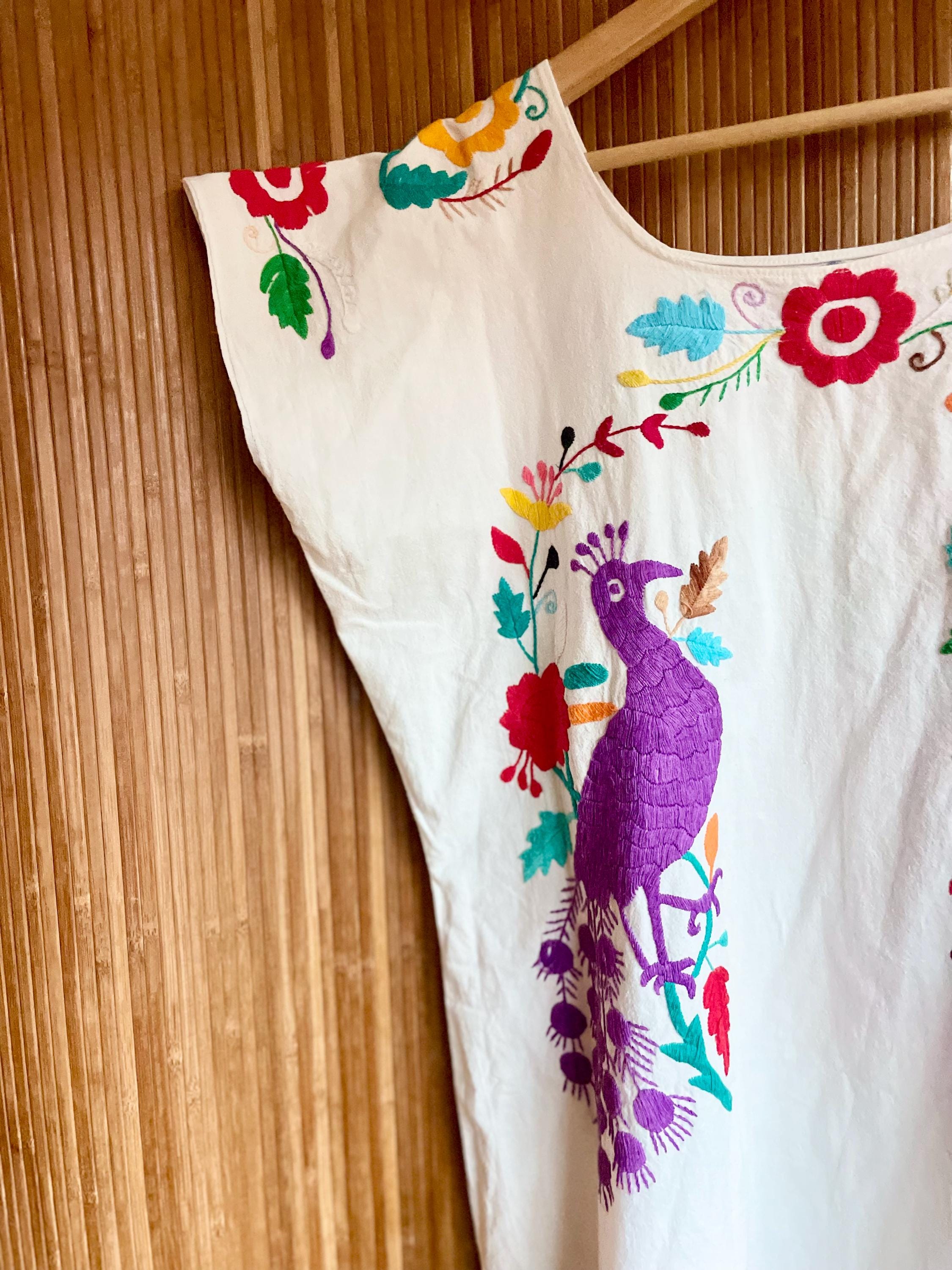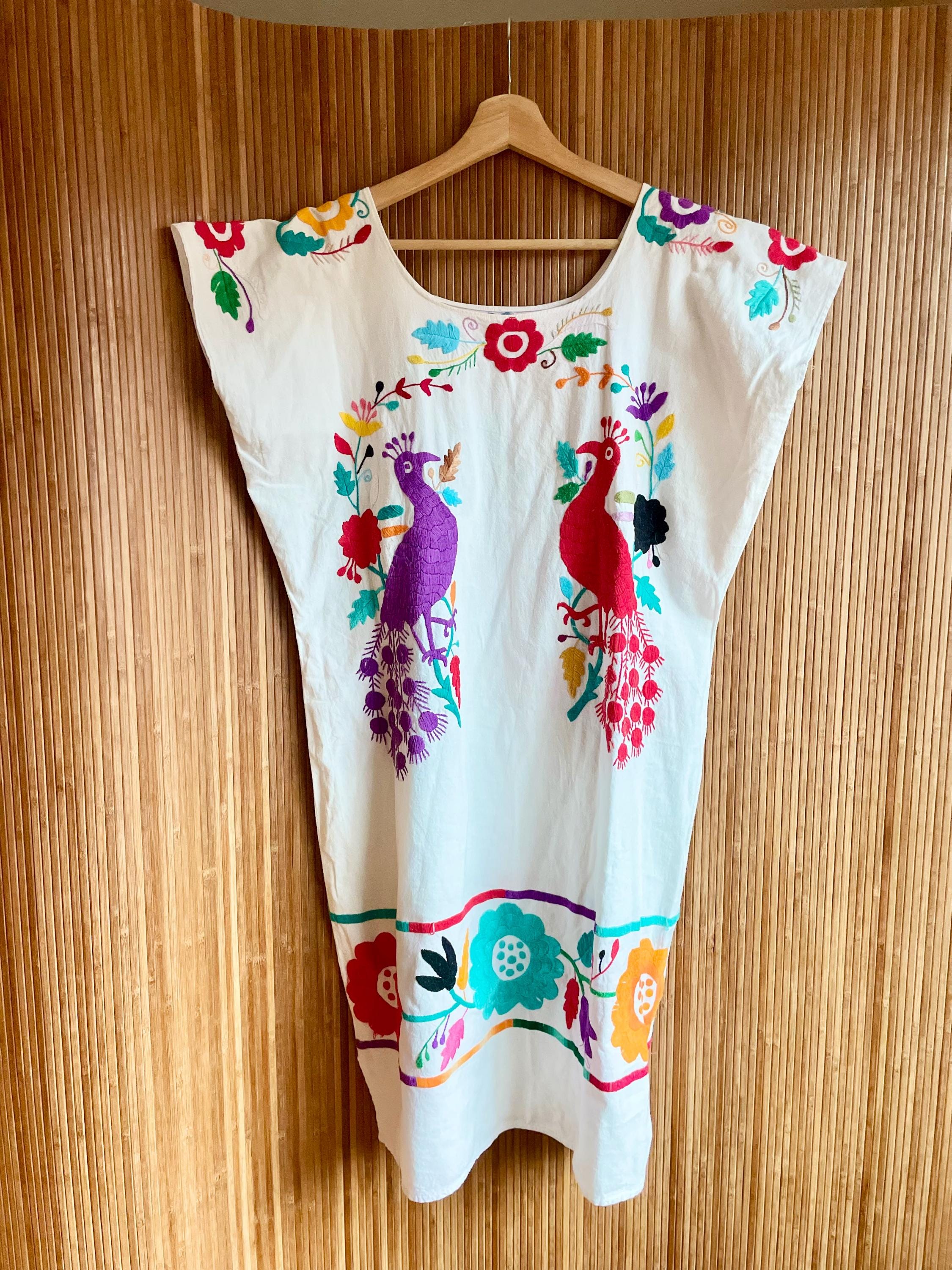 Bright white vintage Mexican kaftan with bold hand embroidery — colorful peacocks and floral borders. Lightweight cotton, relaxed boho maxi perfect for beach, festival, or everyday.