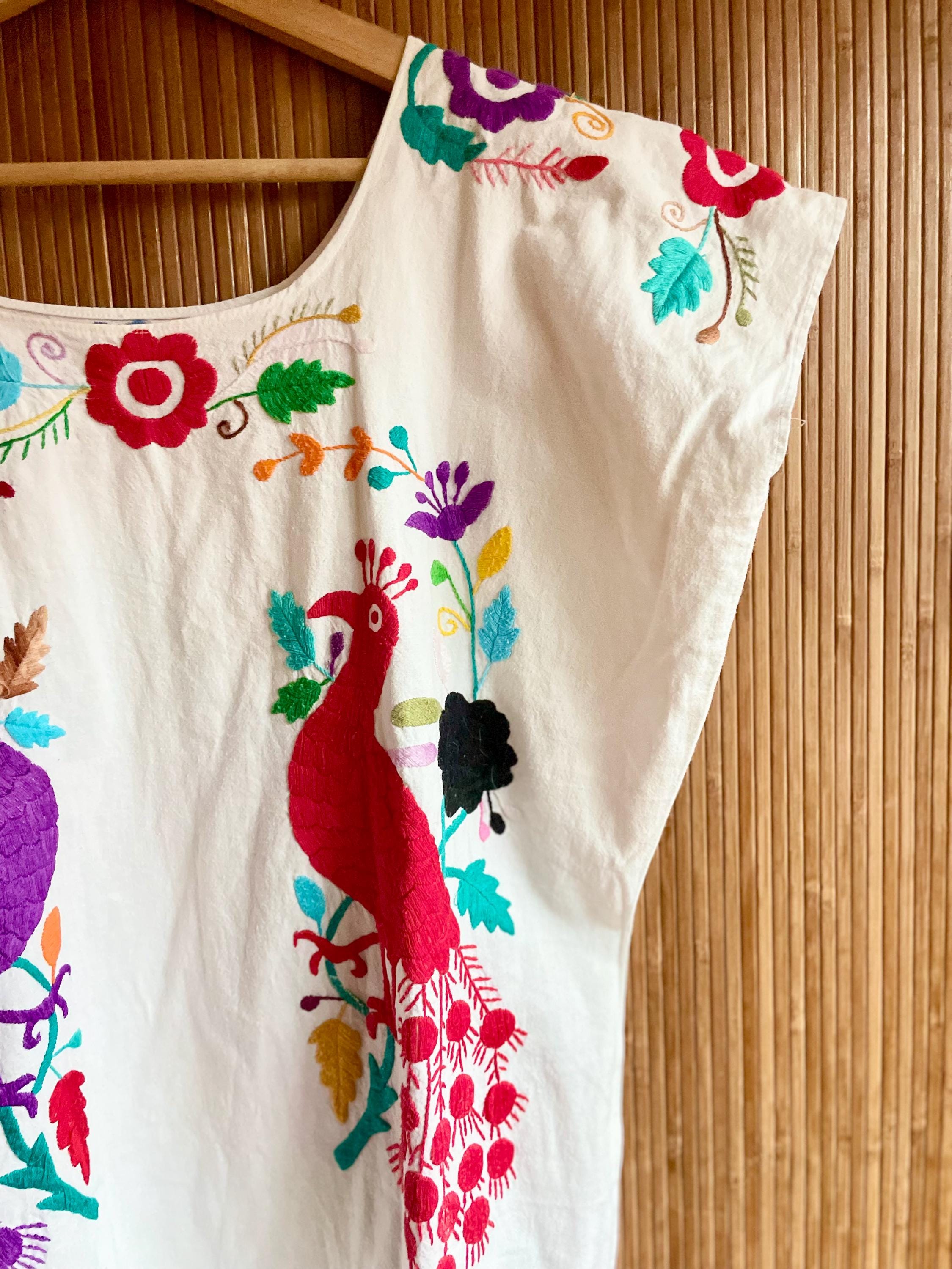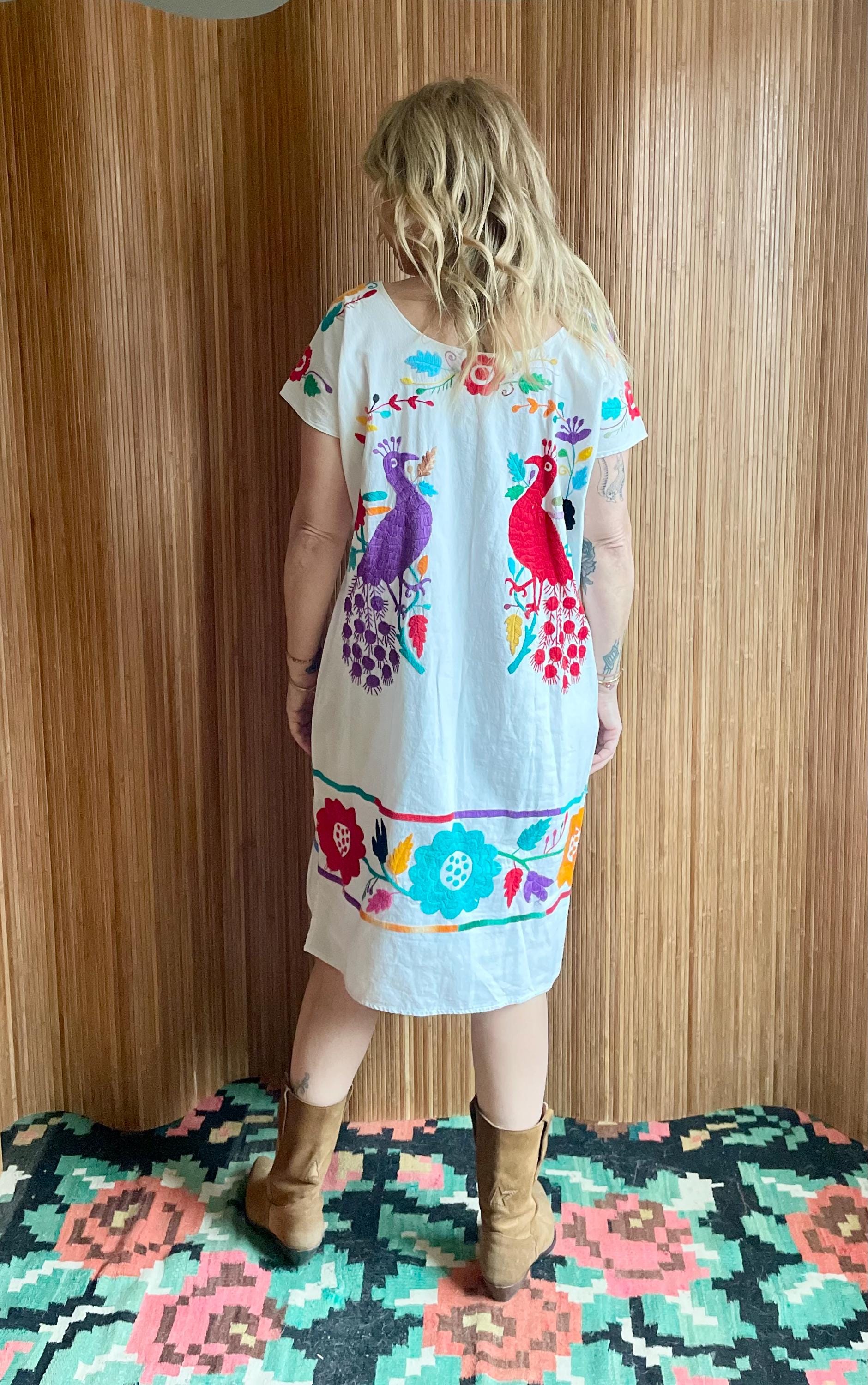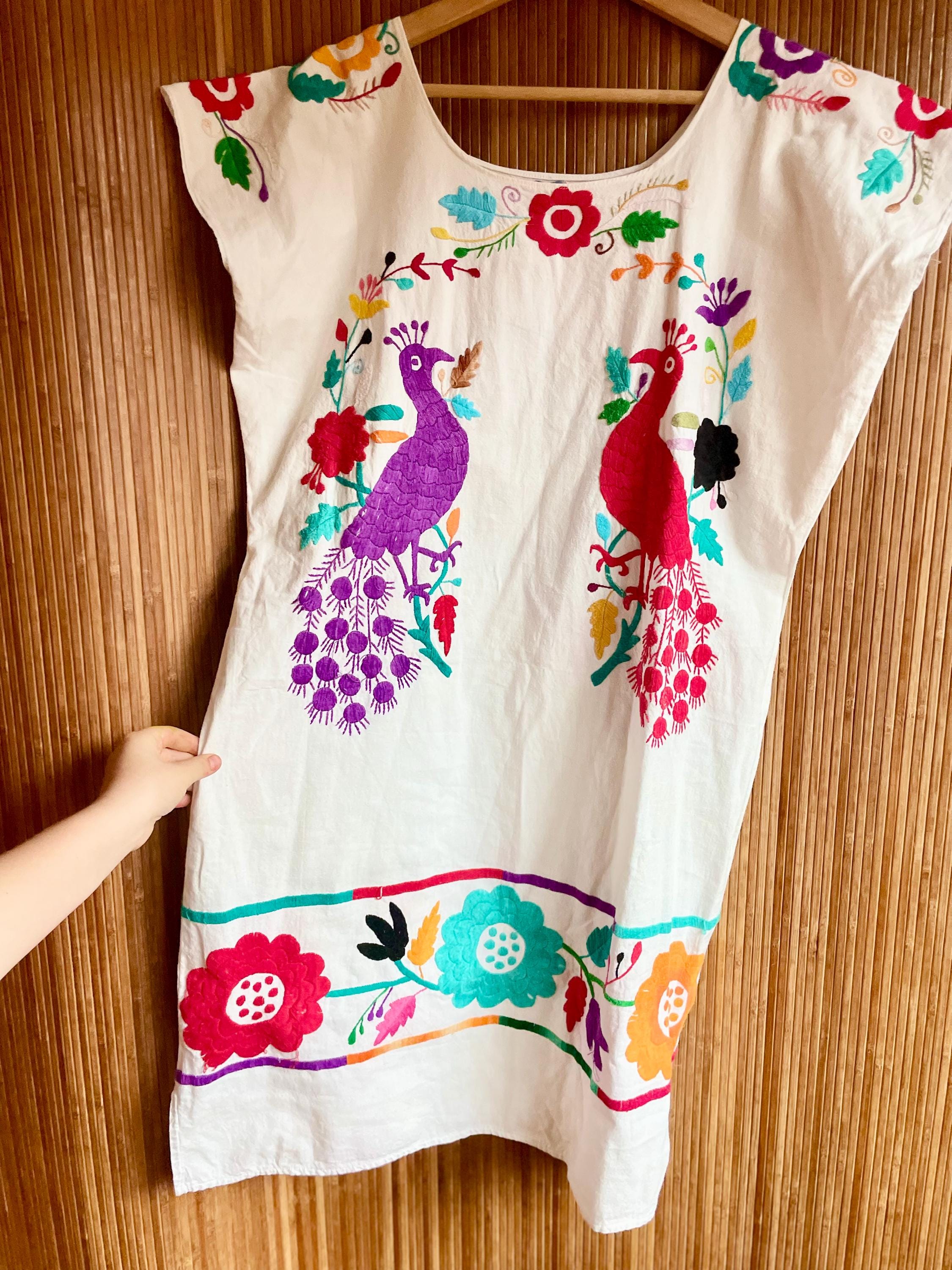 Bright white vintage Mexican kaftan with bold hand embroidery — colorful peacocks and floral borders. Lightweight cotton, relaxed boho maxi perfect for beach, festival, or everyday.