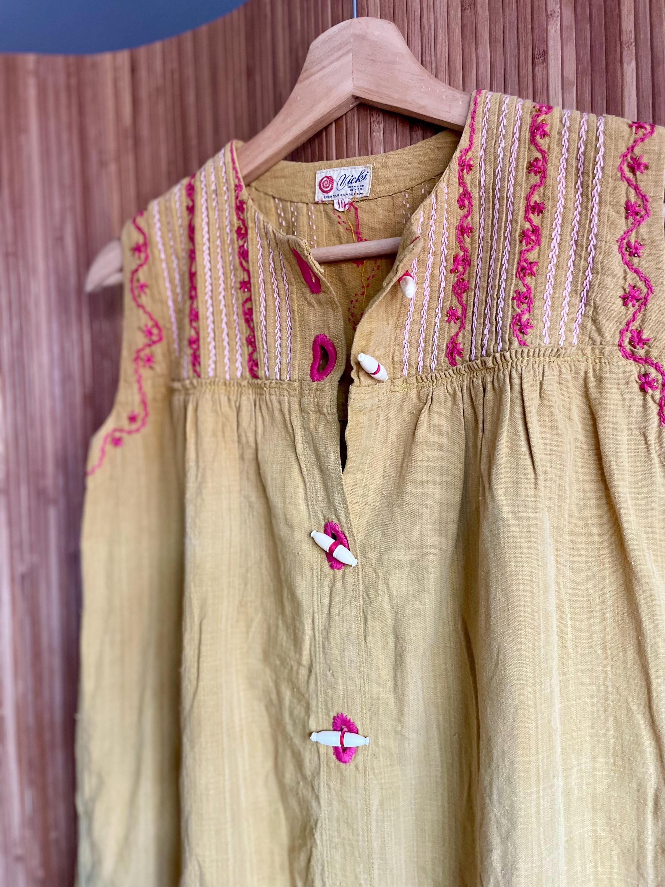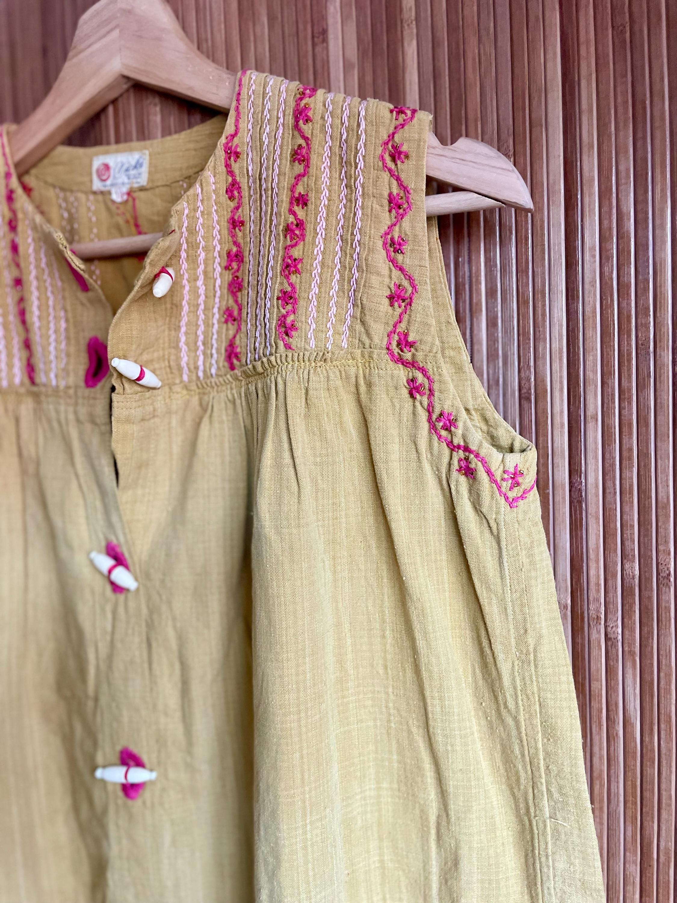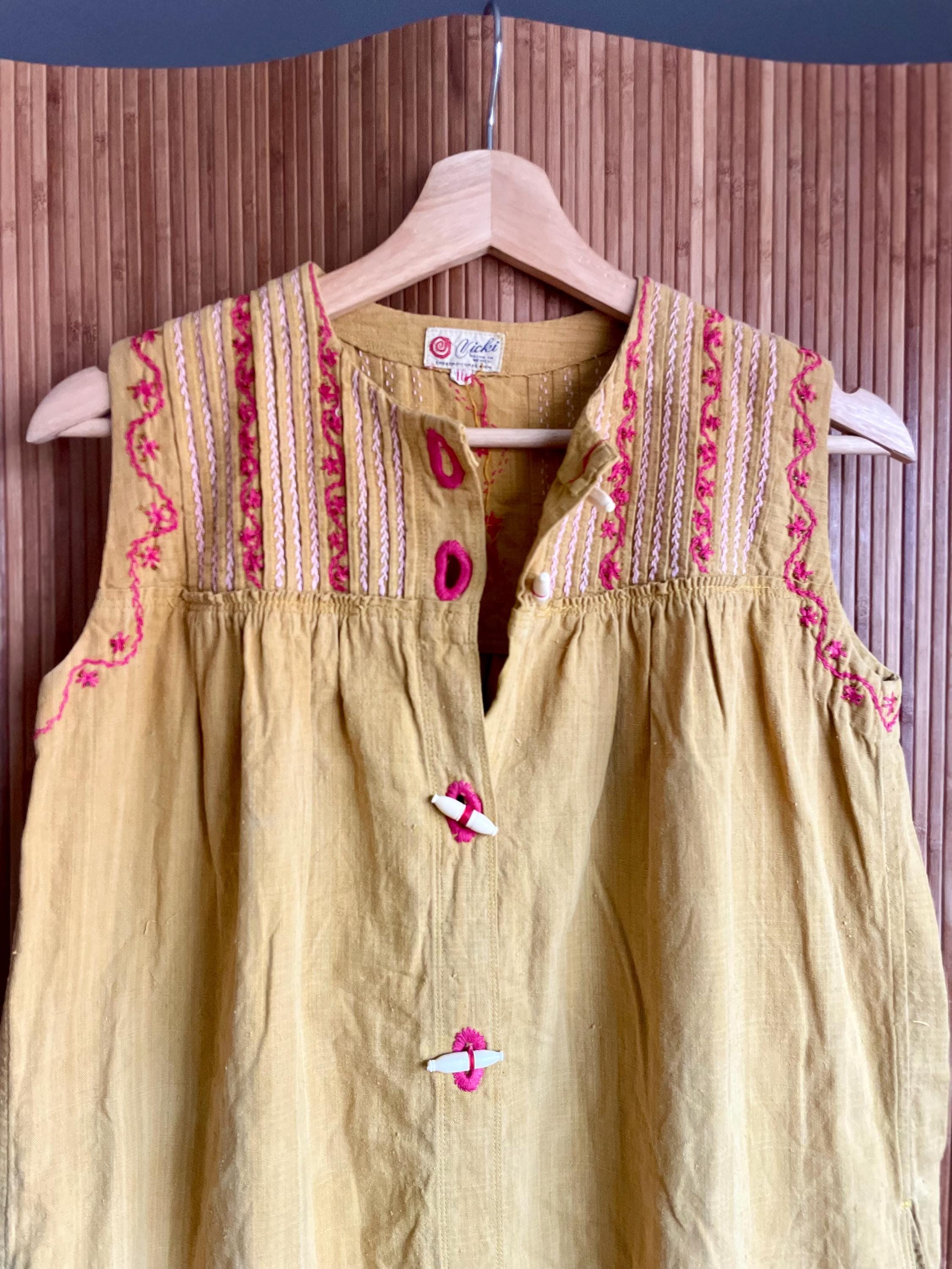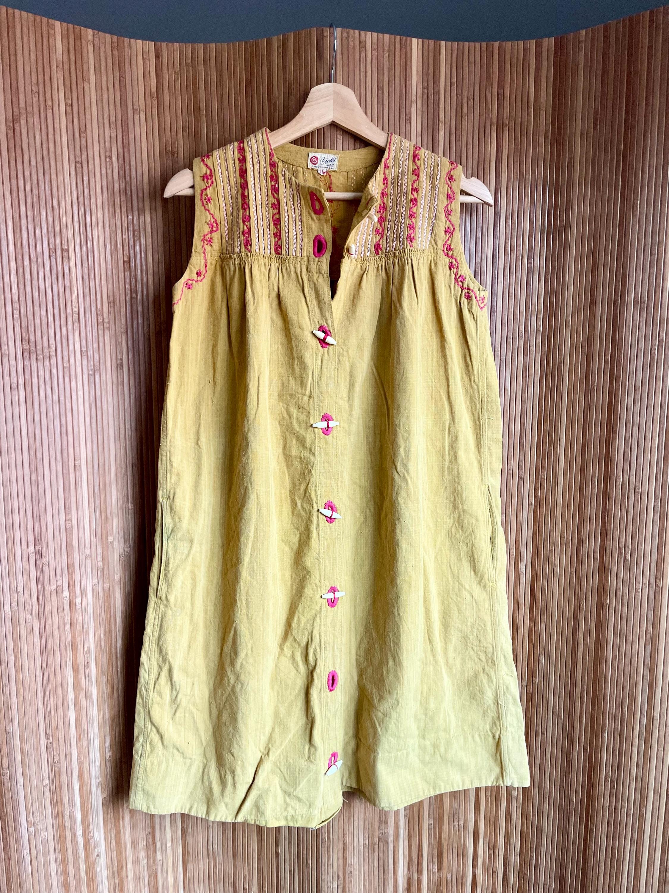 Authentic vintage 1970s sleeveless Mexican embroidered dress — a rare, lightweight sundress with a hand‑stitched yoke and playful toggle closures. The warm mustard/olive ground is accented with pink embroidery along the yoke and armholes; gathered waist gives a relaxed A‑line silhouette. Perfect for summer, festivals, or layered with sweaters and boots for cooler months.