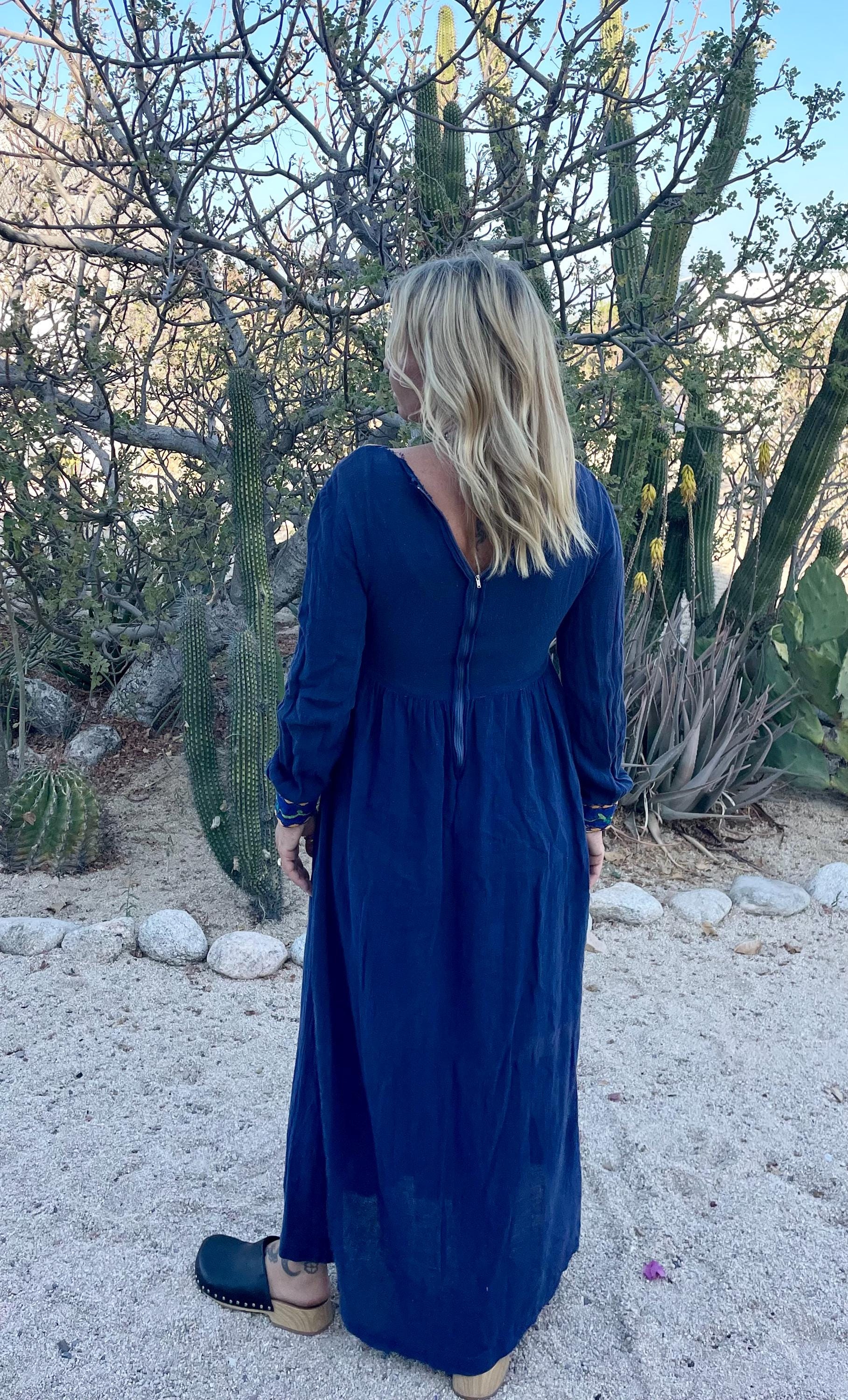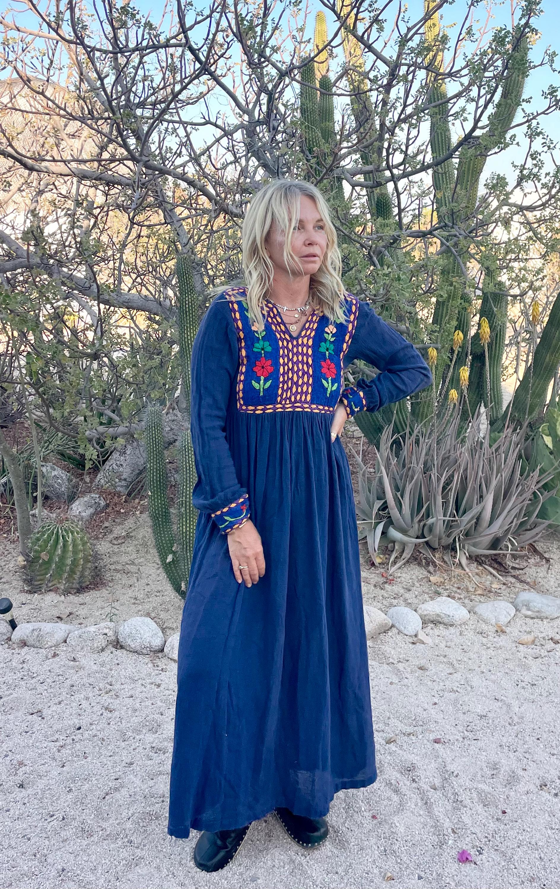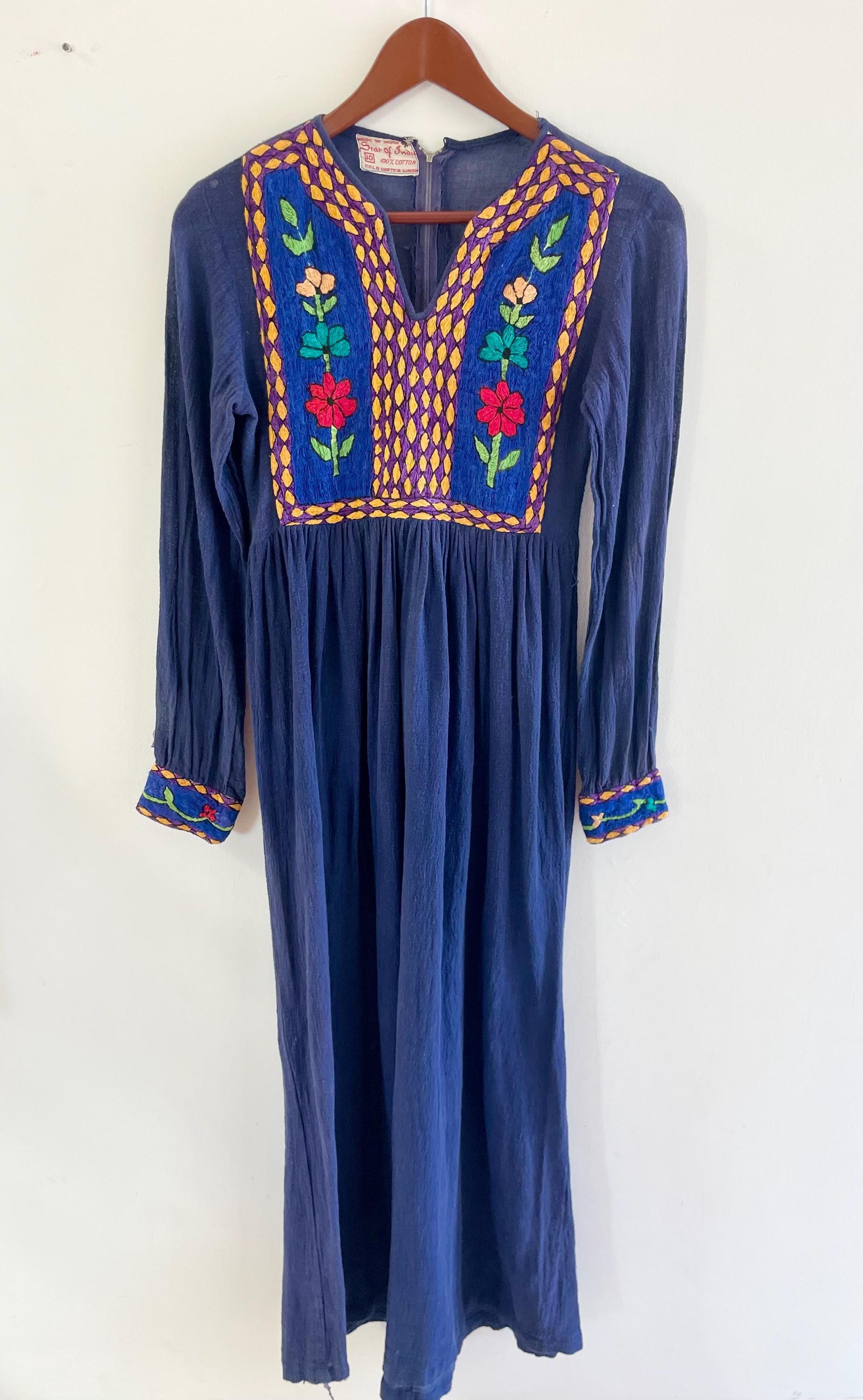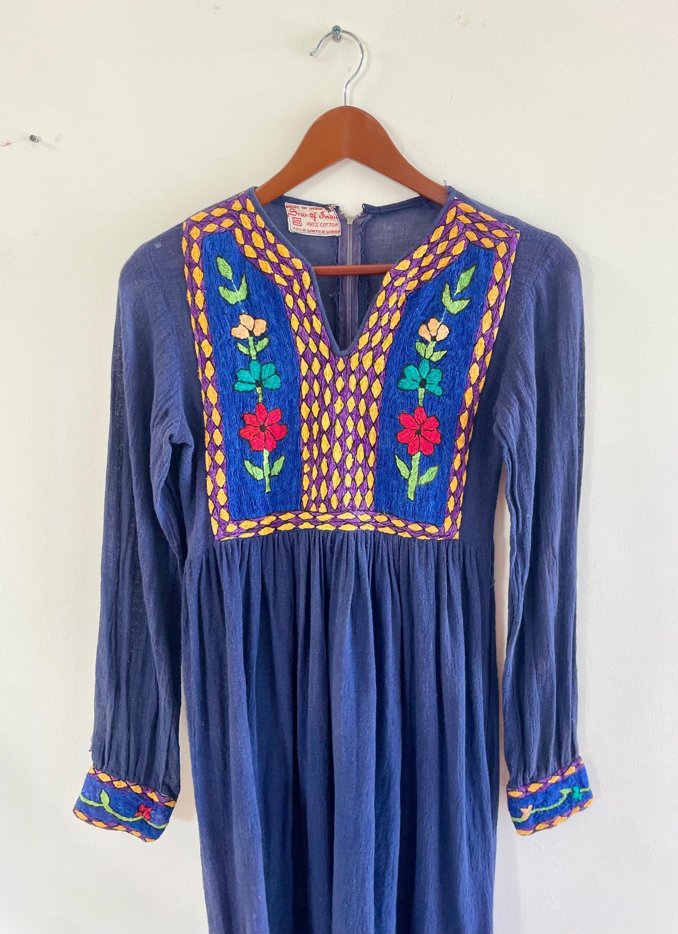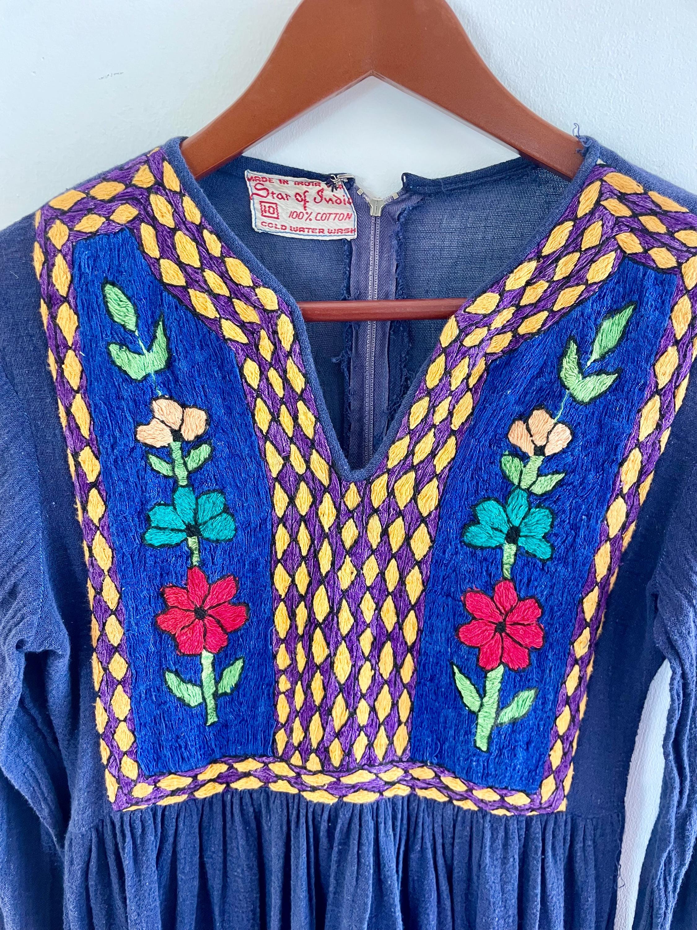 Rare vintage Star of India embroidered cotton gauze dress in deep navy with colorful floral yoke and cuff embroidery. Lightweight, breathable cotton gauze — perfect for collectors or boho styling.