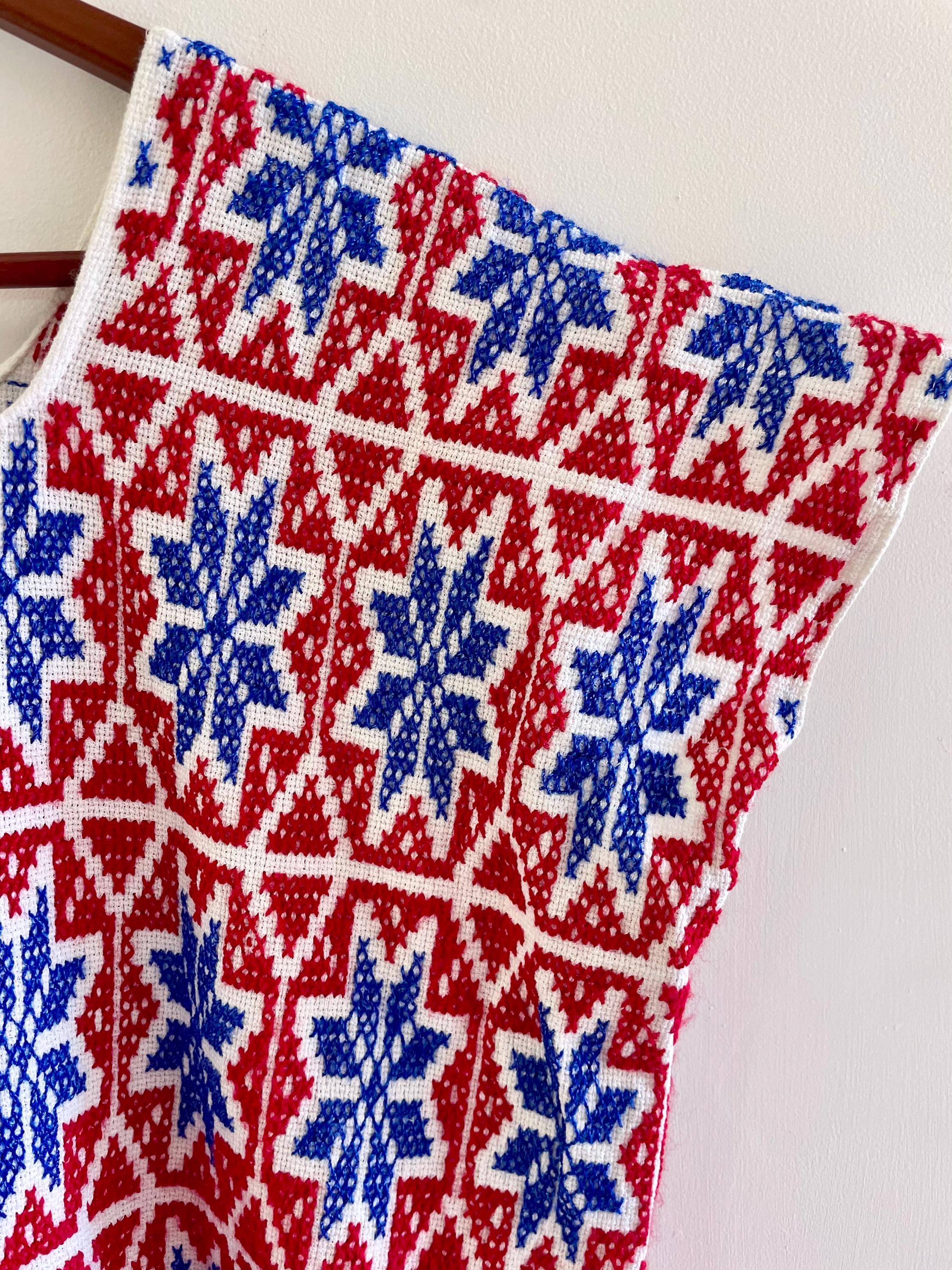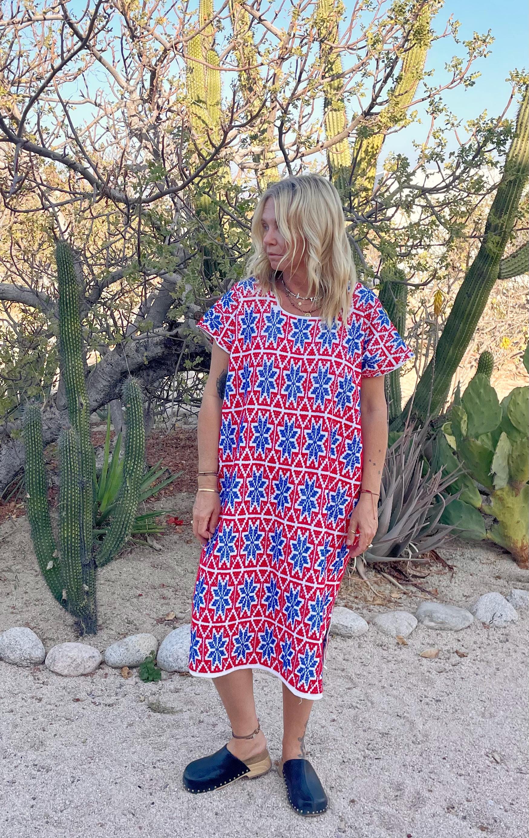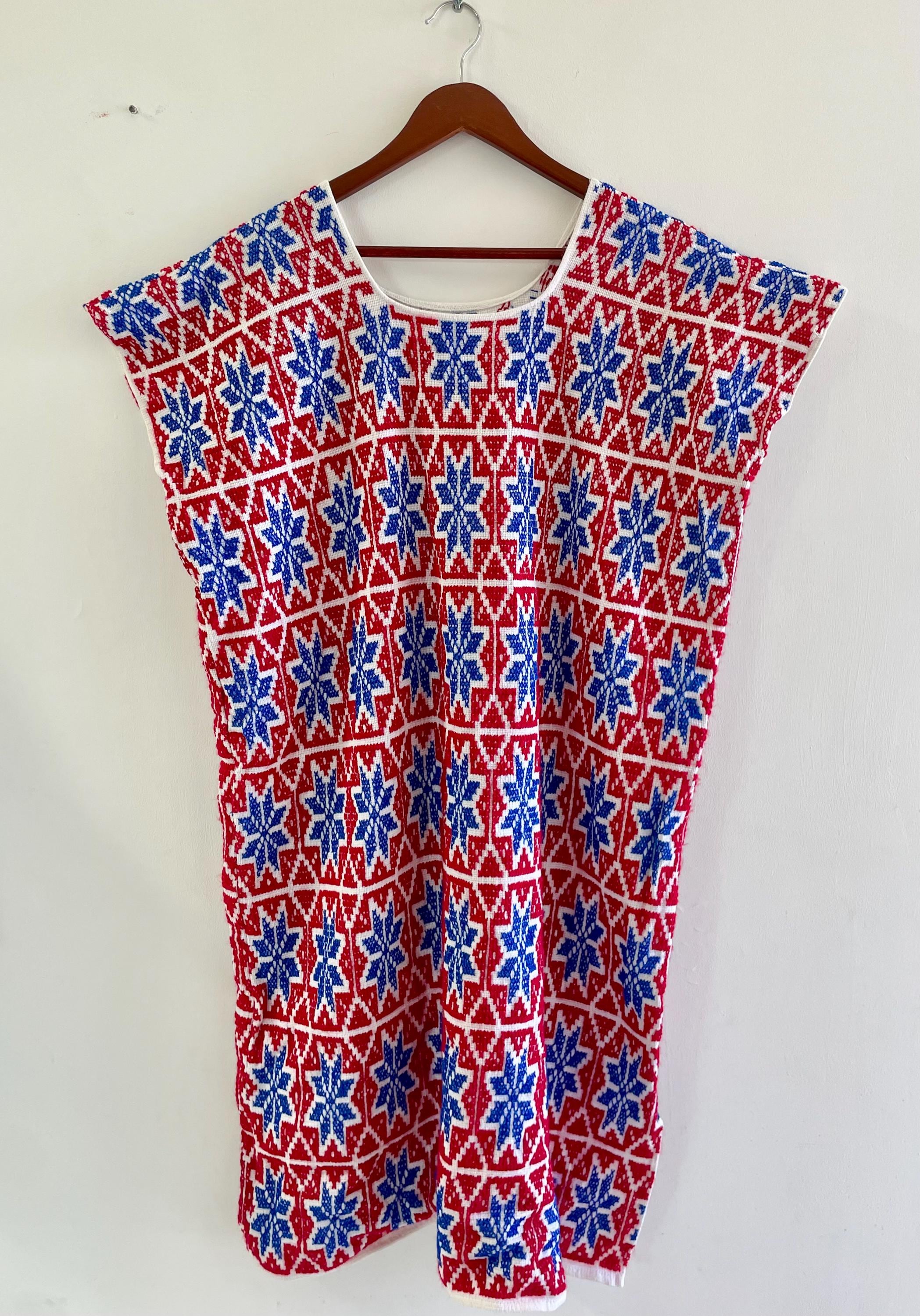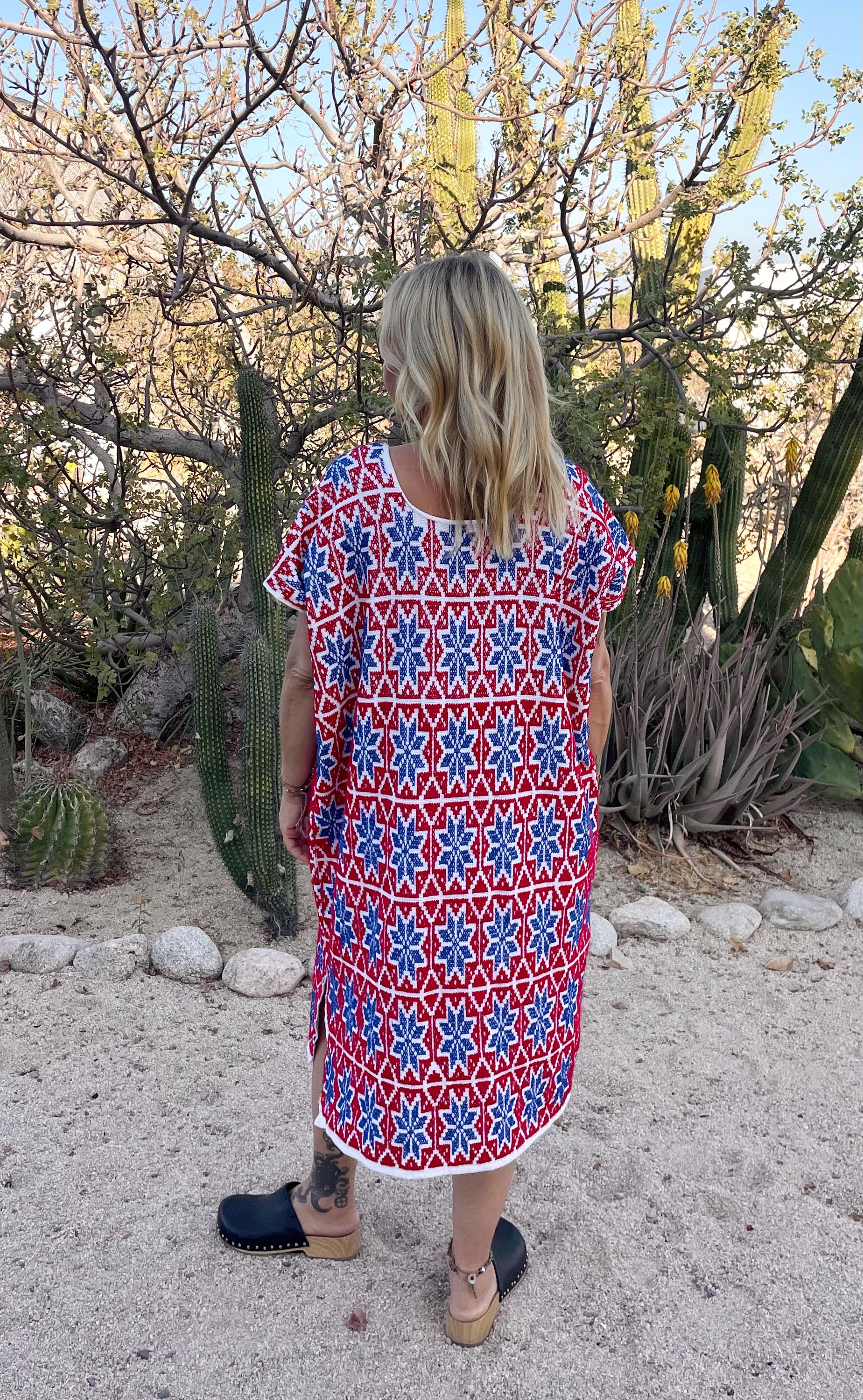Rare vintage Oaxacan fully embroidered kaftan in red, blue and white cross-stitch-style motifs. Lightweight, single-layer textile with dense hand-style embroidery — perfect as a statement tunic, beach cover, or boho layering piece.