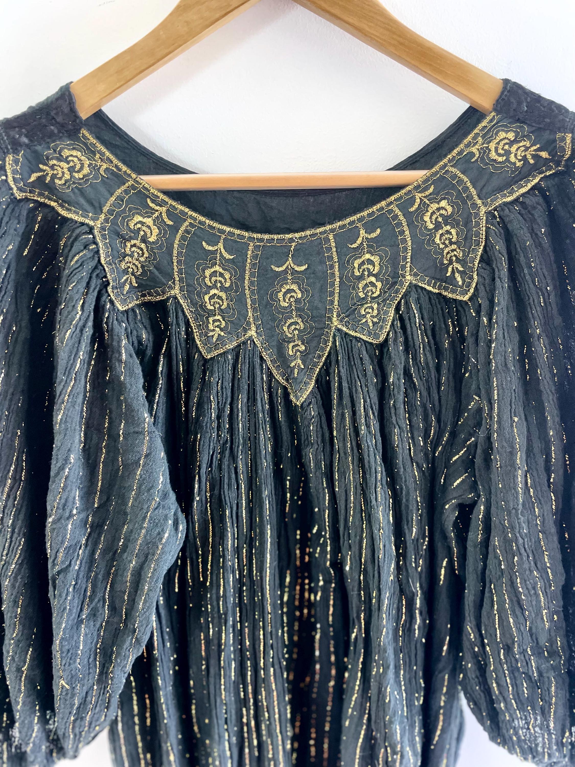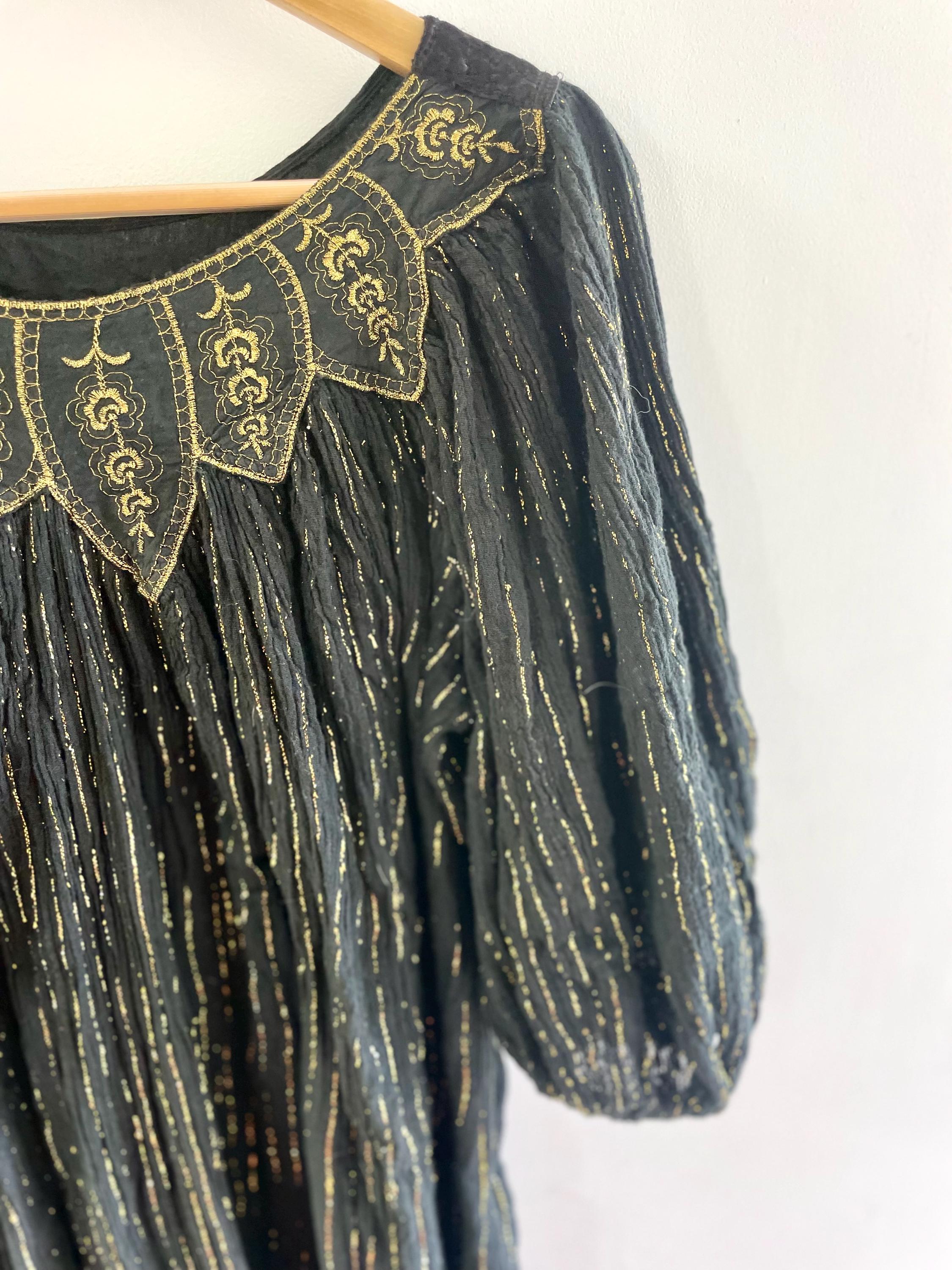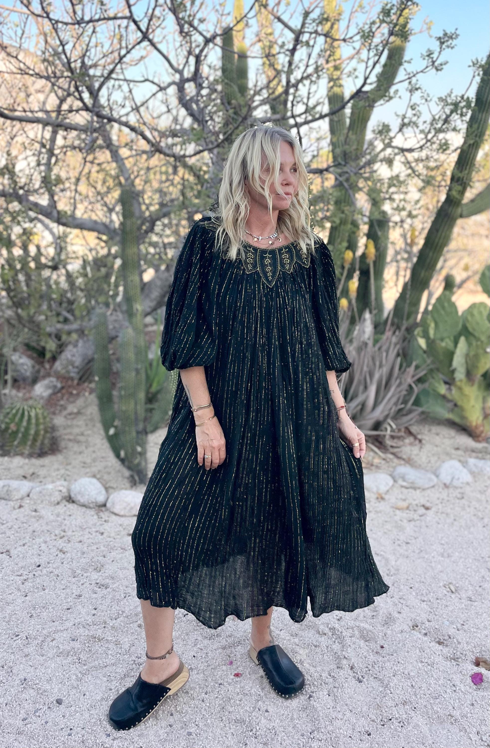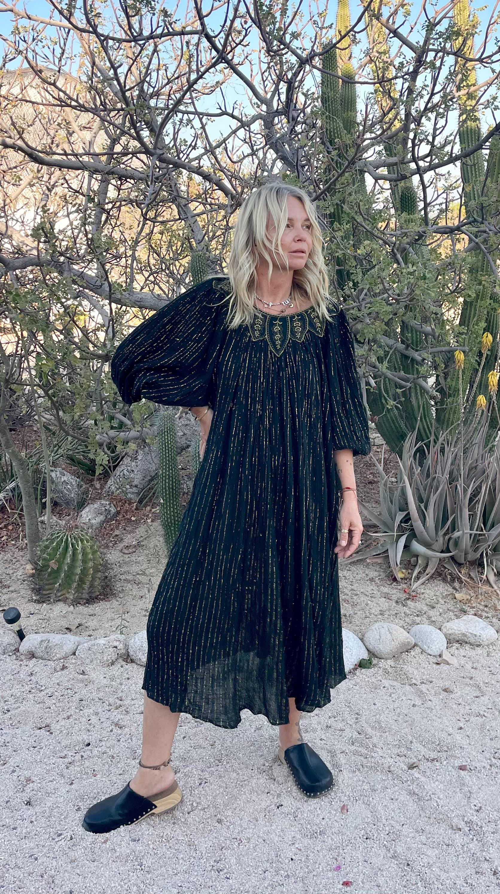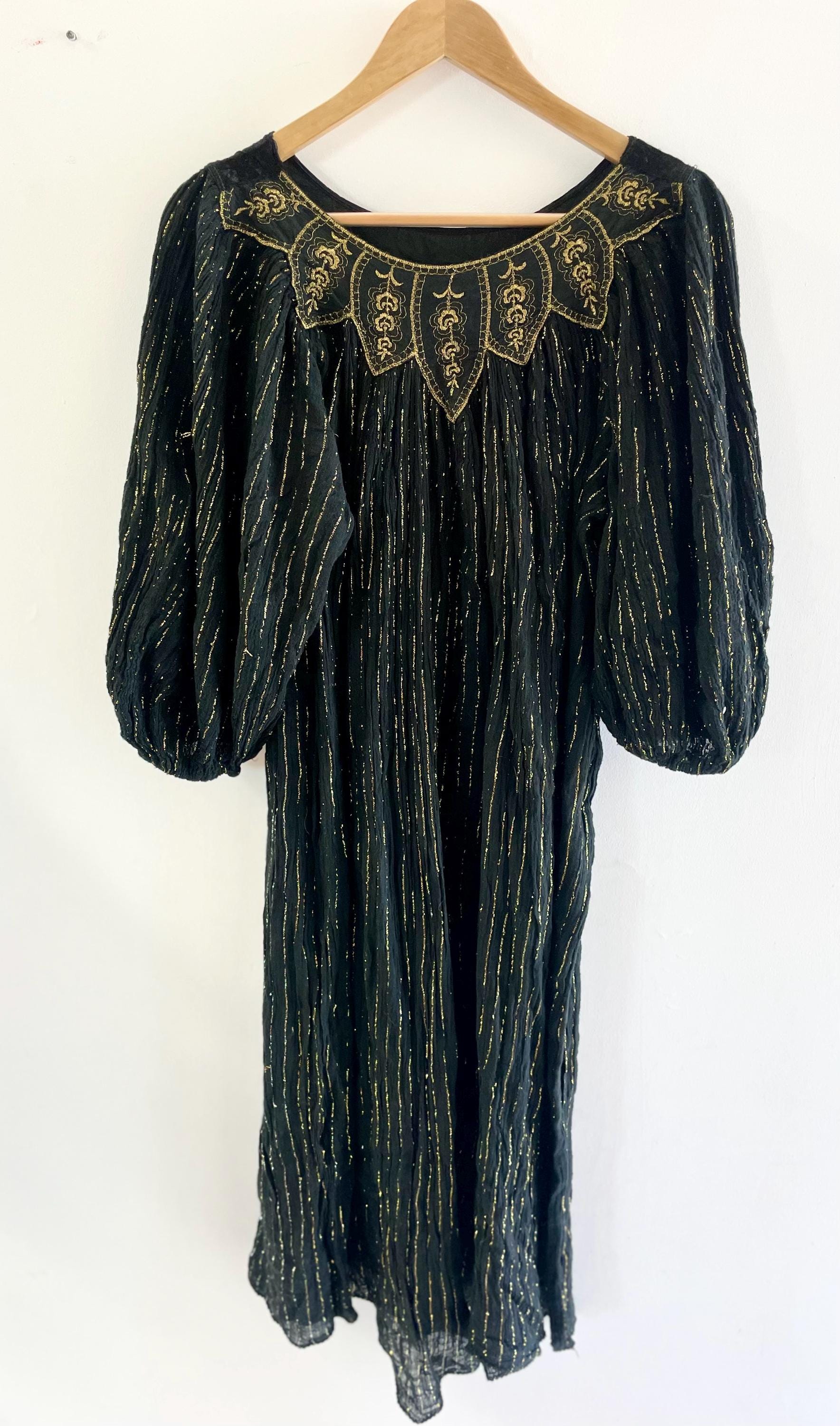 Vintage Grecian-inspired cotton gauze midi dress in black with subtle gold lurex stripes and decorative embroidered yoke. Lightweight, airy, and drapey — ideal for boho styling, evening wear, or layered looks.