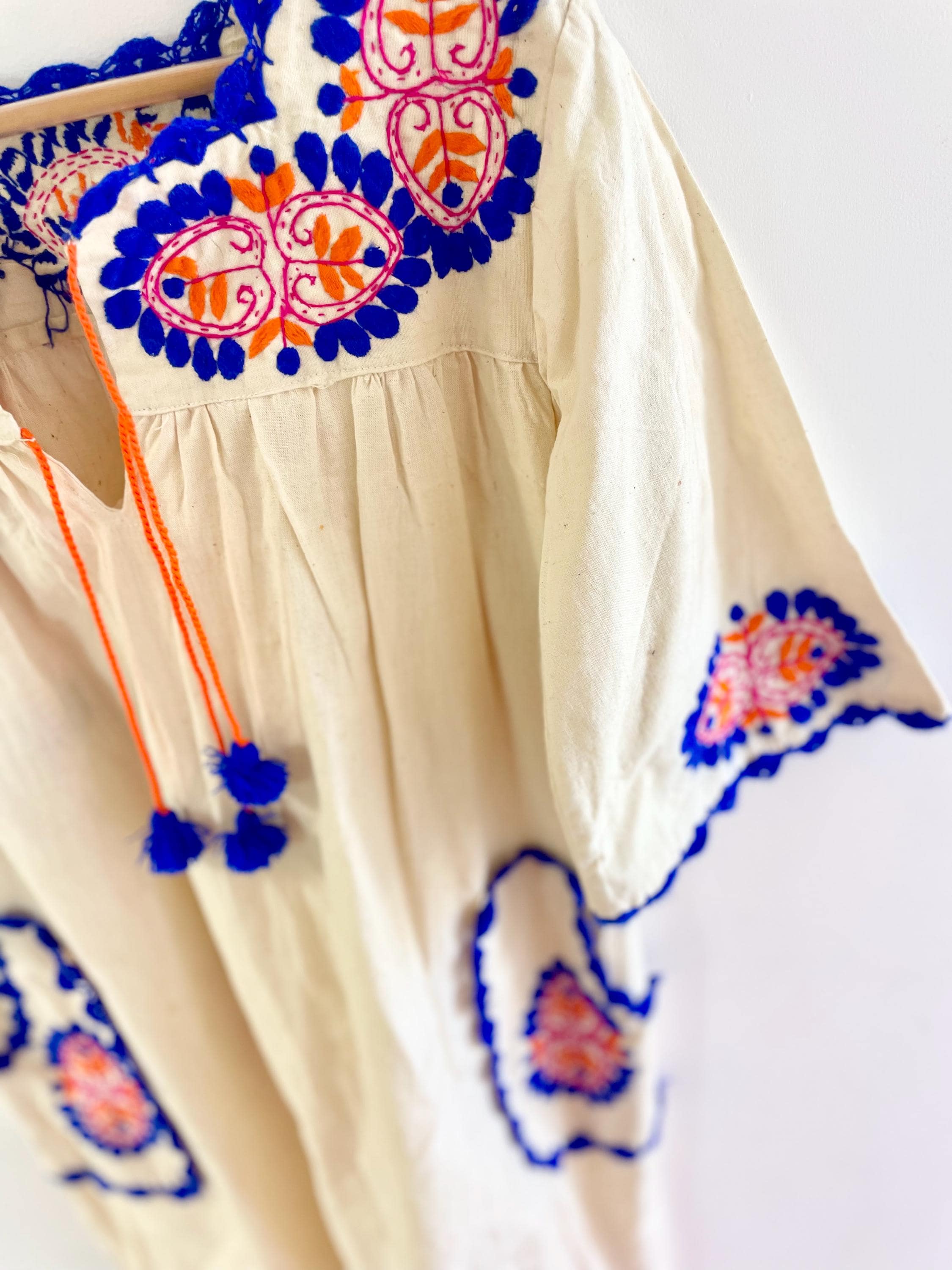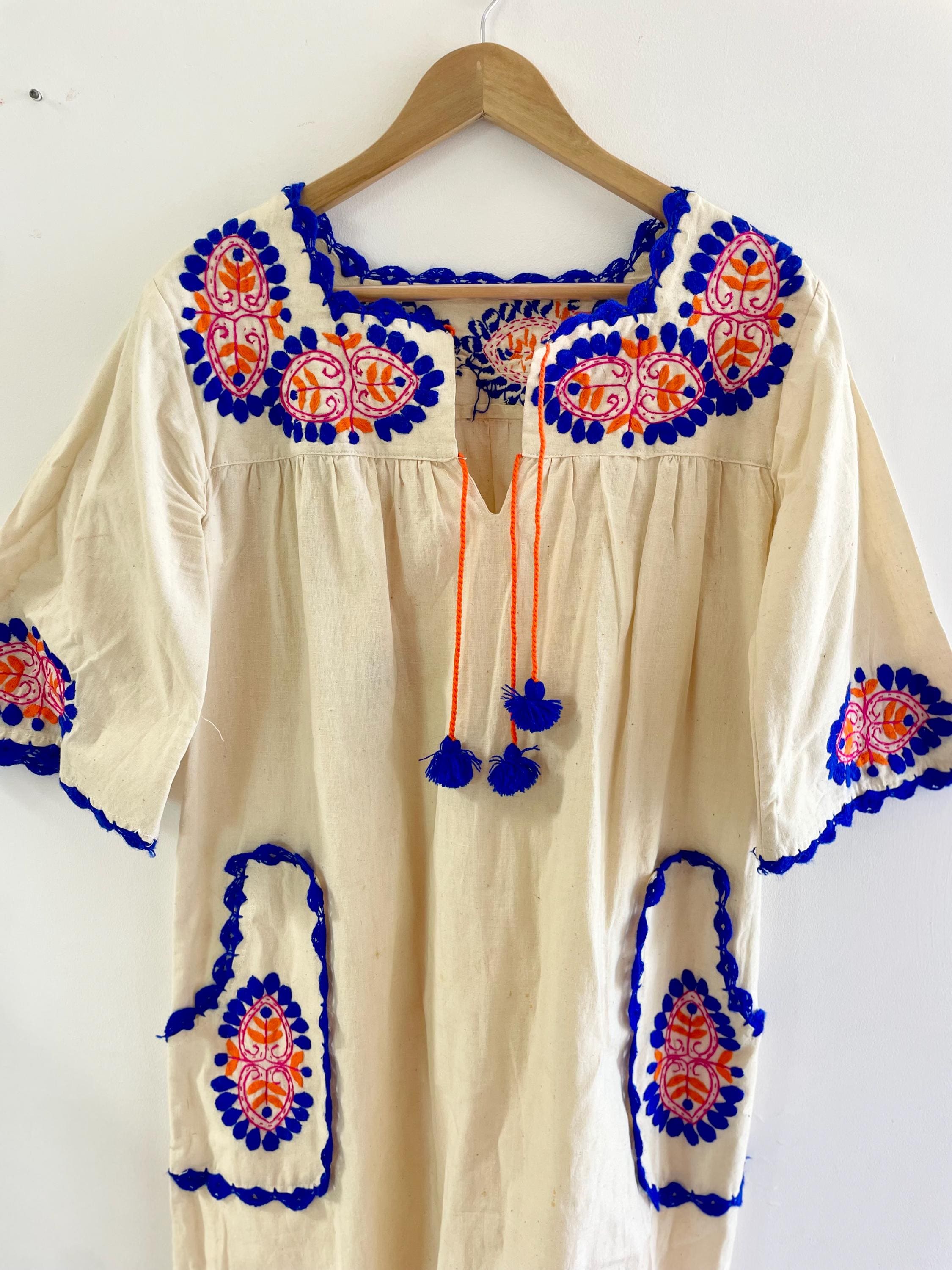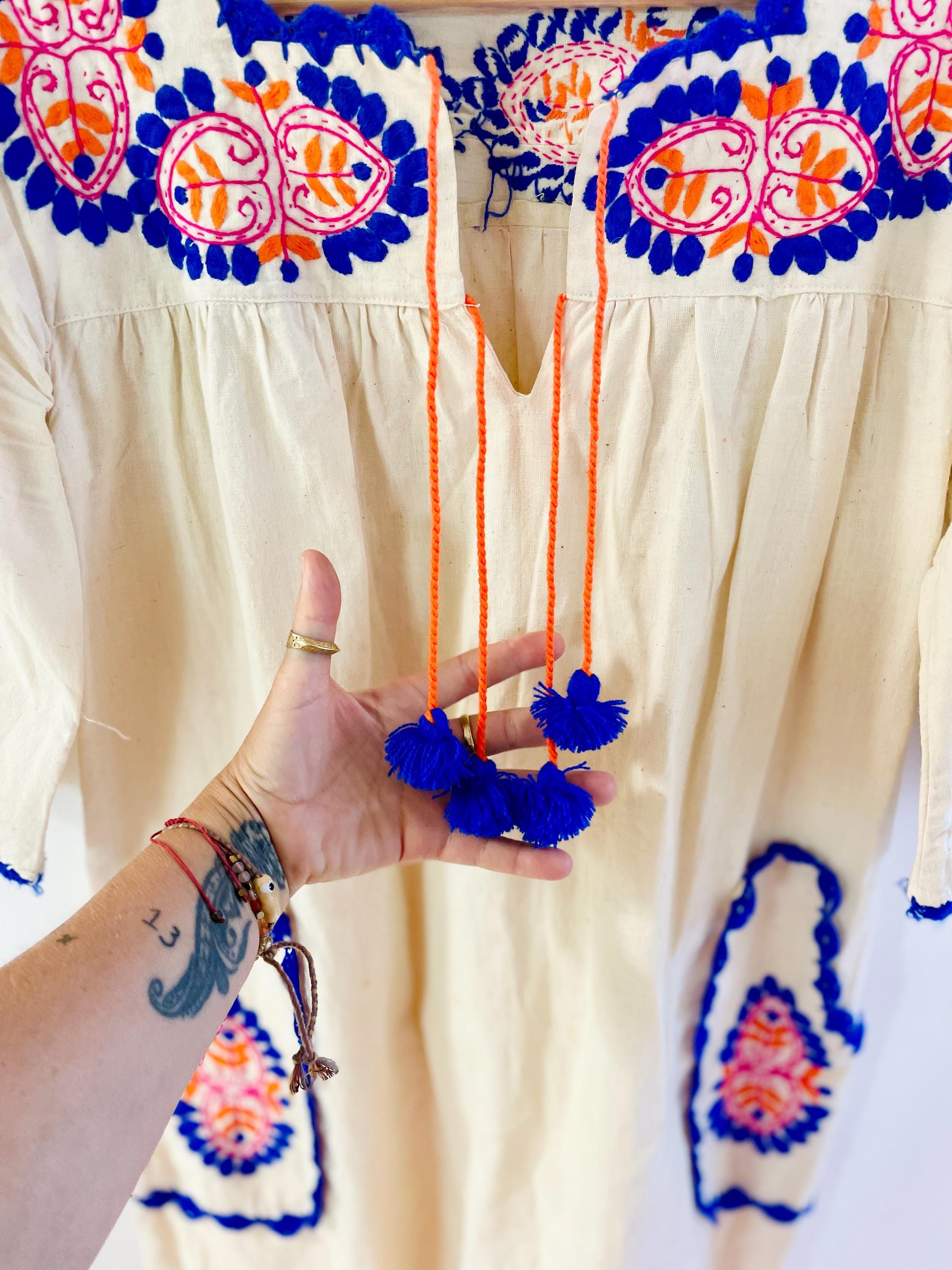 Vintage 1970s hand-embroidered cotton kaftan in cream with vibrant royal blue and orange floral/ethnic embroidery. Relaxed boho silhouette with wide elbow sleeves, two front patch pockets edged in scallop trim, and tasseled tie at the neckline.