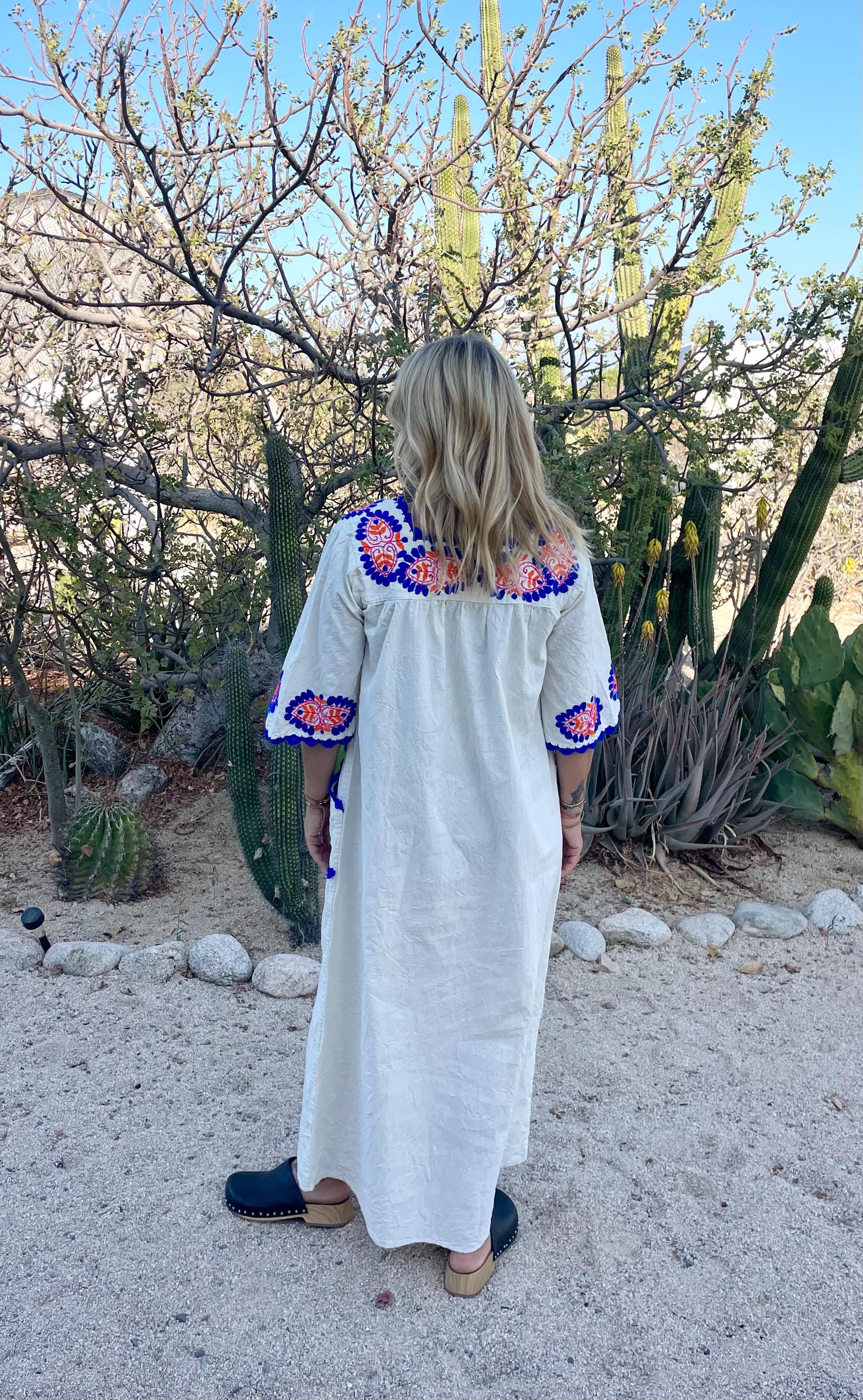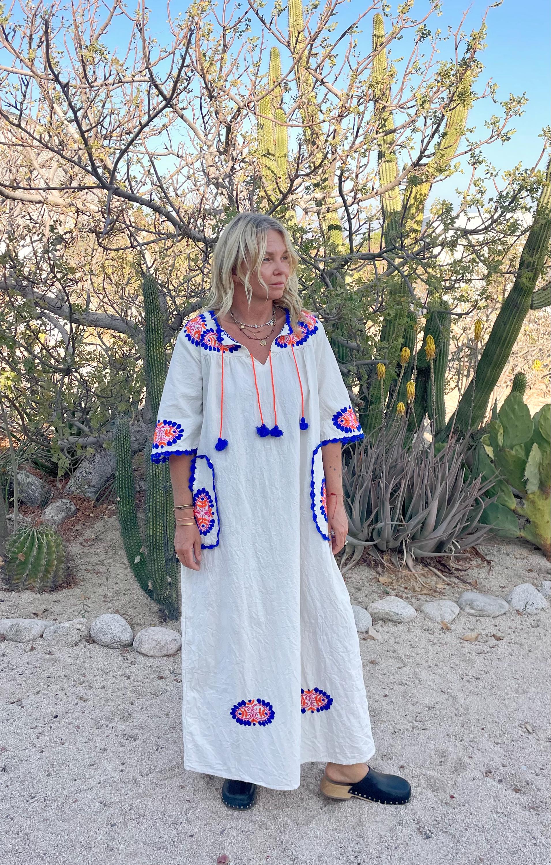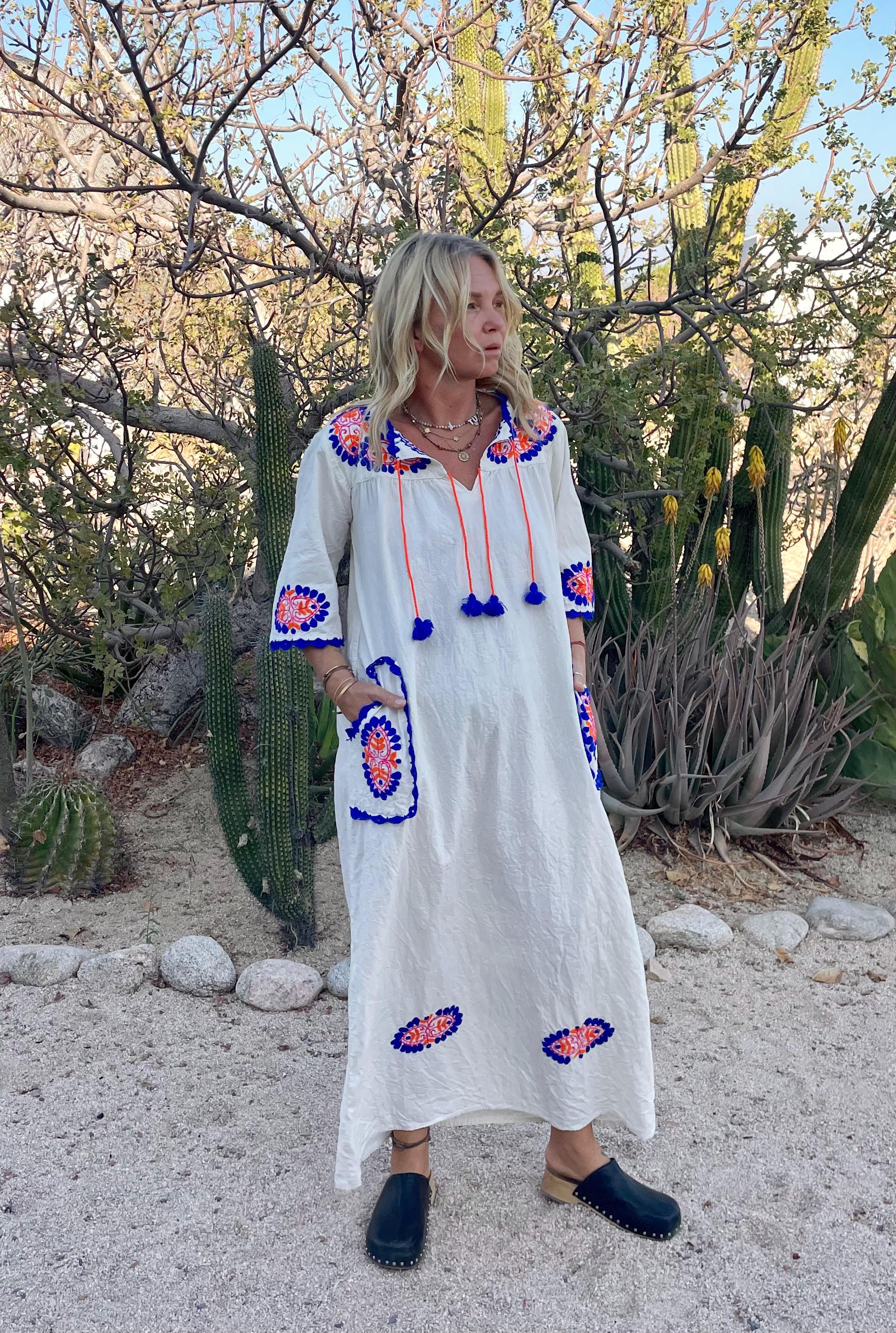Vintage 1970s hand-embroidered cotton kaftan in cream with vibrant royal blue and orange floral/ethnic embroidery. Relaxed boho silhouette with wide elbow sleeves, two front patch pockets edged in scallop trim, and tasseled tie at the neckline.
