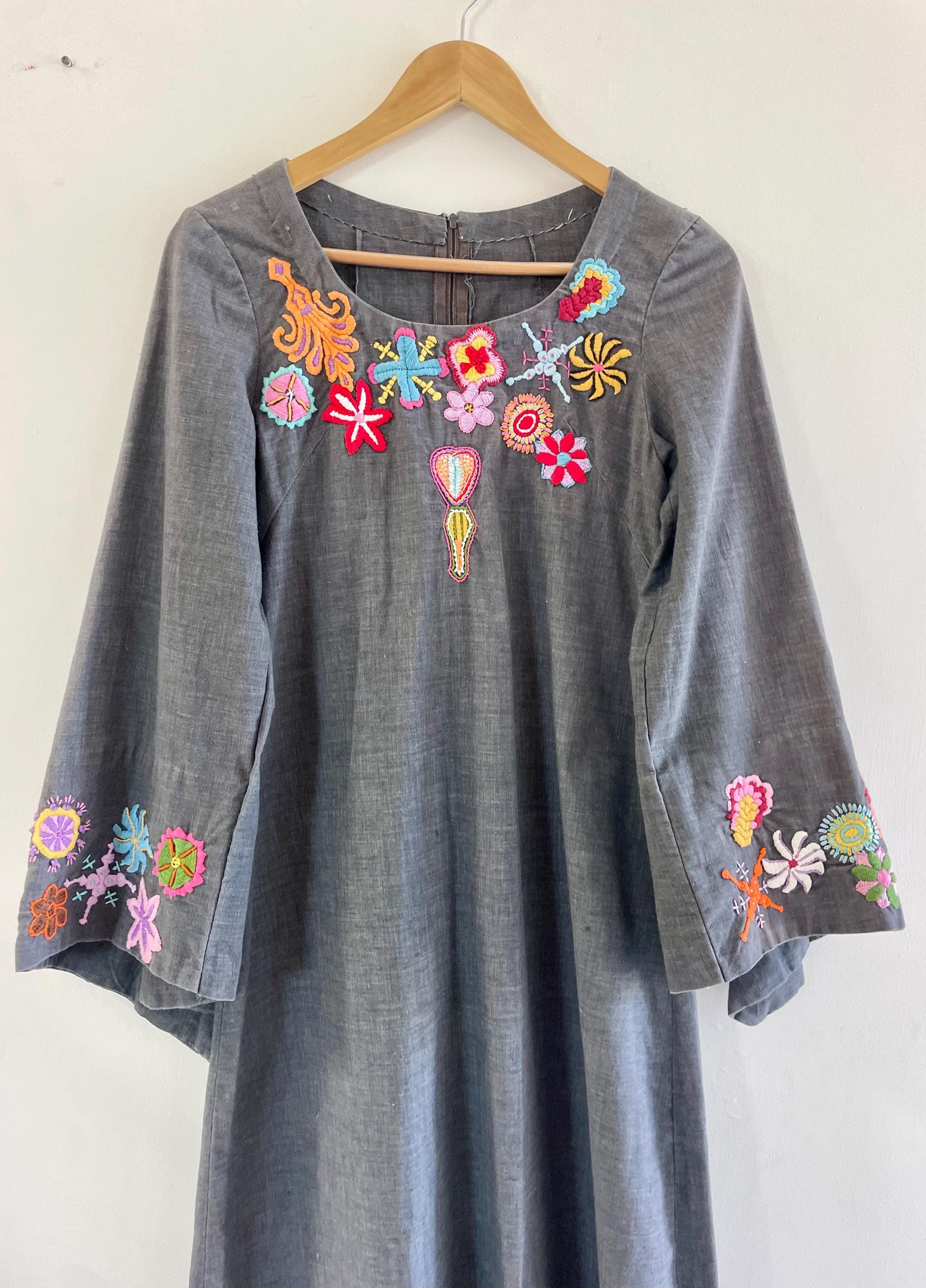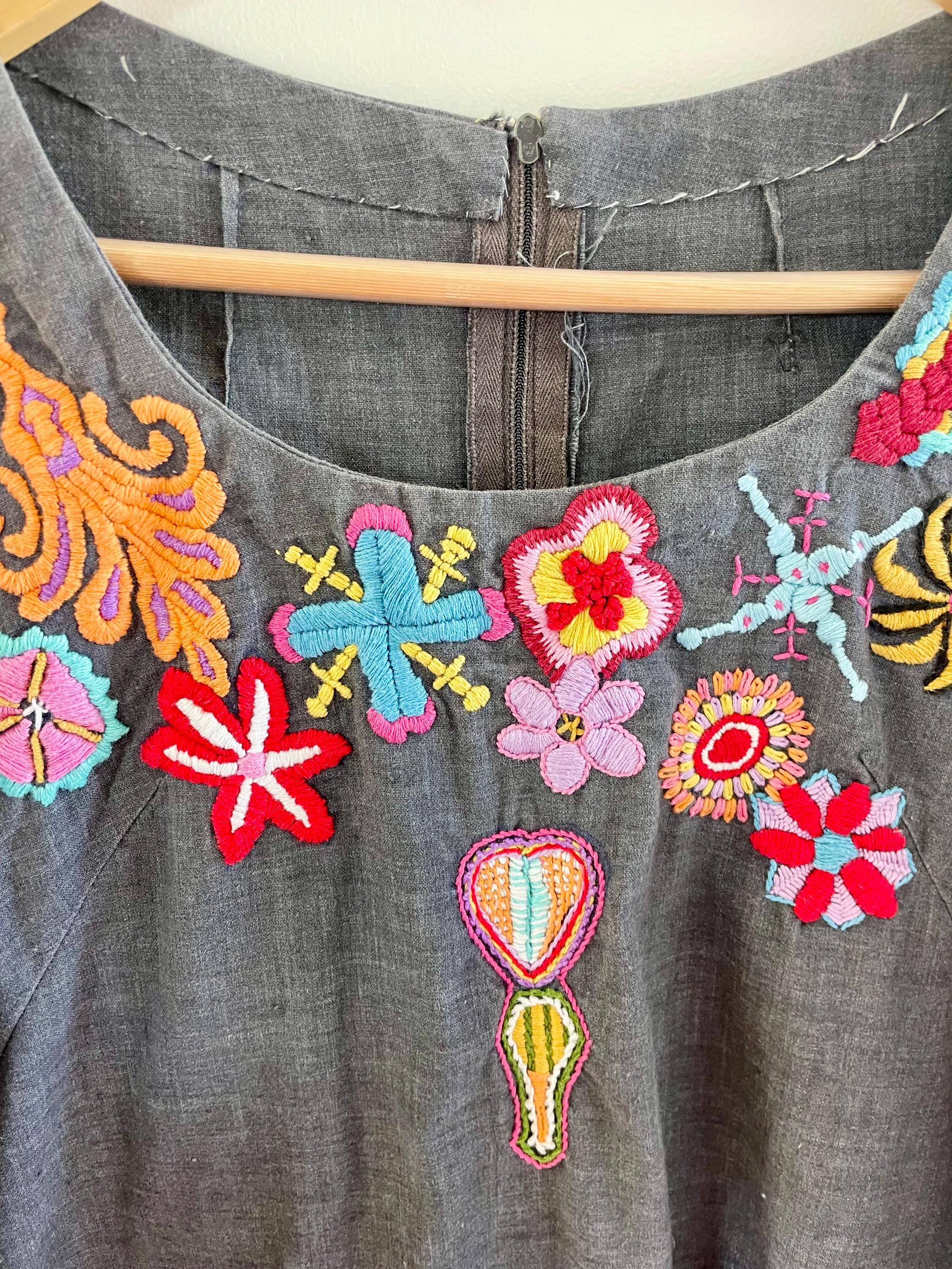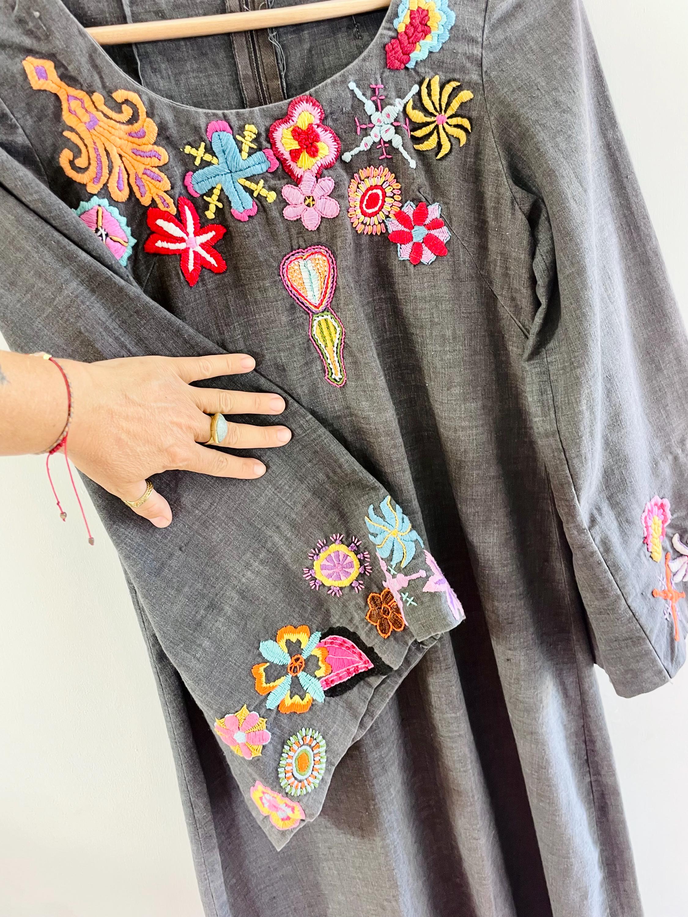 Authentic vintage 1970s hand‑embroidered cotton kaftan in a slate gray with bright multicolor floral embroidery across the neckline and cuffs. Lightweight woven cotton with a flowing A-line silhouette, split back zipper, and bell sleeves.