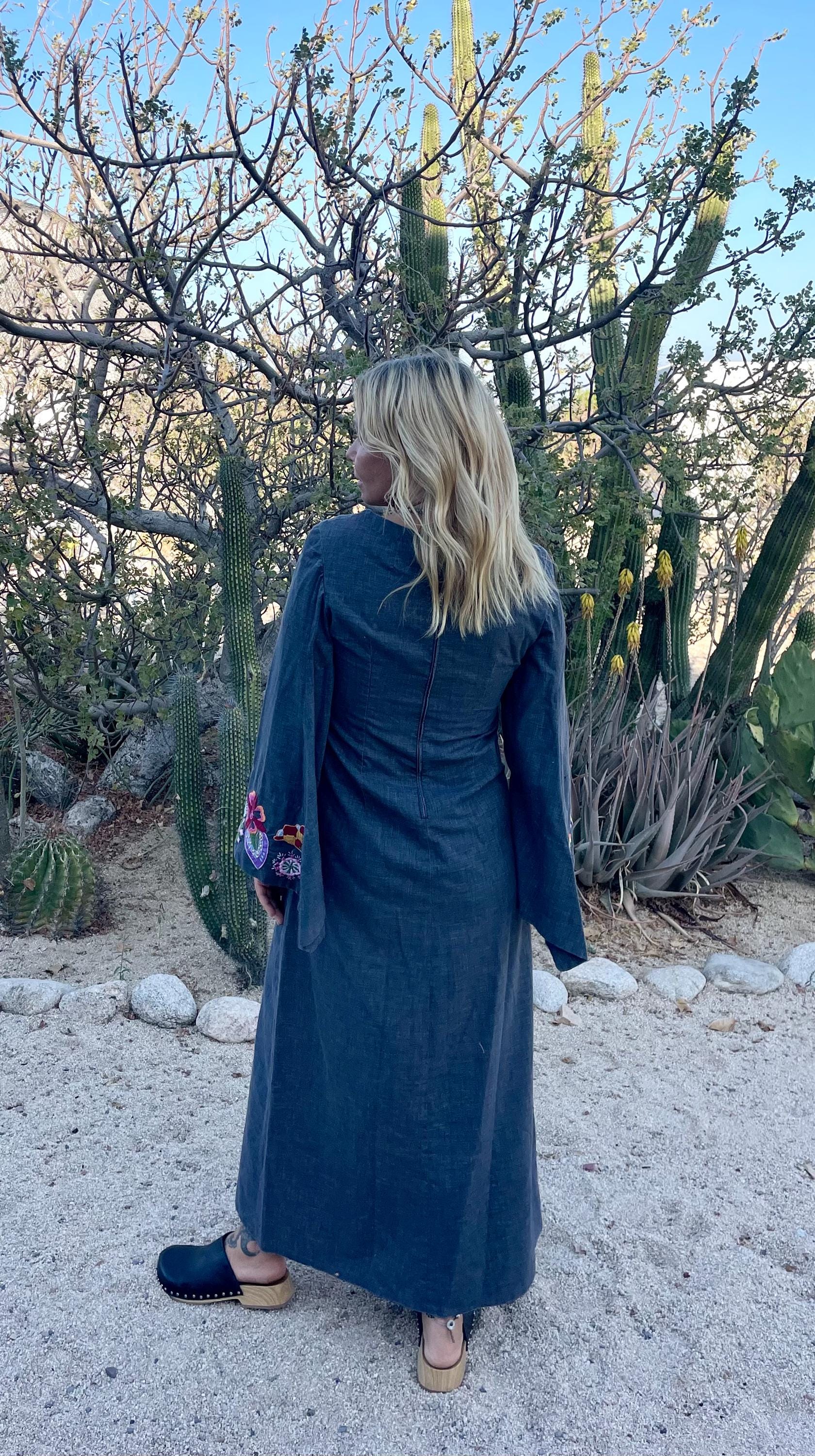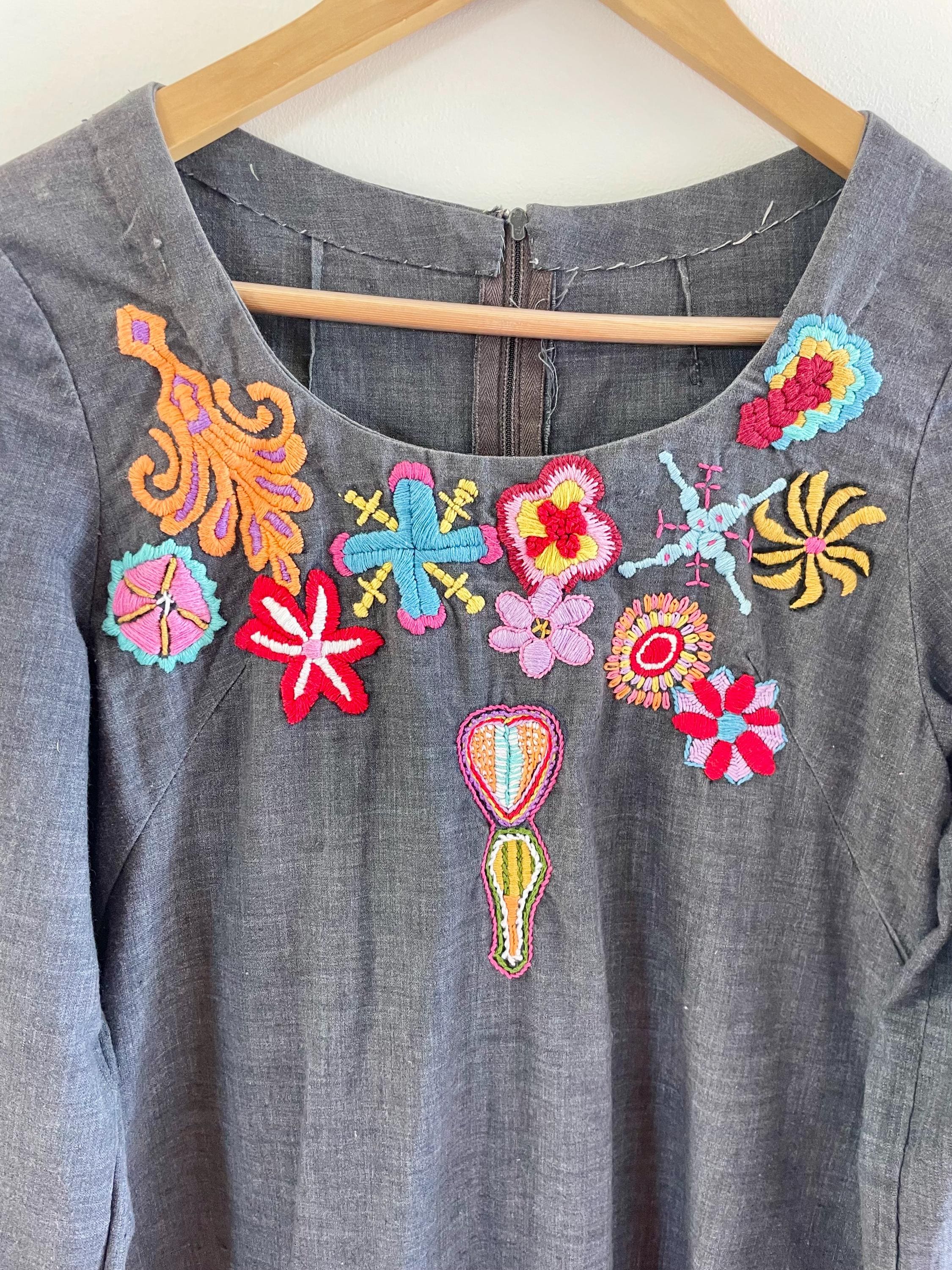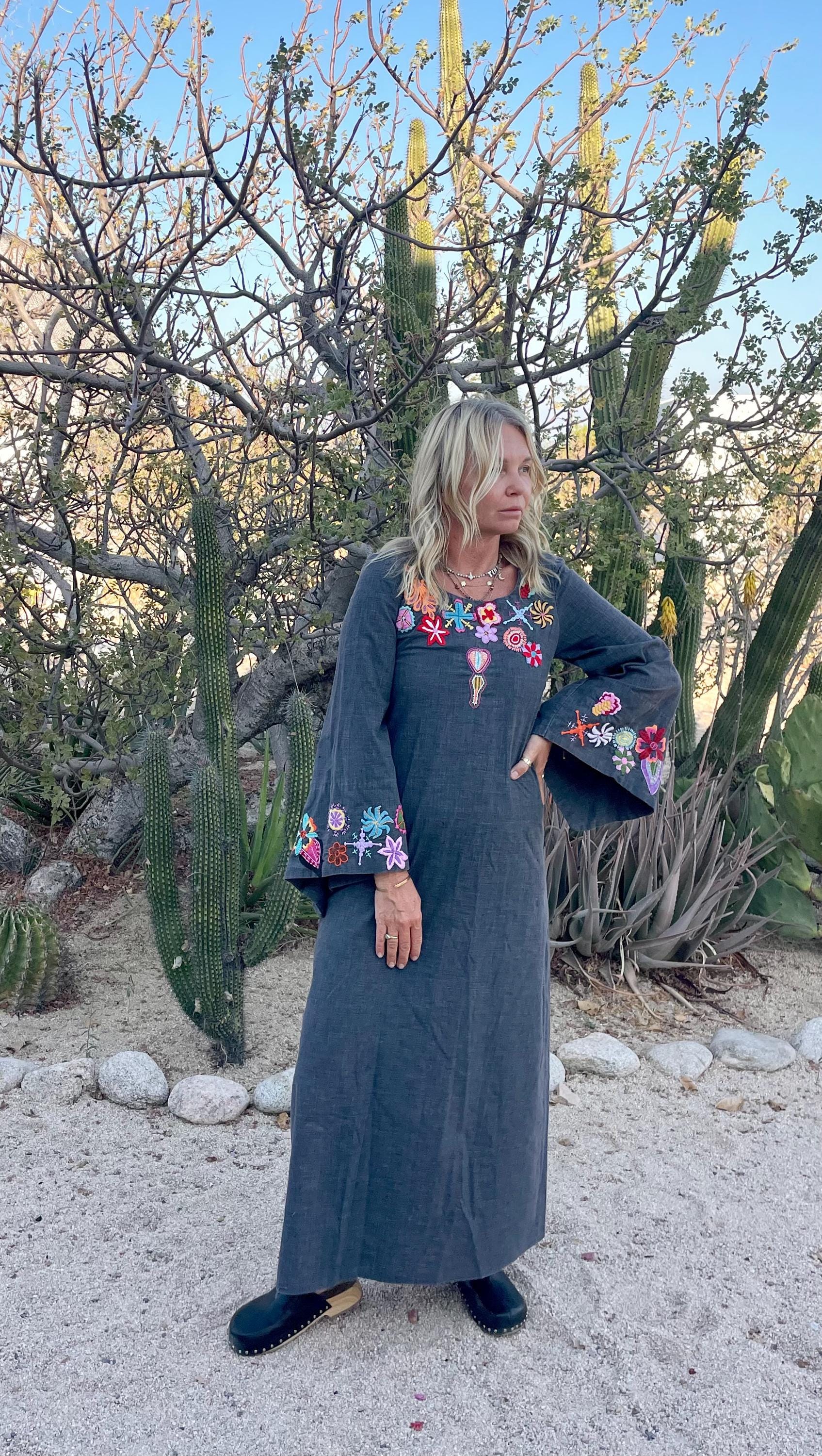 Authentic vintage 1970s hand‑embroidered cotton kaftan in a slate gray with bright multicolor floral embroidery across the neckline and cuffs. Lightweight woven cotton with a flowing A-line silhouette, split back zipper, and bell sleeves.