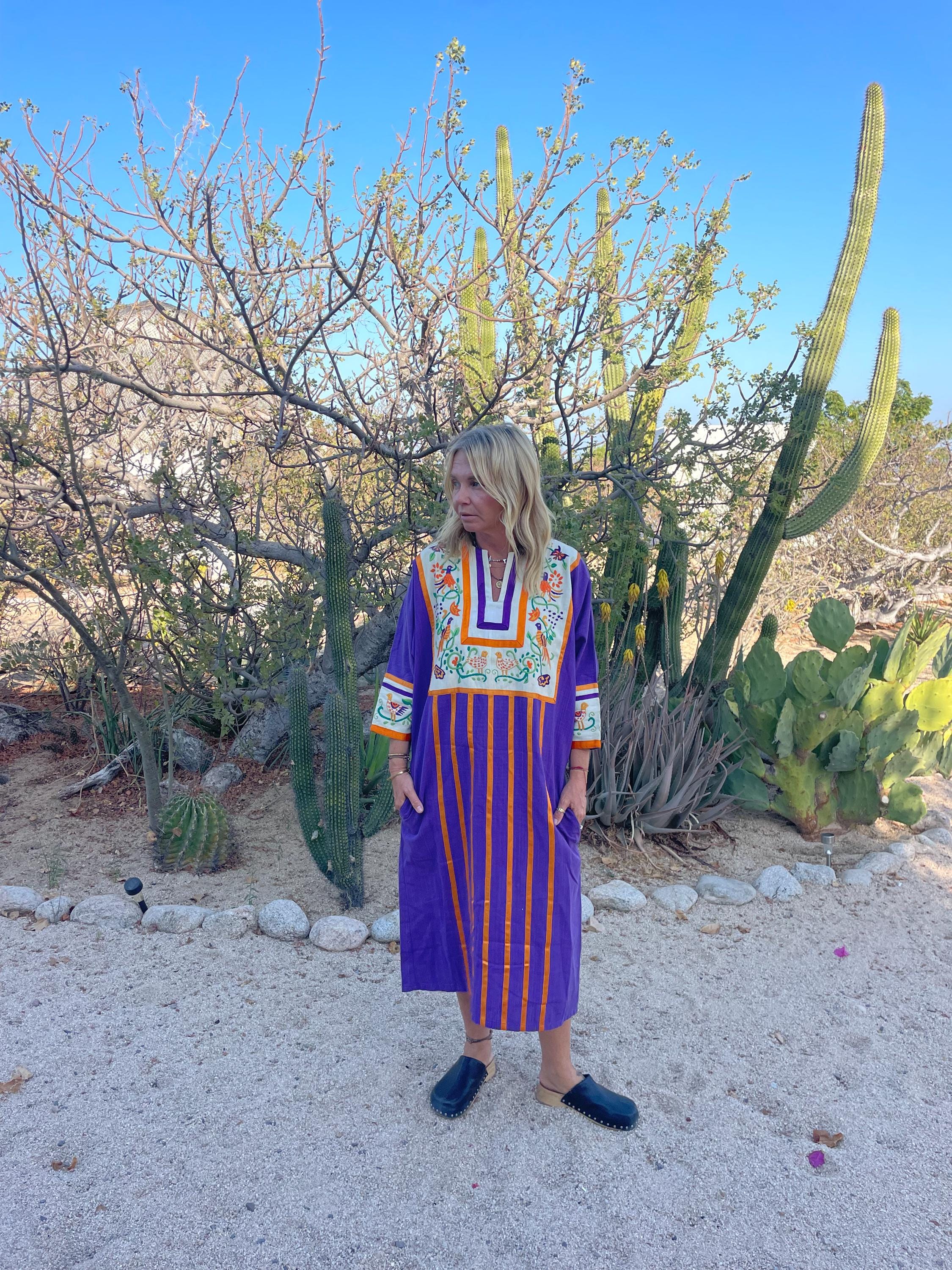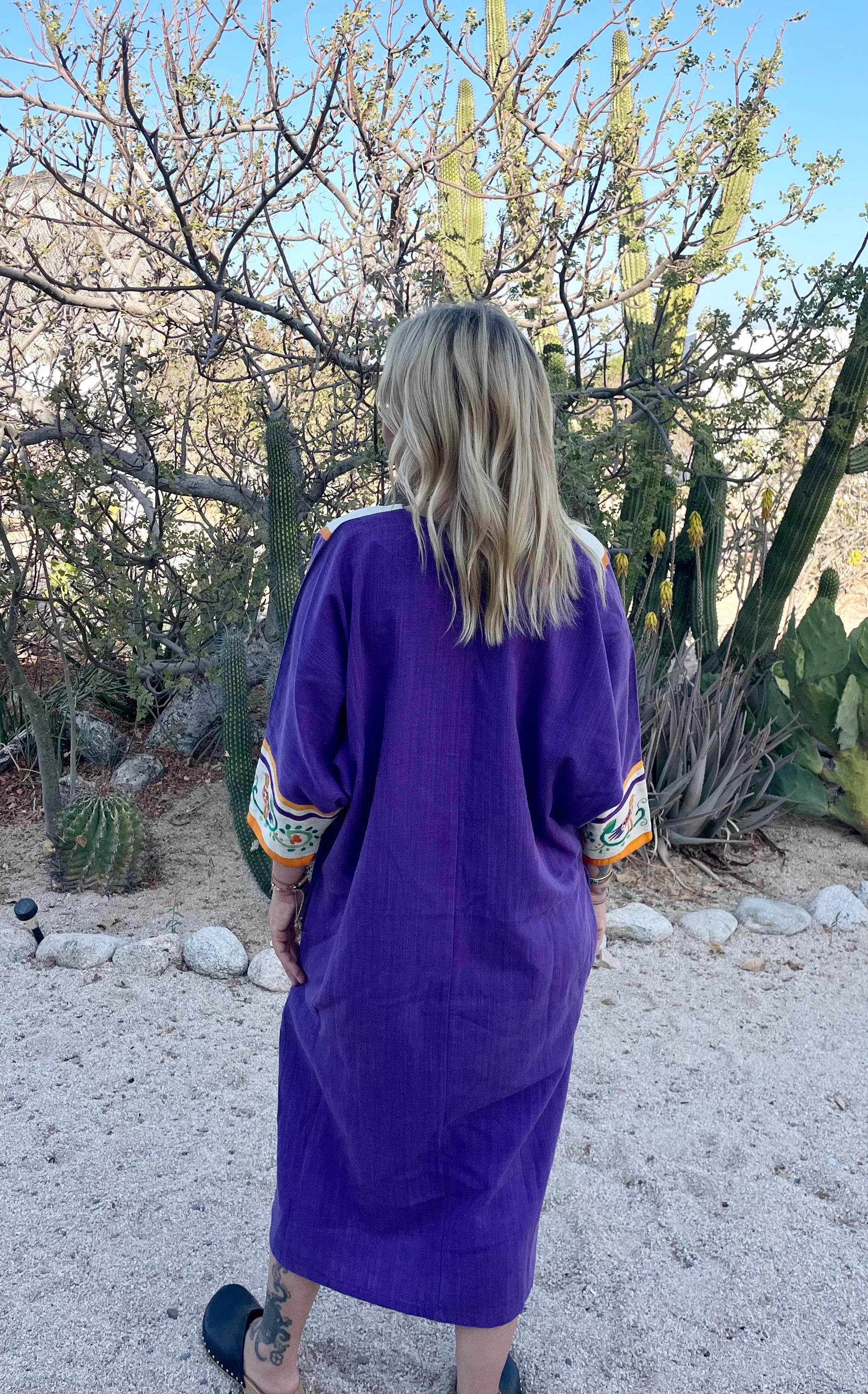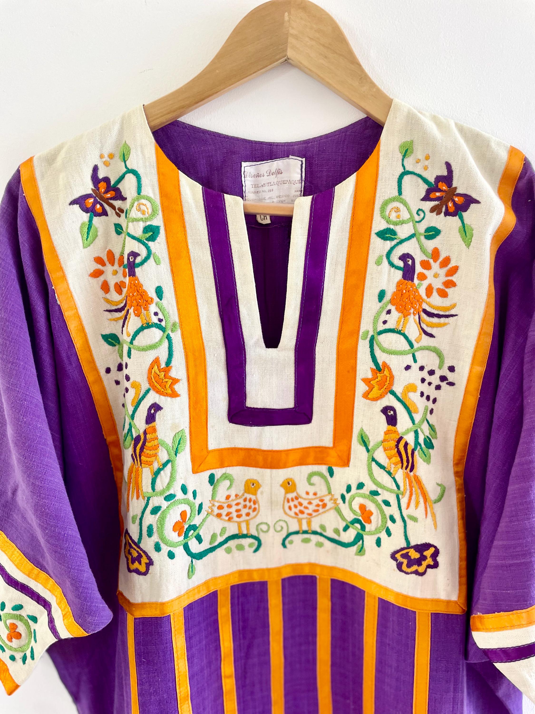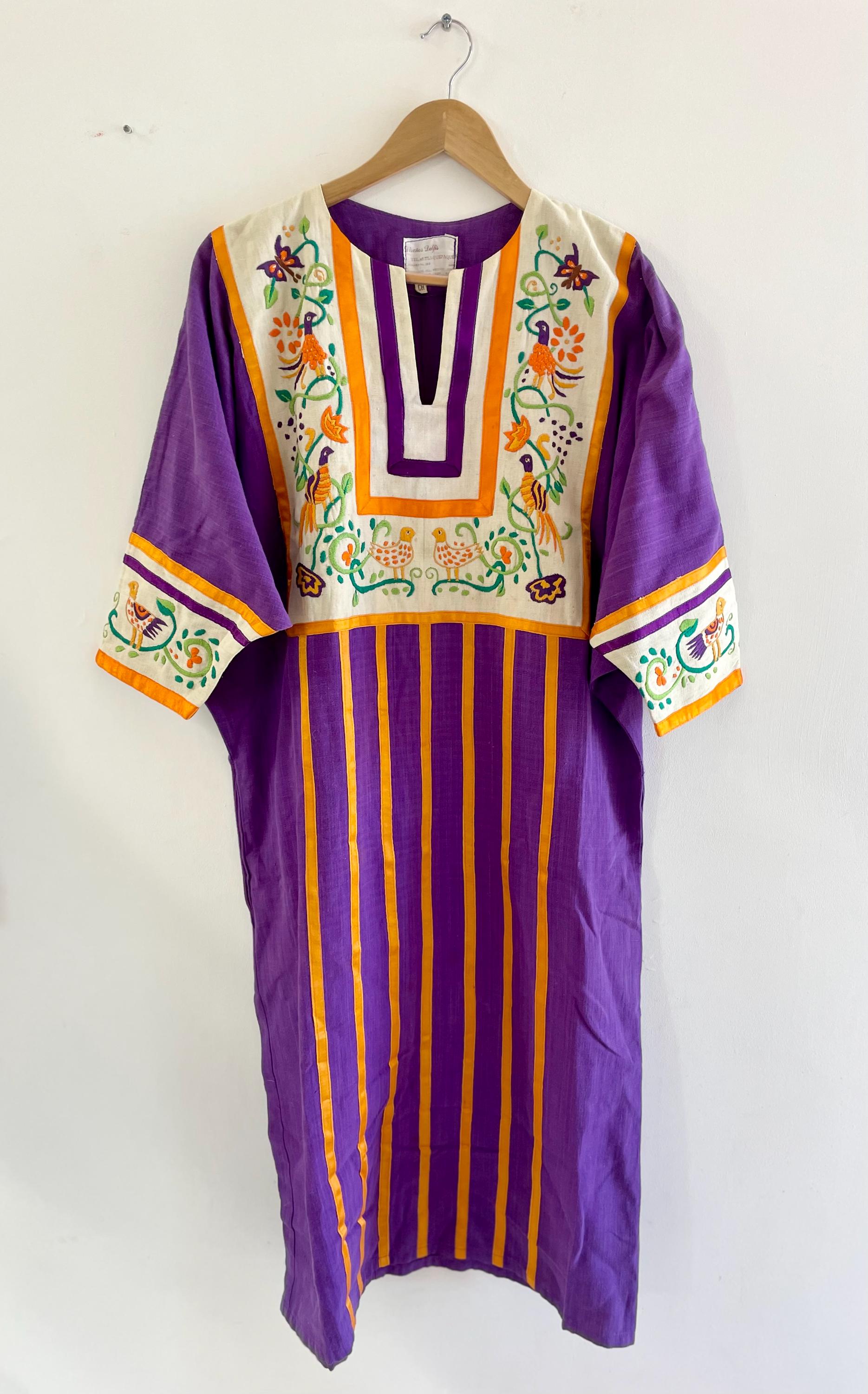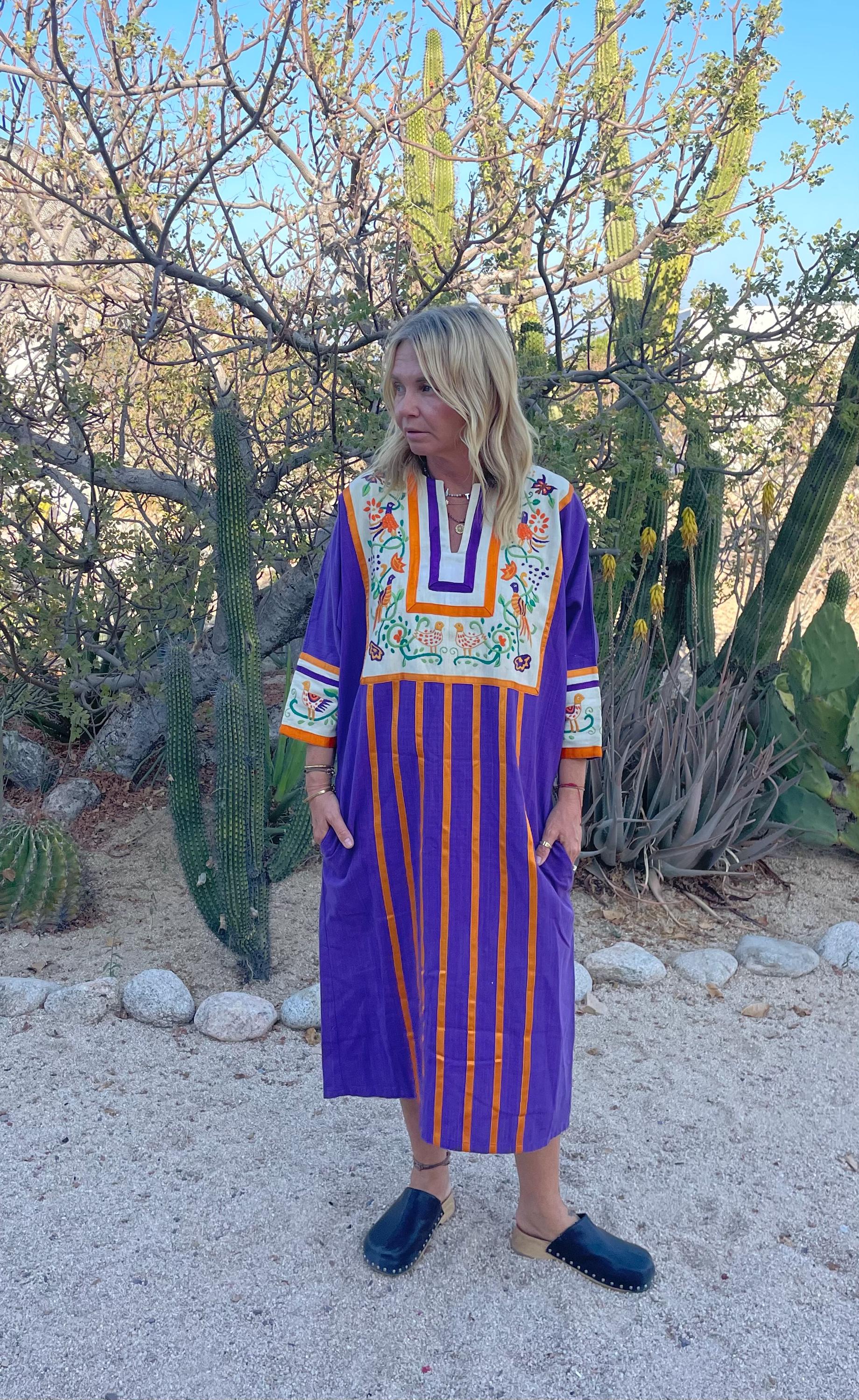Authentic 1960s Diseños Delfis Mexican hand‑embroidered cotton kaftan in vivid purple with golden vertical stripes and a cream embroidered yoke and cuffs featuring birds and florals. Resort/boho silhouette with short sleeves and front split neckline