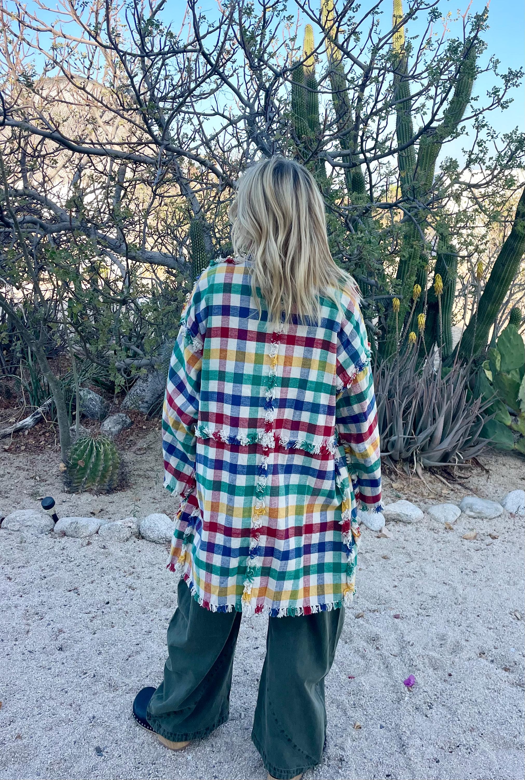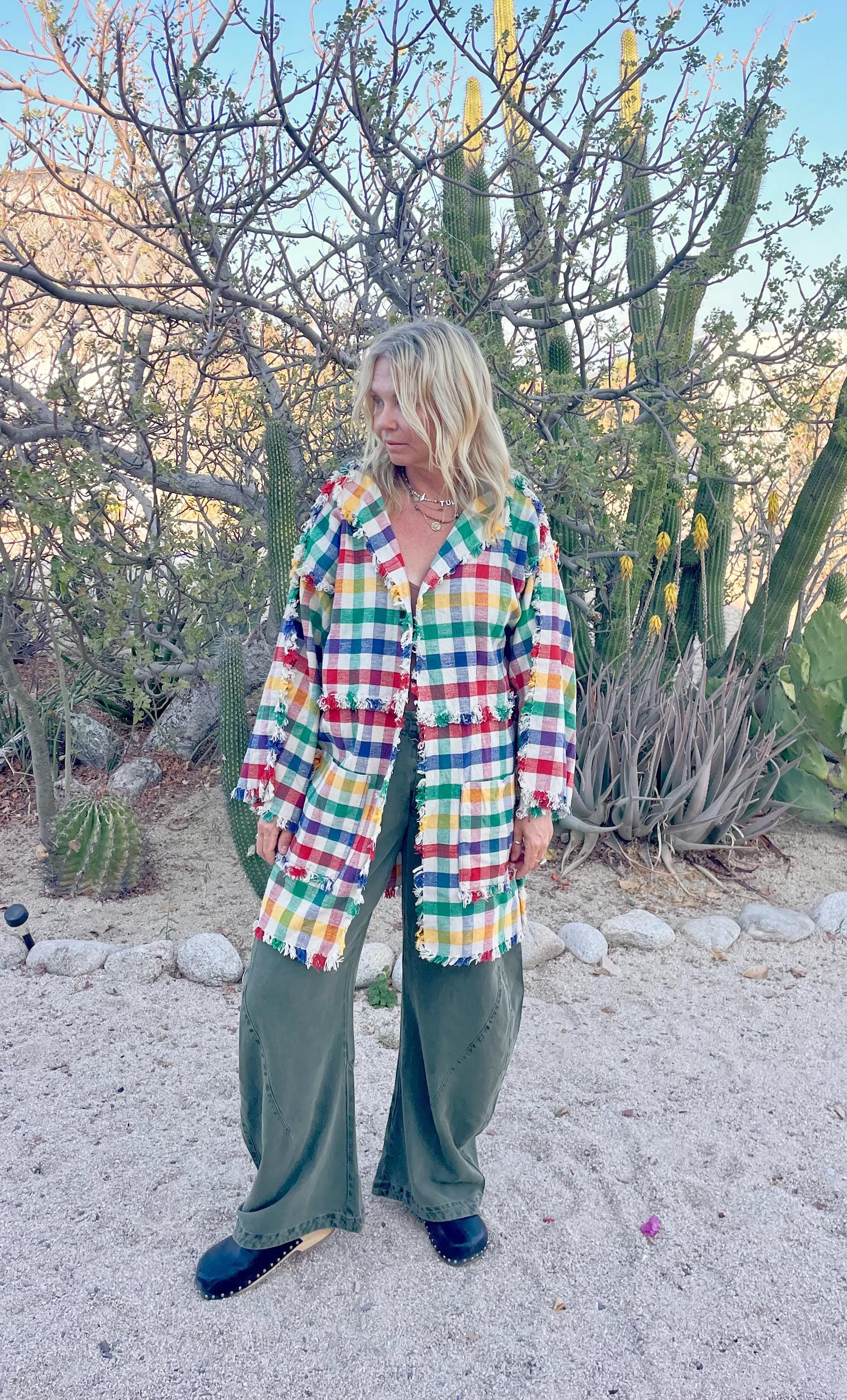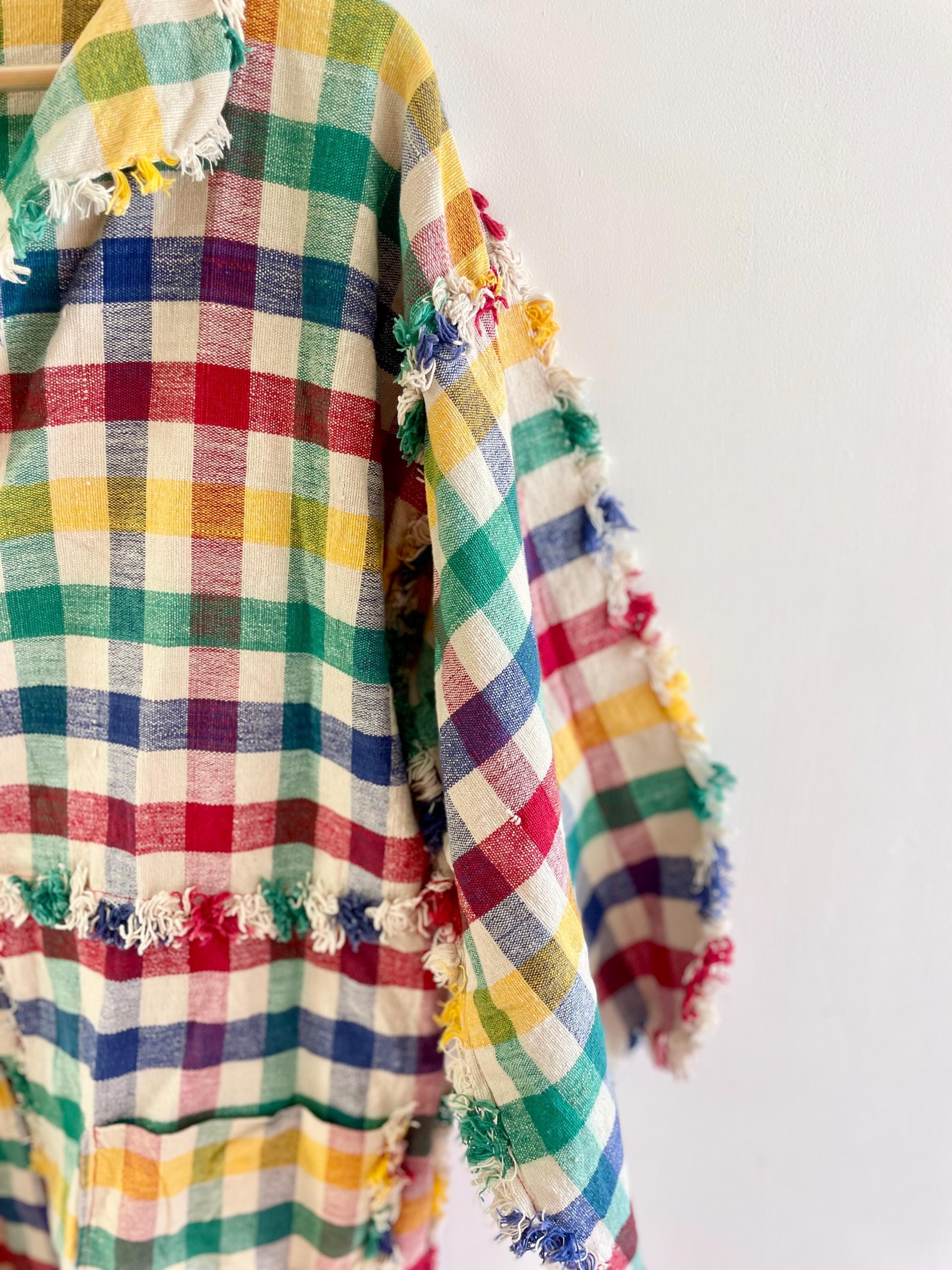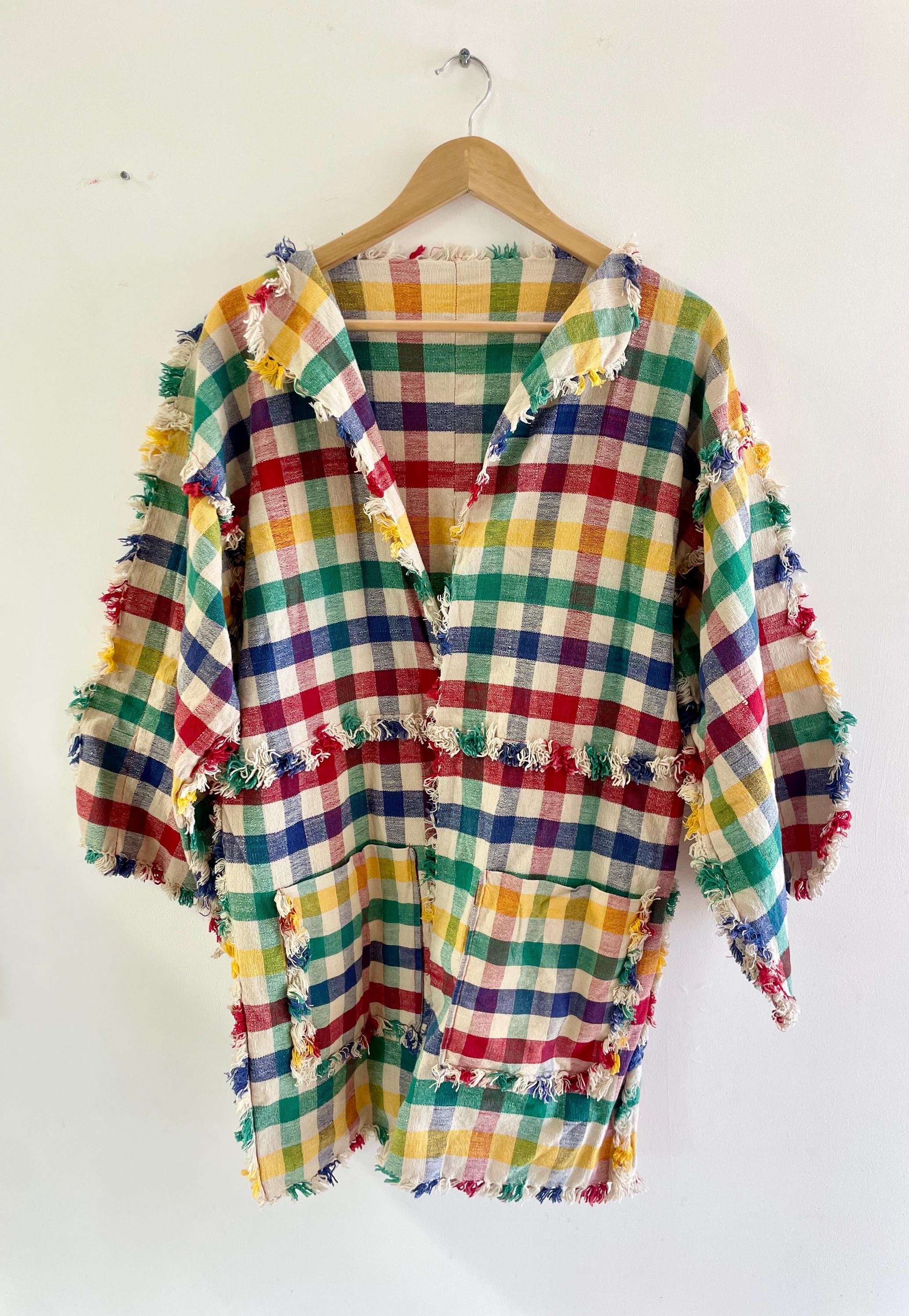 Rare vintage 1950s hand-woven cotton jacket in a multicolor checked pattern with playful fringe trim. Lightweight and boxy with large front pockets — perfect as a statement layering piece or relaxed boho topper.