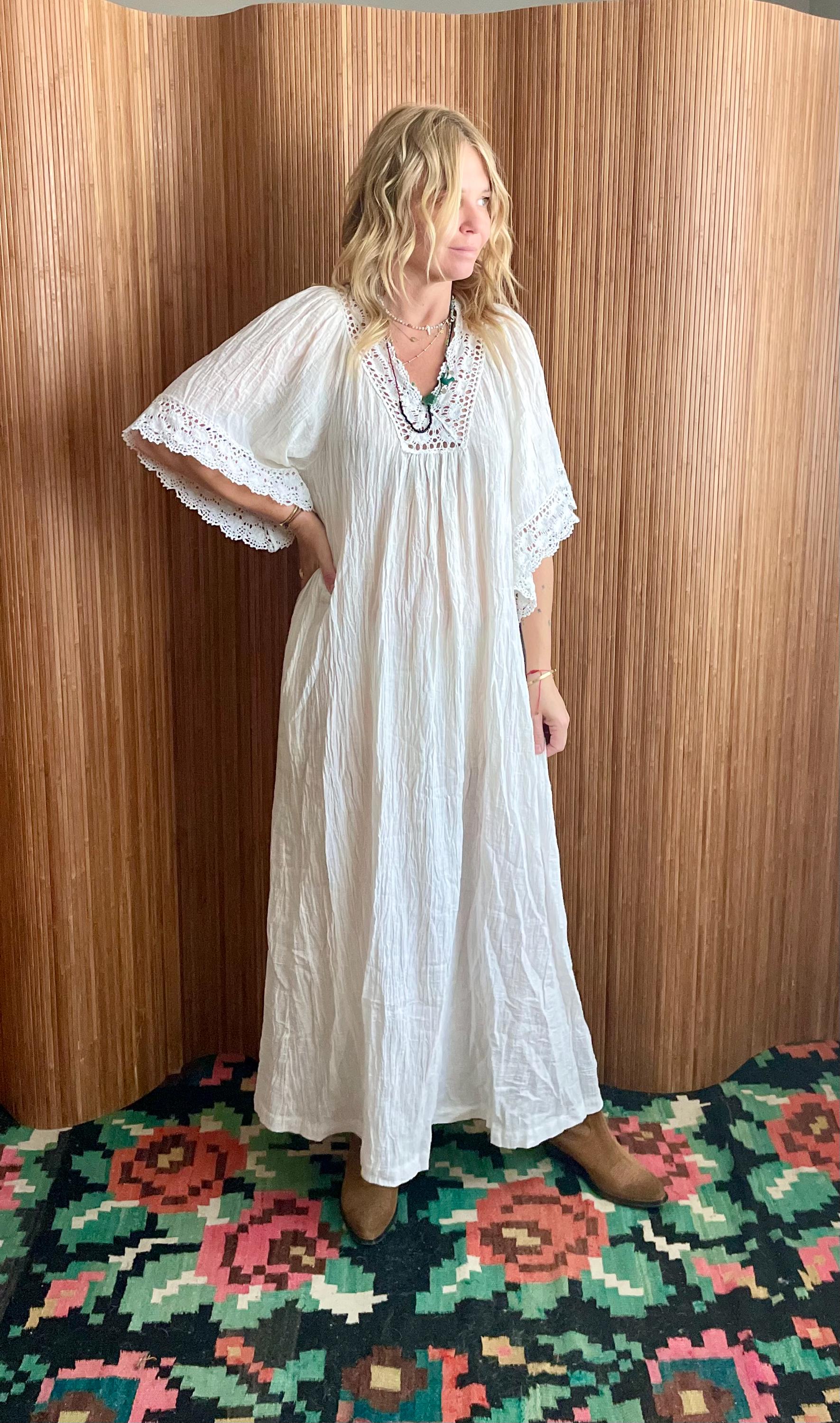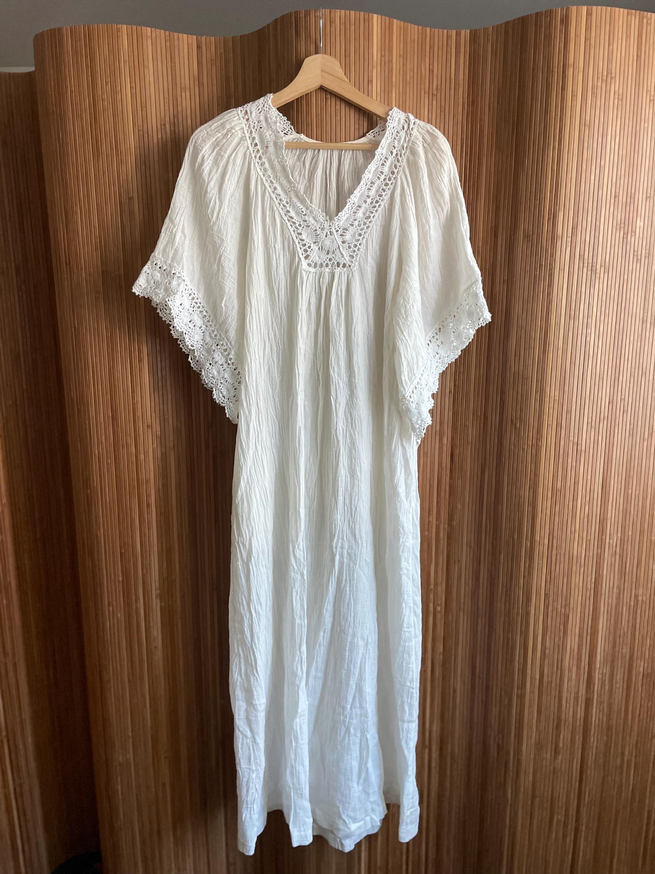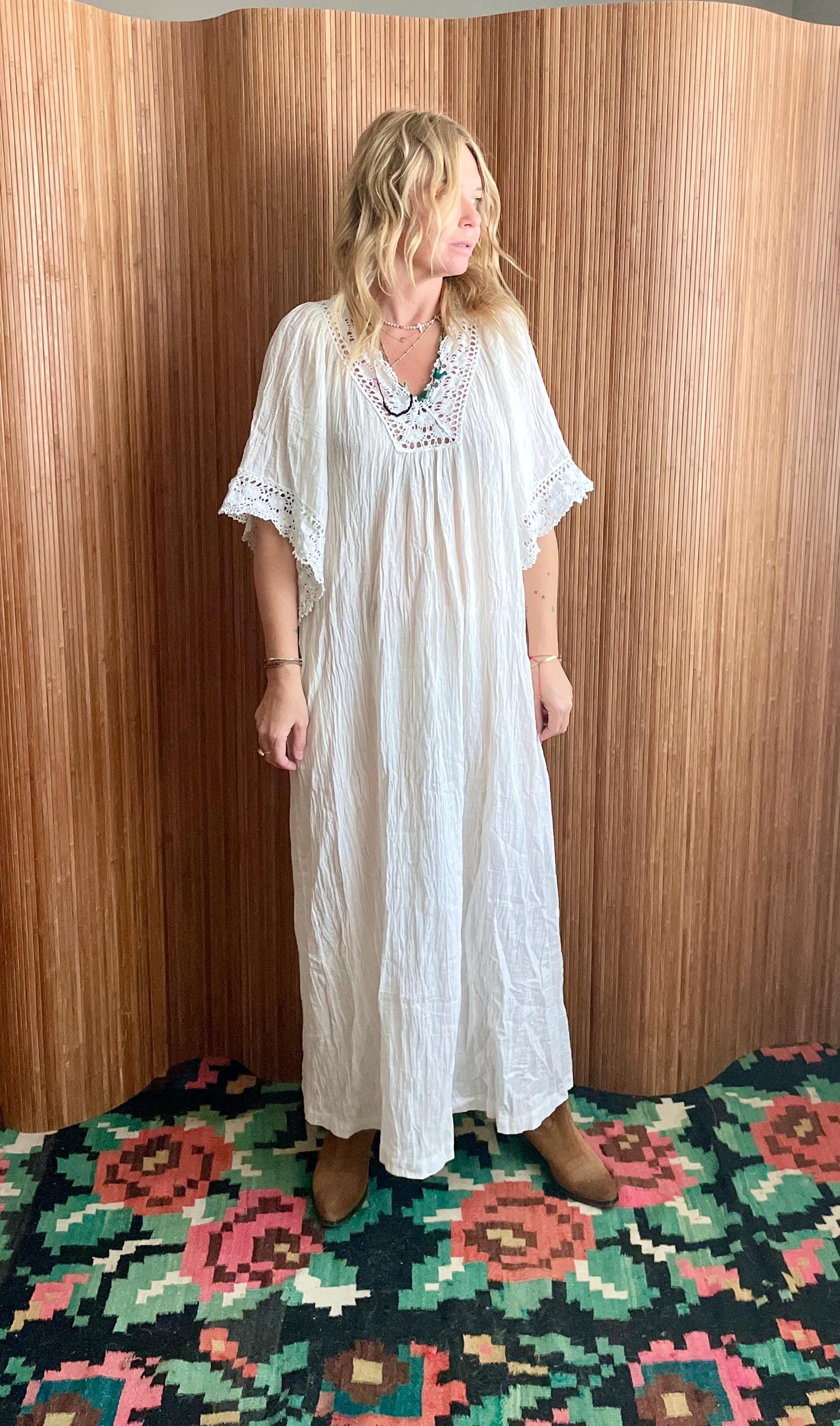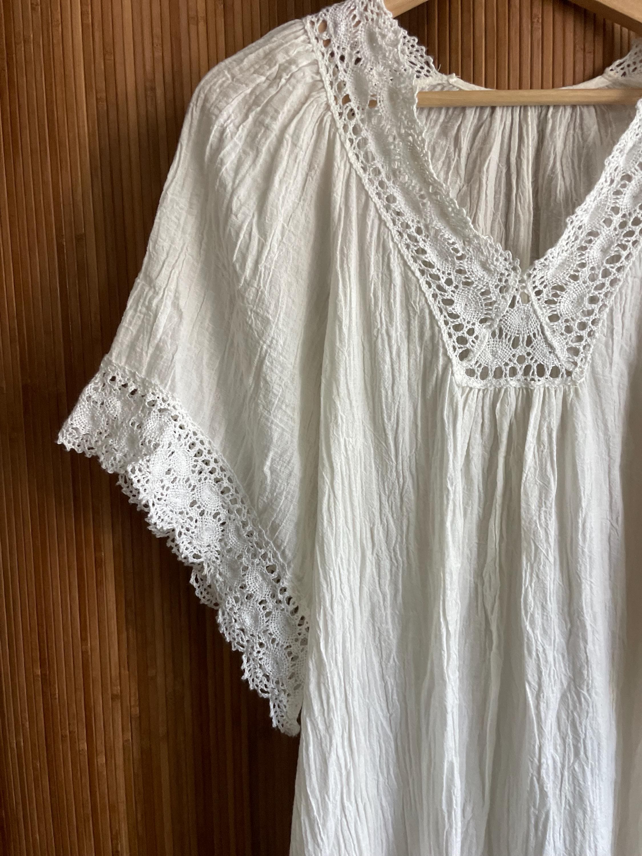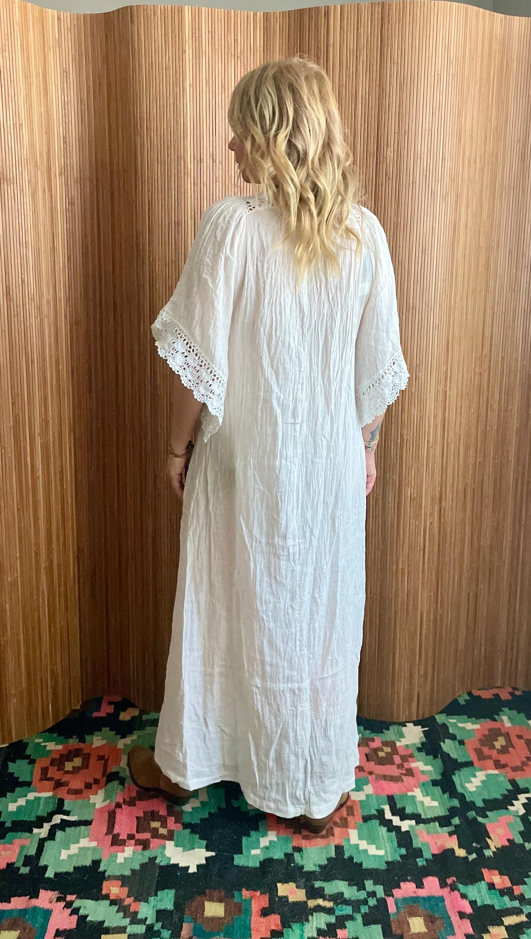 Vintage 1970s white crinkle cotton kaftan, featuring a deep V-neck finished with hand crochet lace and scalloped lace trim at the sleeves. Soft, slightly sheer crinkled fabric creates an effortless, lived-in drape perfect for summer, beach, or layering.