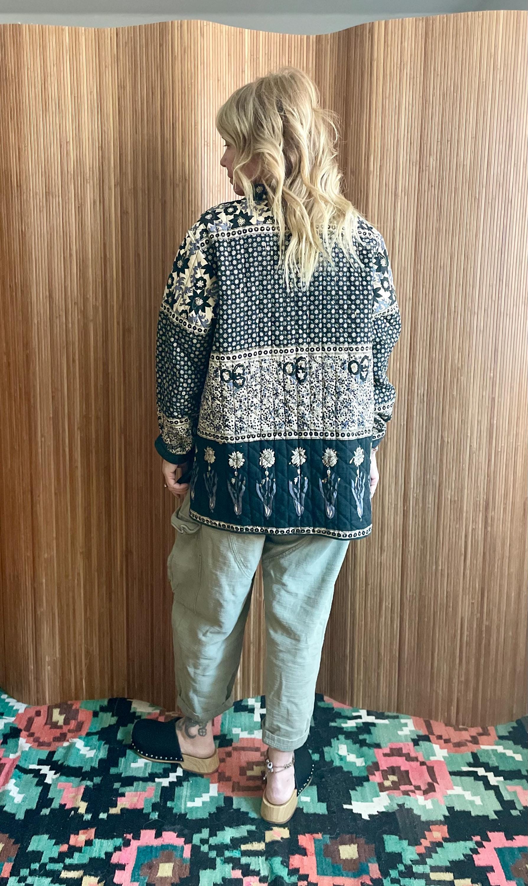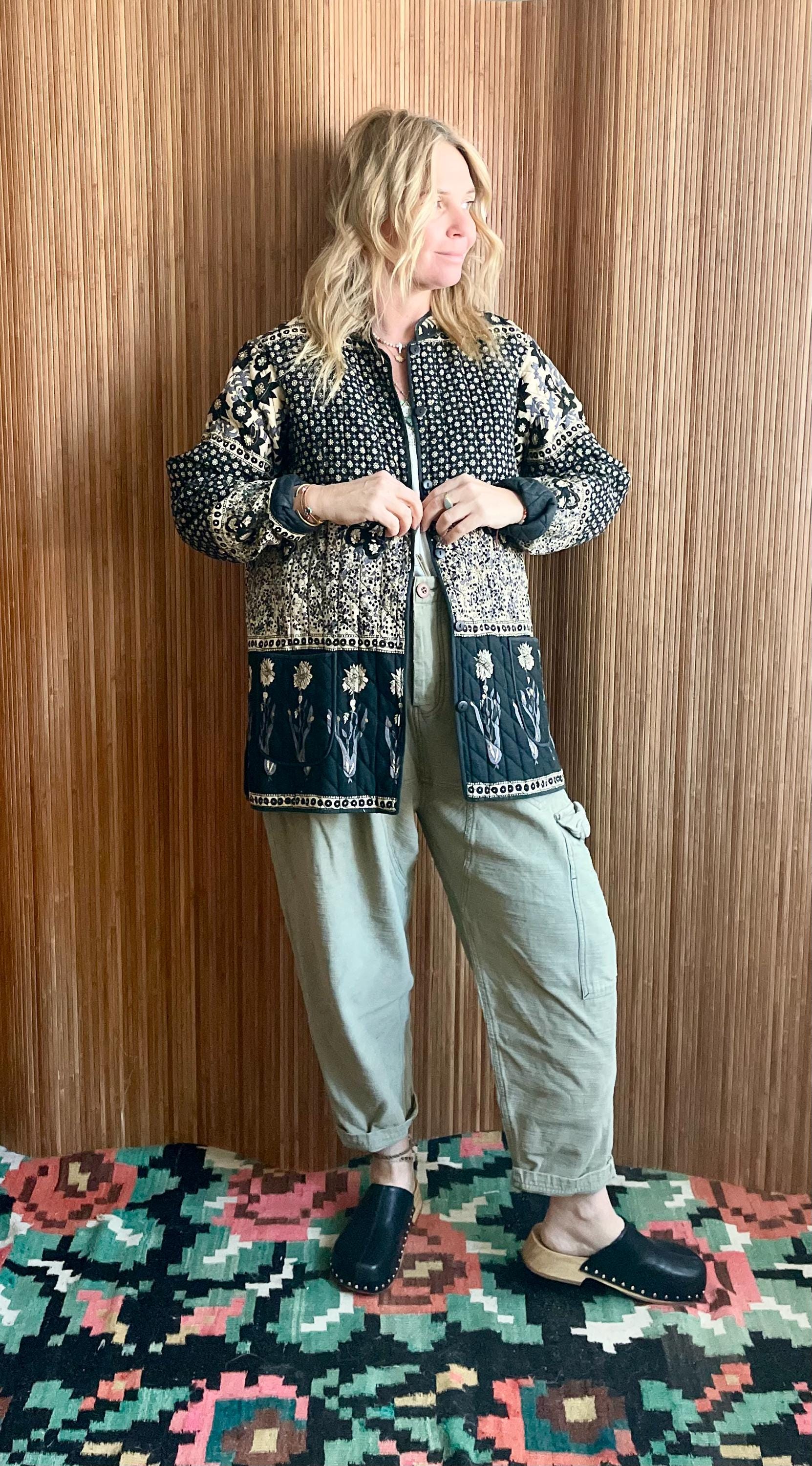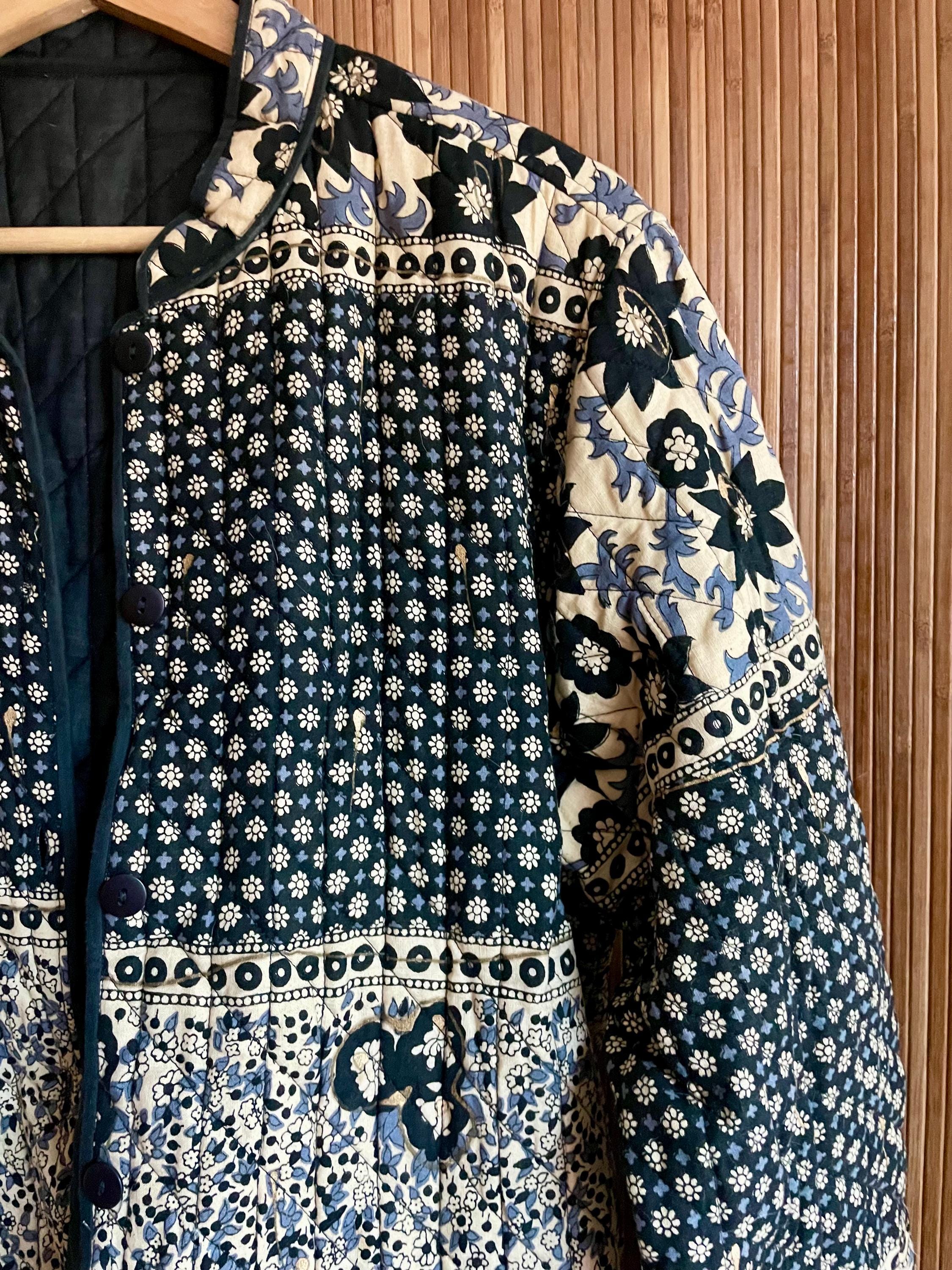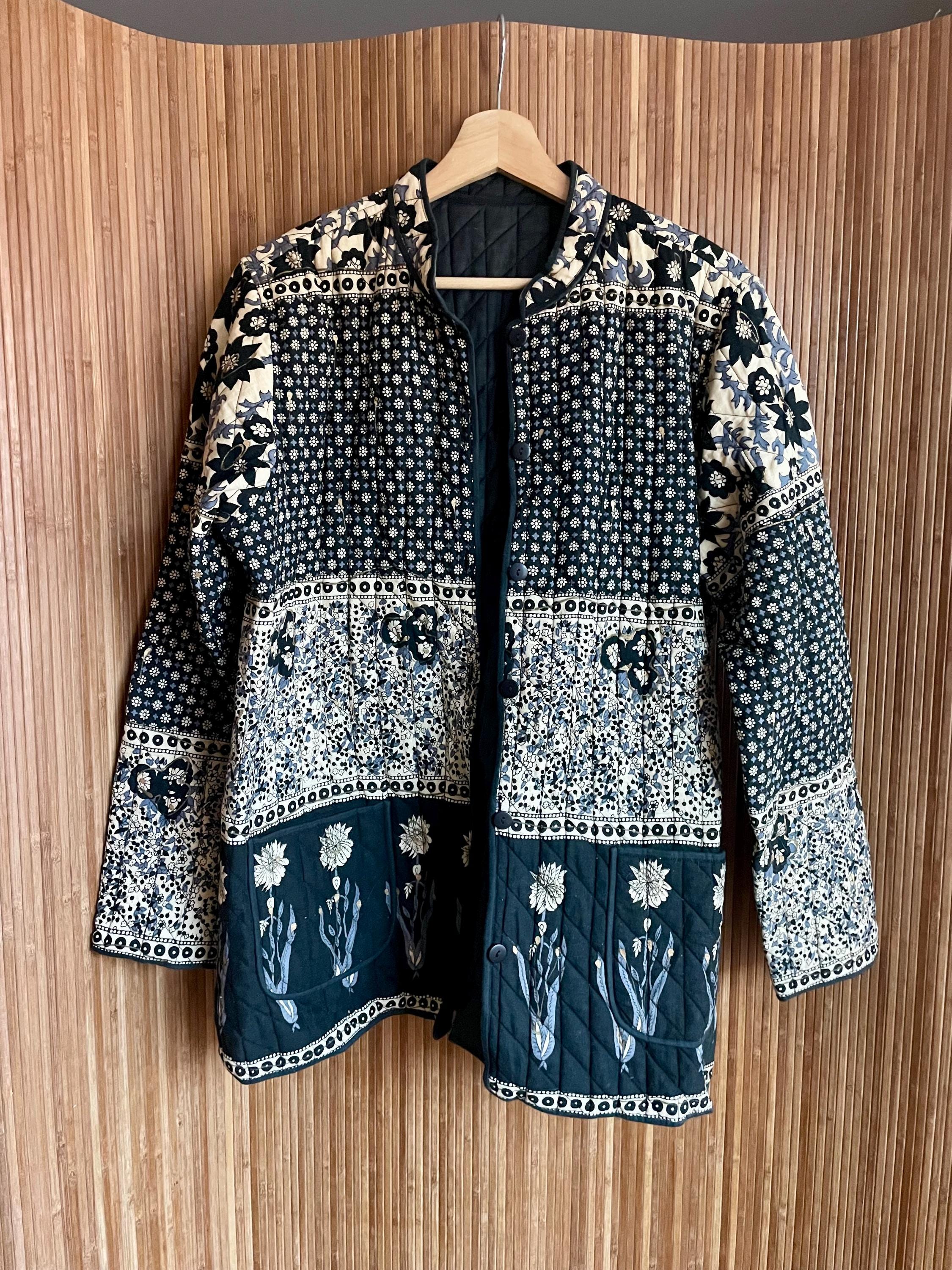 Rare vintage Indian block-print quilted jacket featuring black and cream floral/medallion panels, subtle floral embroidery on the quilted hem, and a classic button-front. Lightweightly quilted — perfect layered over dresses, knits, or jeans for boho and vintage styling