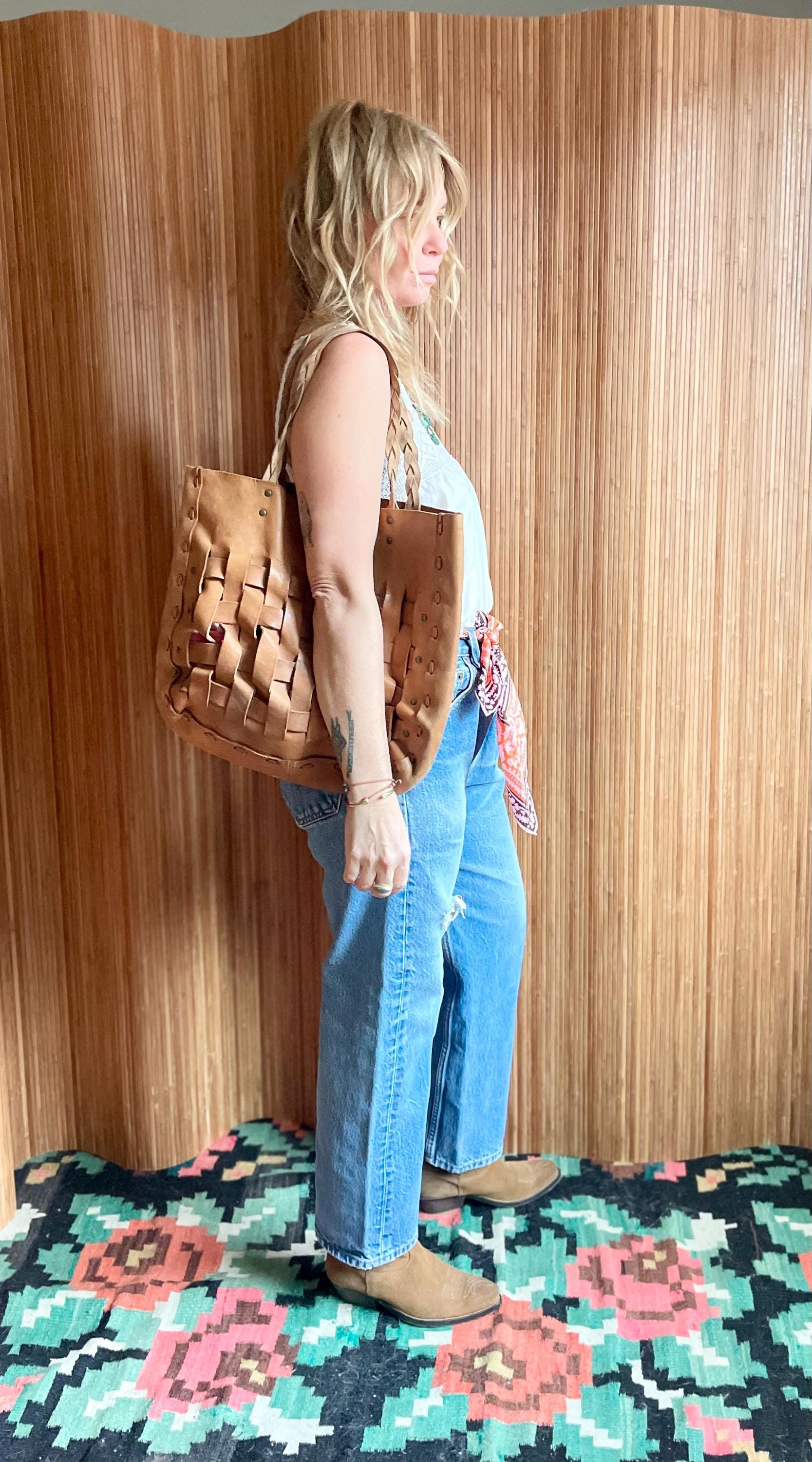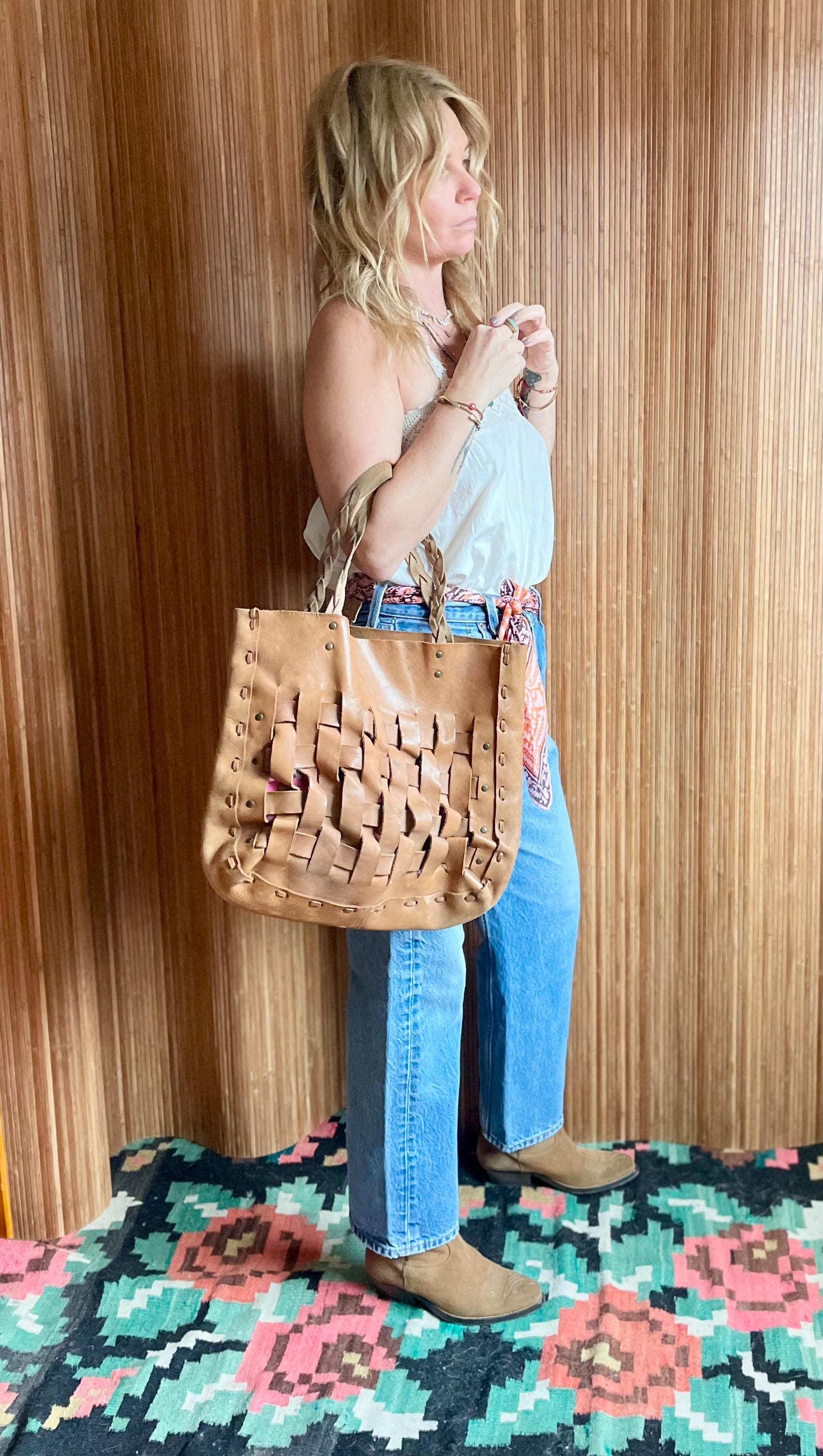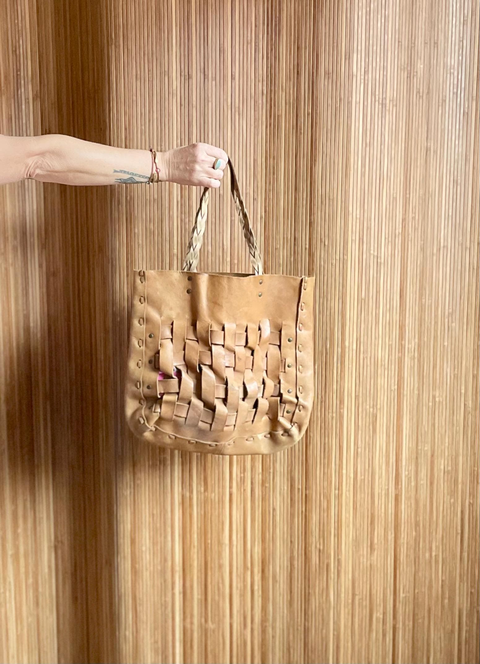 Authentic vintage handwoven/raw leather tote from the 1970s–80s. Natural tan leather with braided shoulder straps and rivet details. Soft, slouchy structure — great as an everyday shopper or market bag.