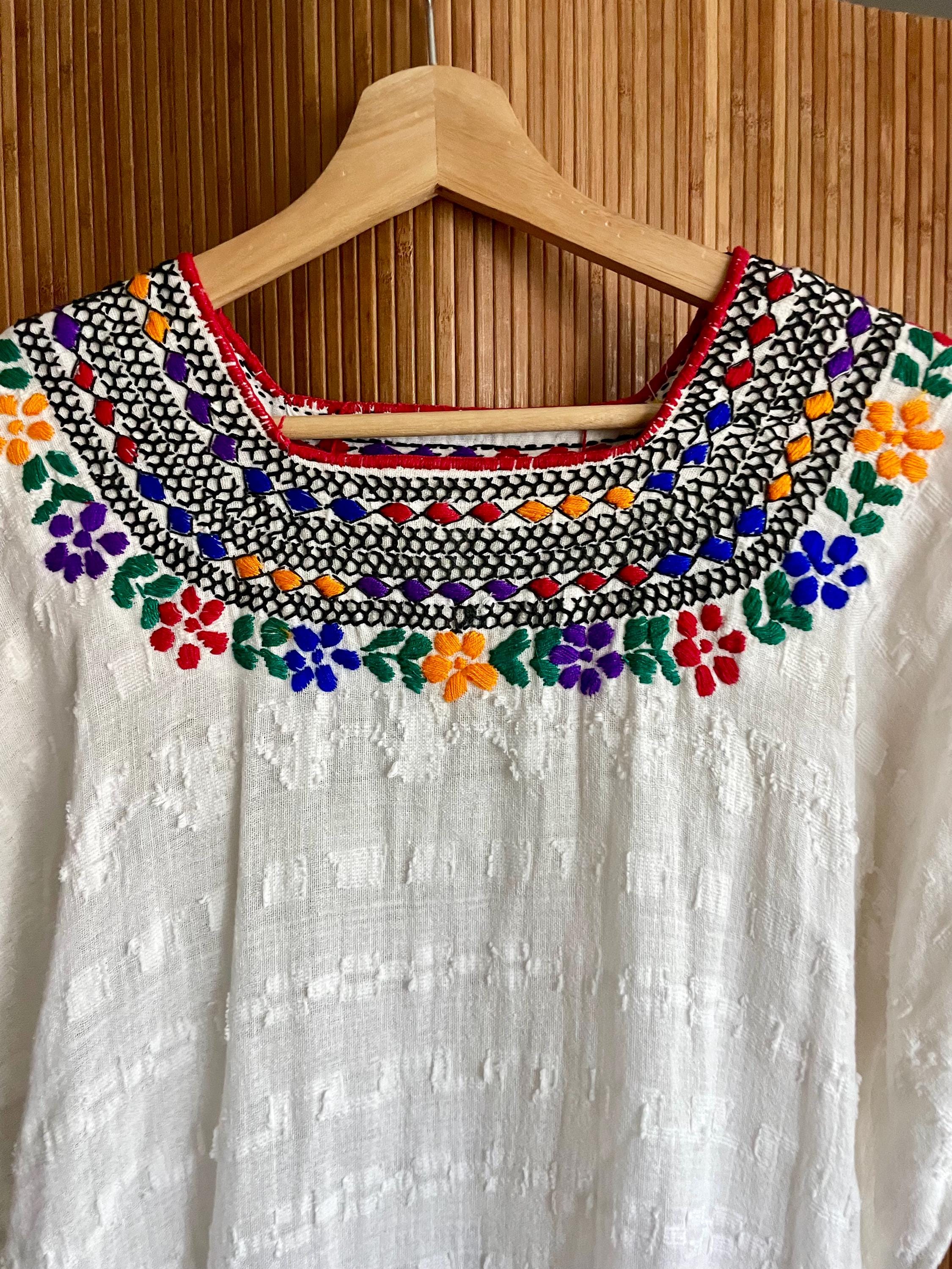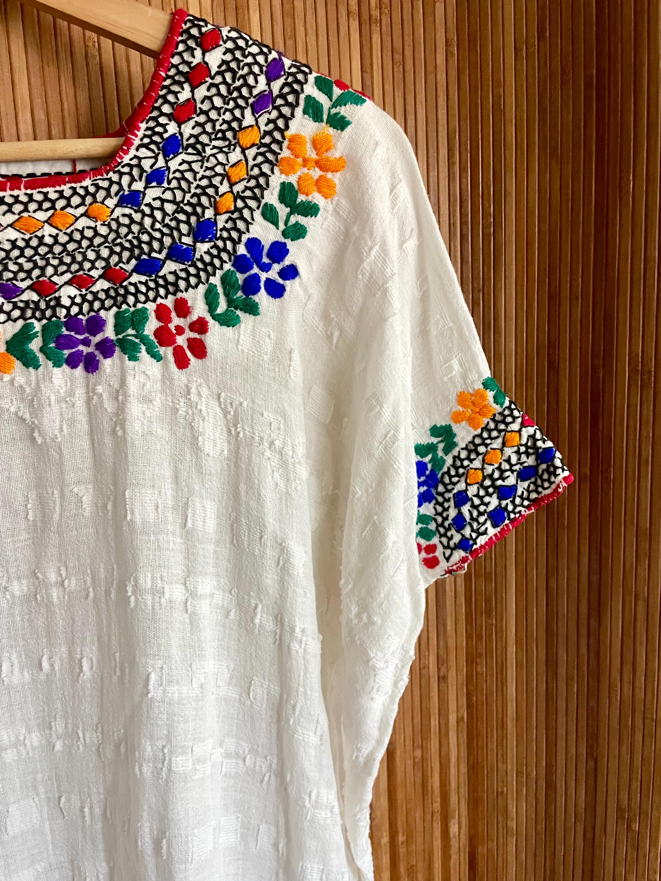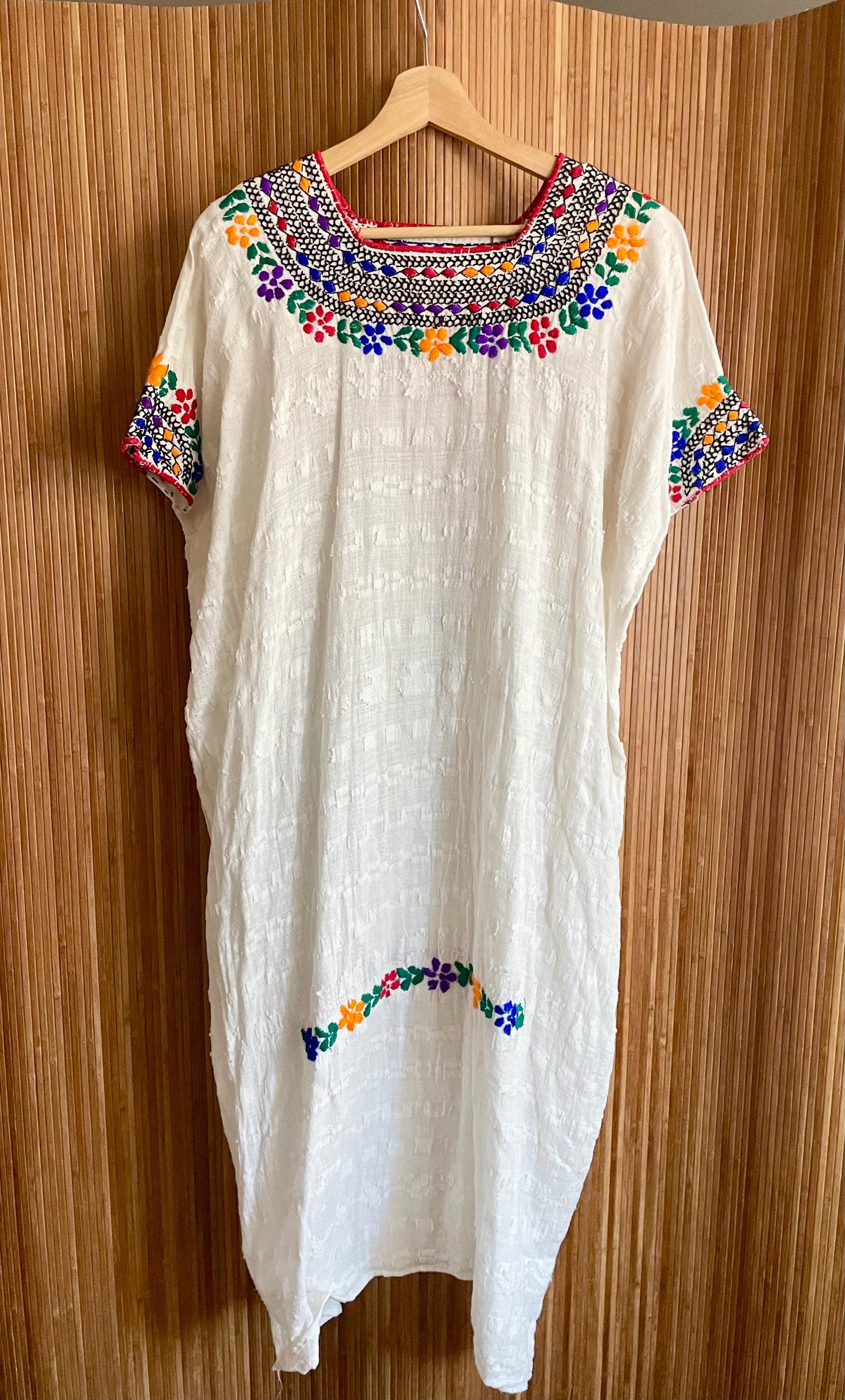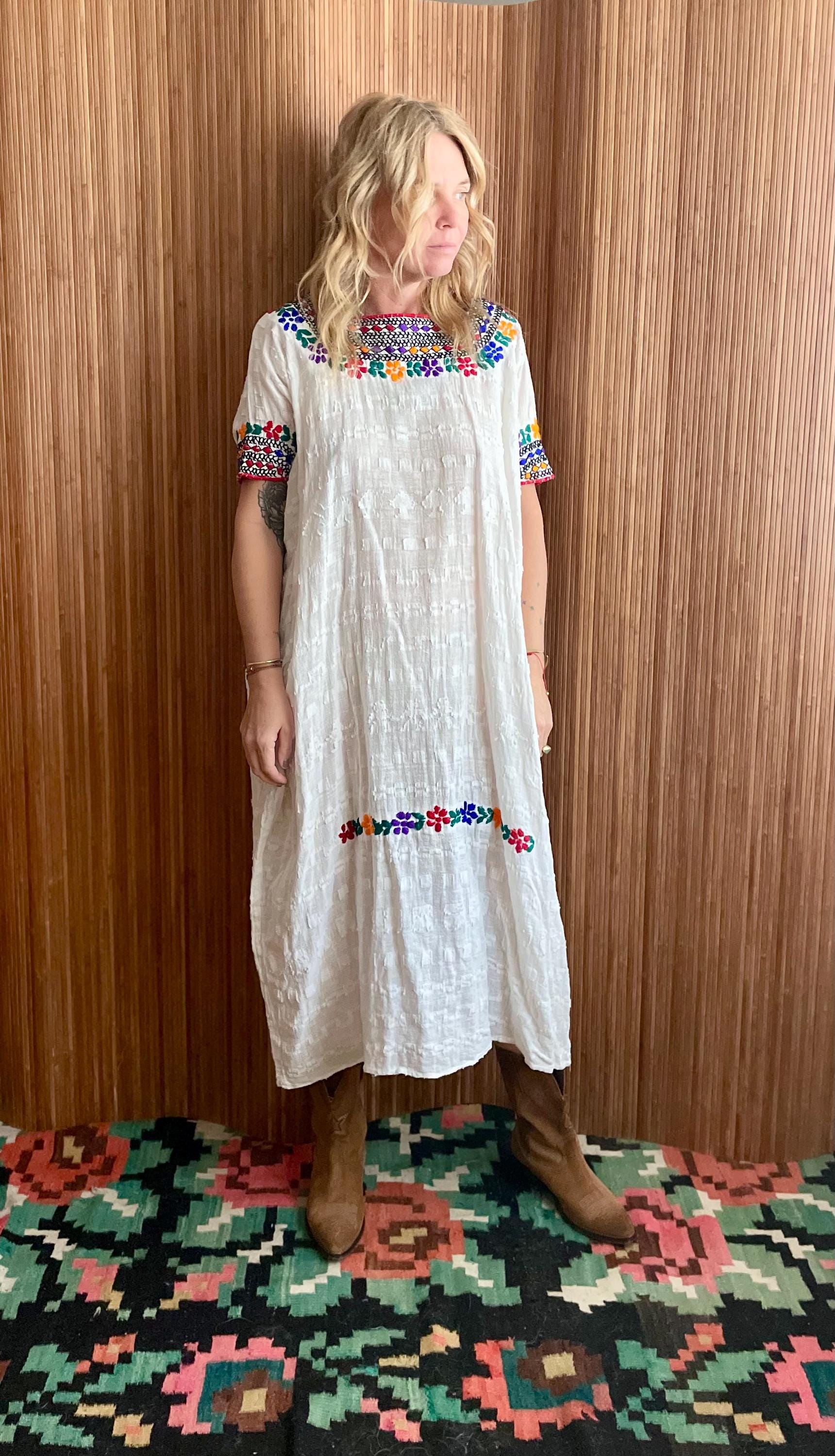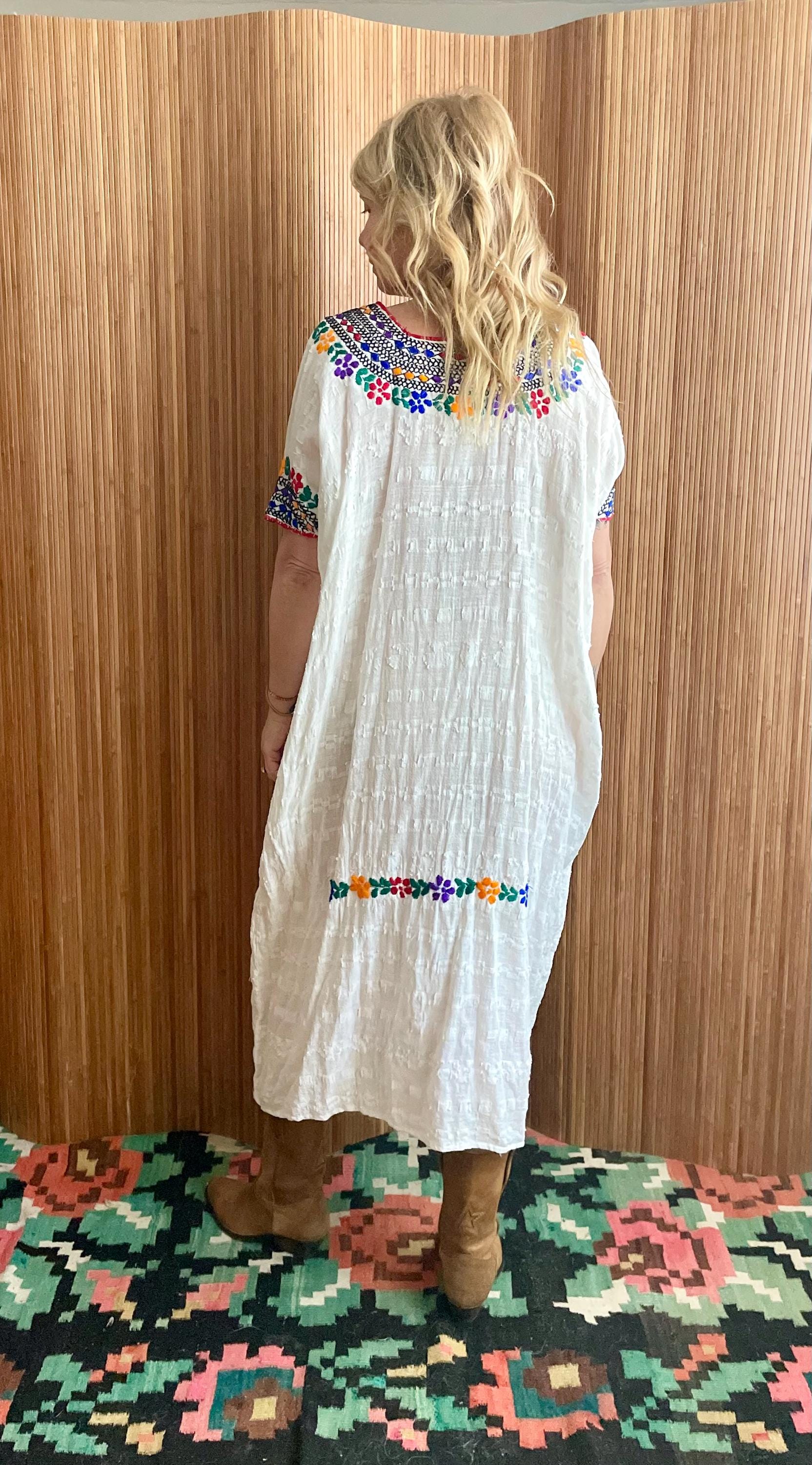 Authentic vintage Guatemalan hand‑loomed textured cotton kaftan featuring vibrant hand embroidery at neckline, sleeves and hem. Light, breathable and slouchy — ideal as a tunic, beach coverup, or boho dress.