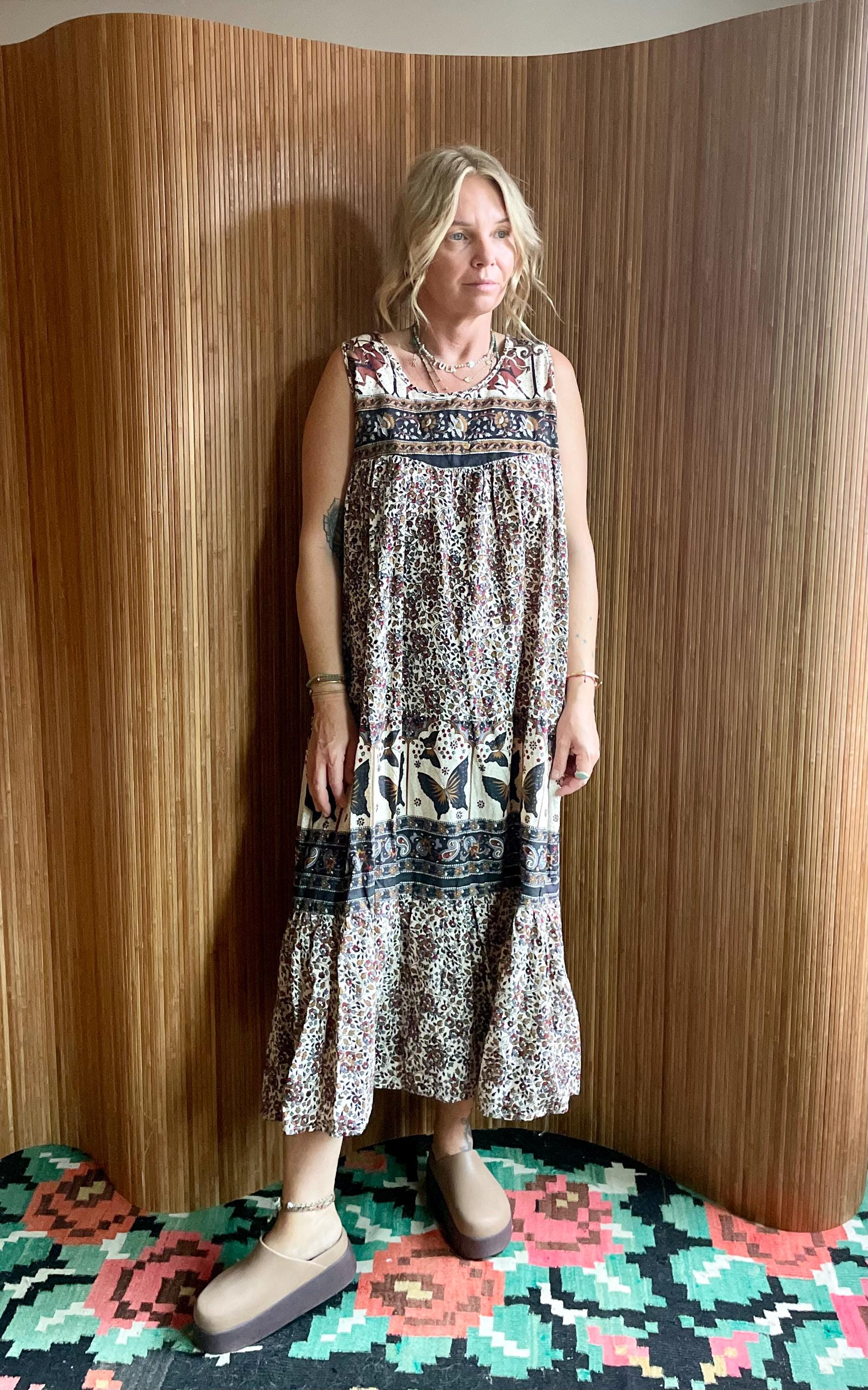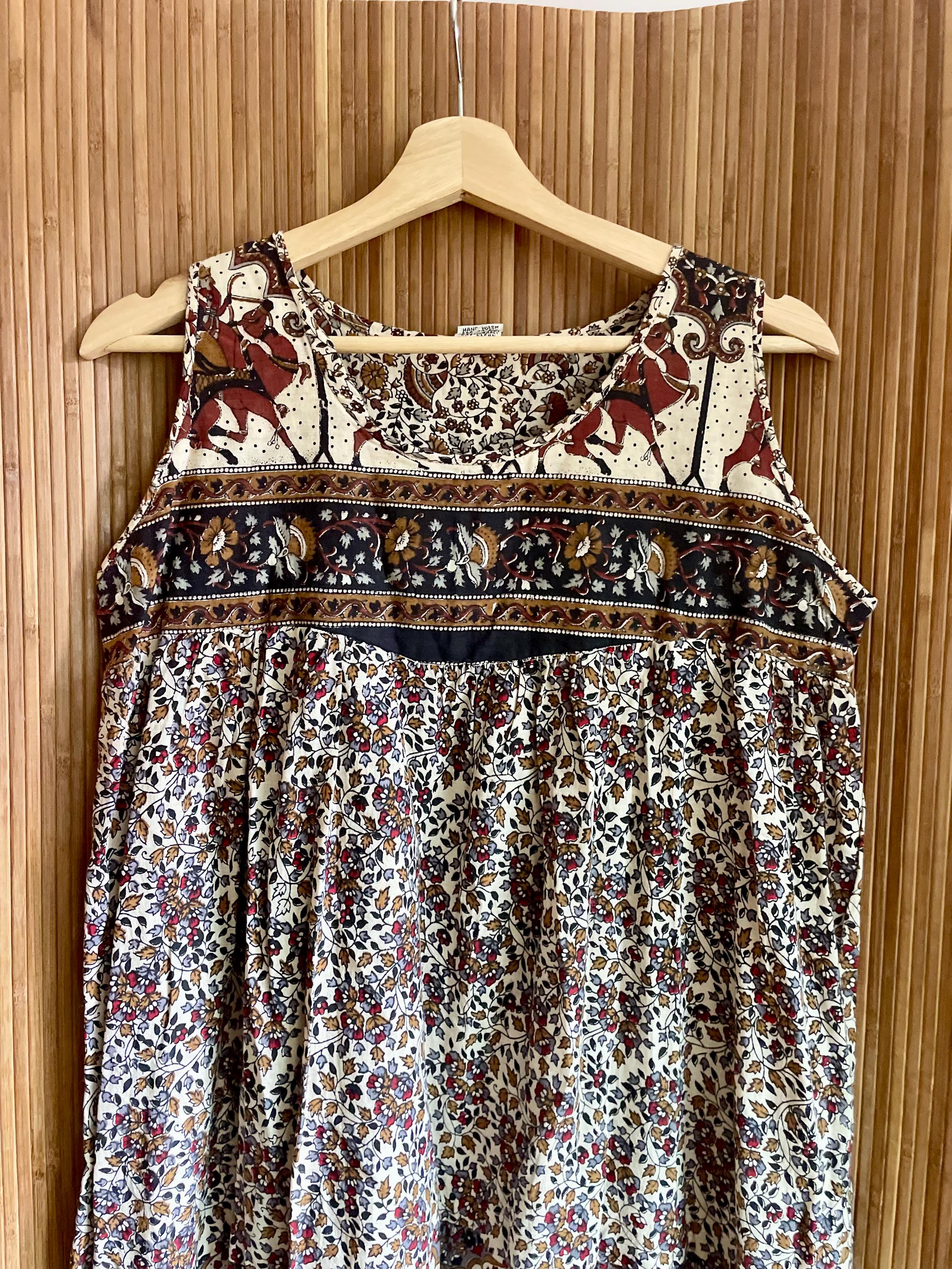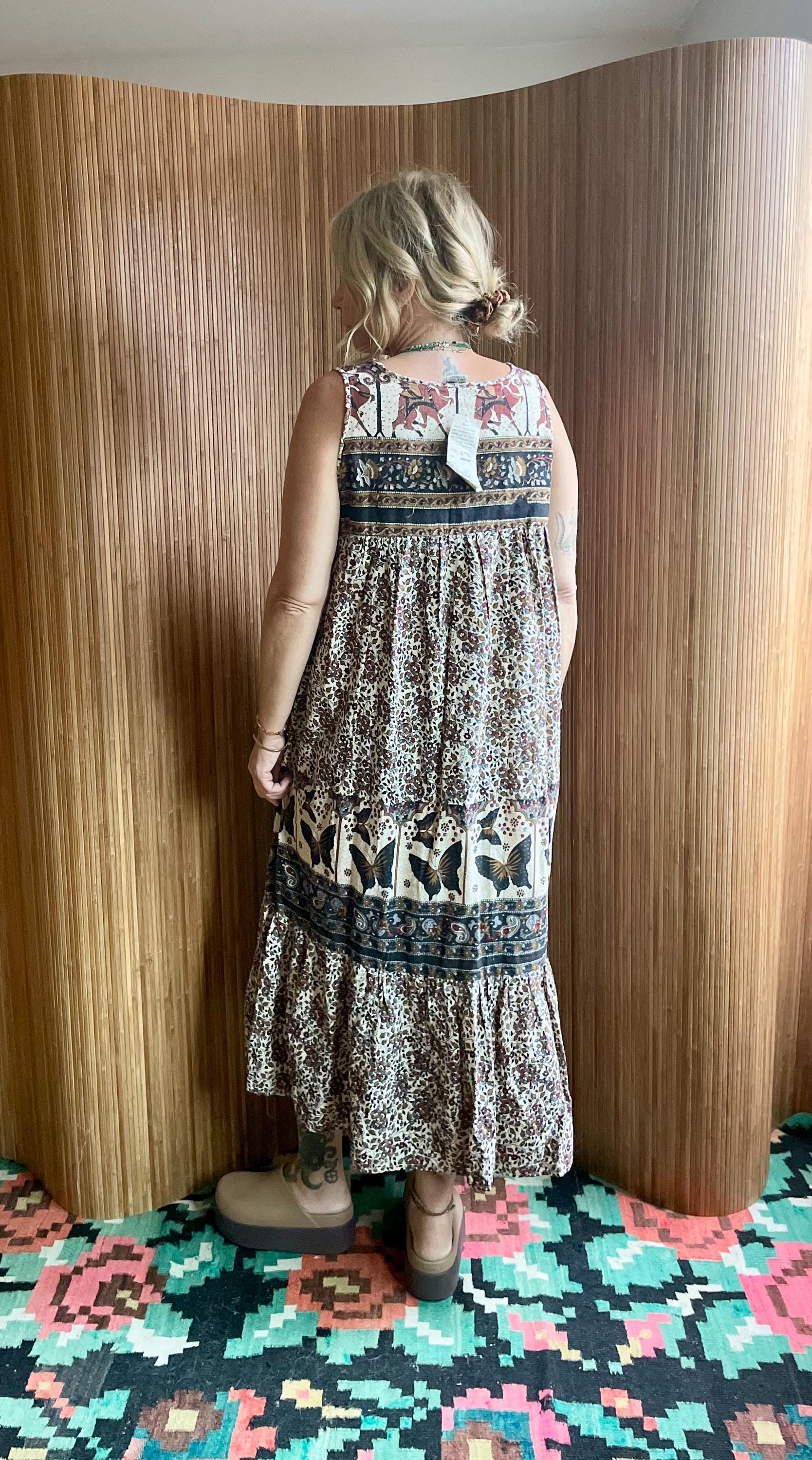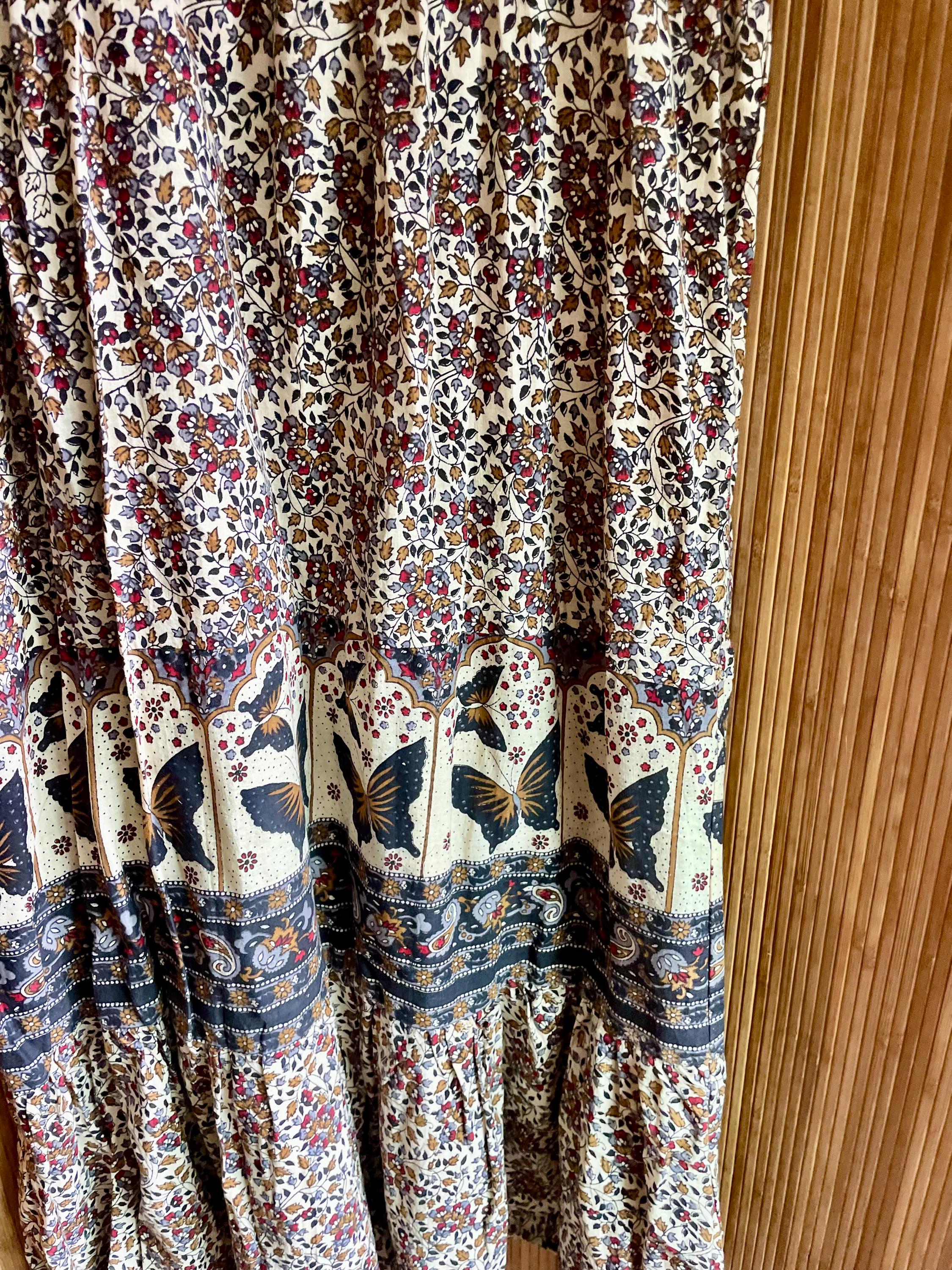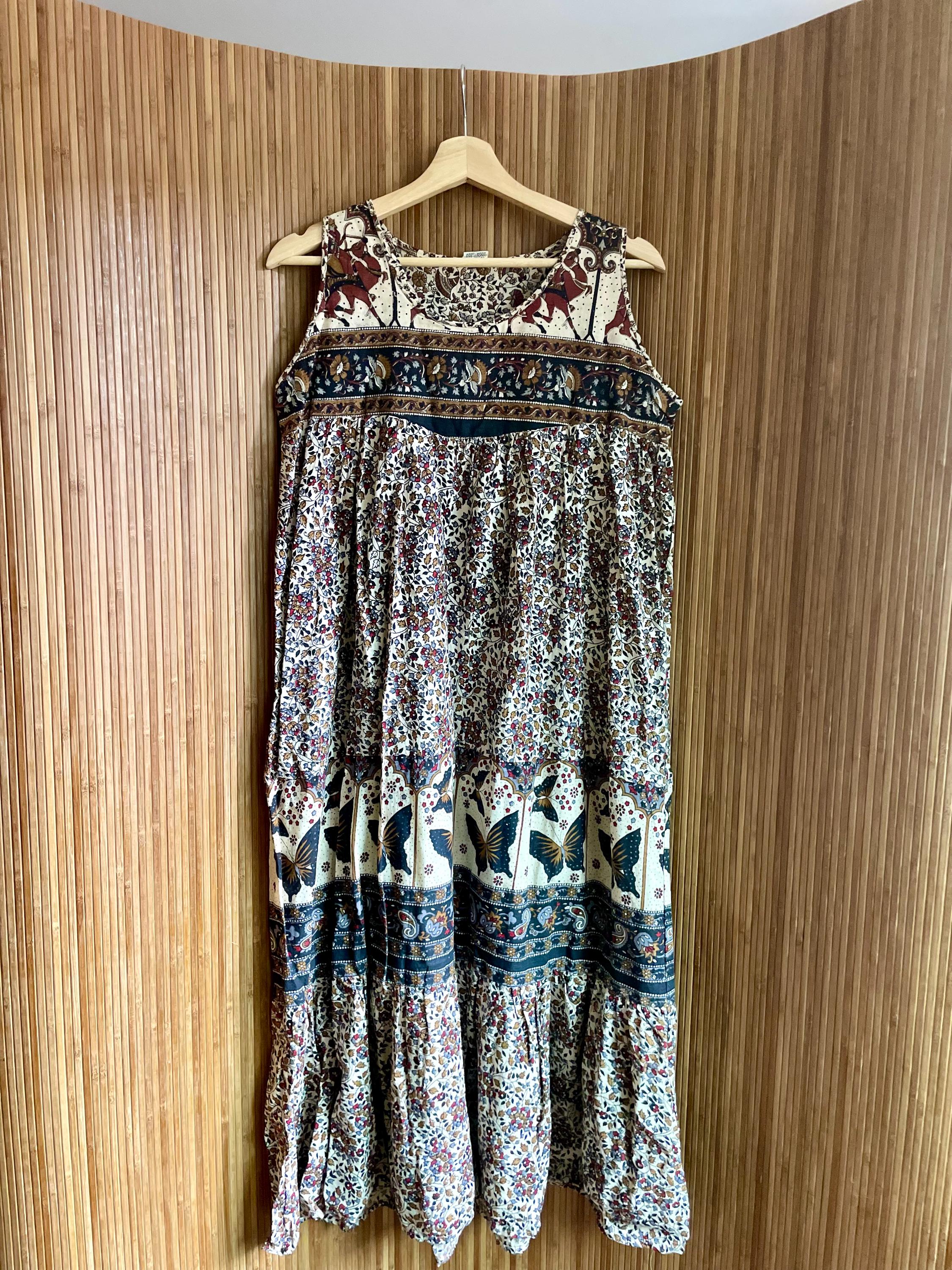 Deadstock vintage hand‑blocked Indian cotton dress — lightweight, breathable, and fully tagged. Features gathered empire bodice, full tiers, and a striking butterfly/paisley border print.