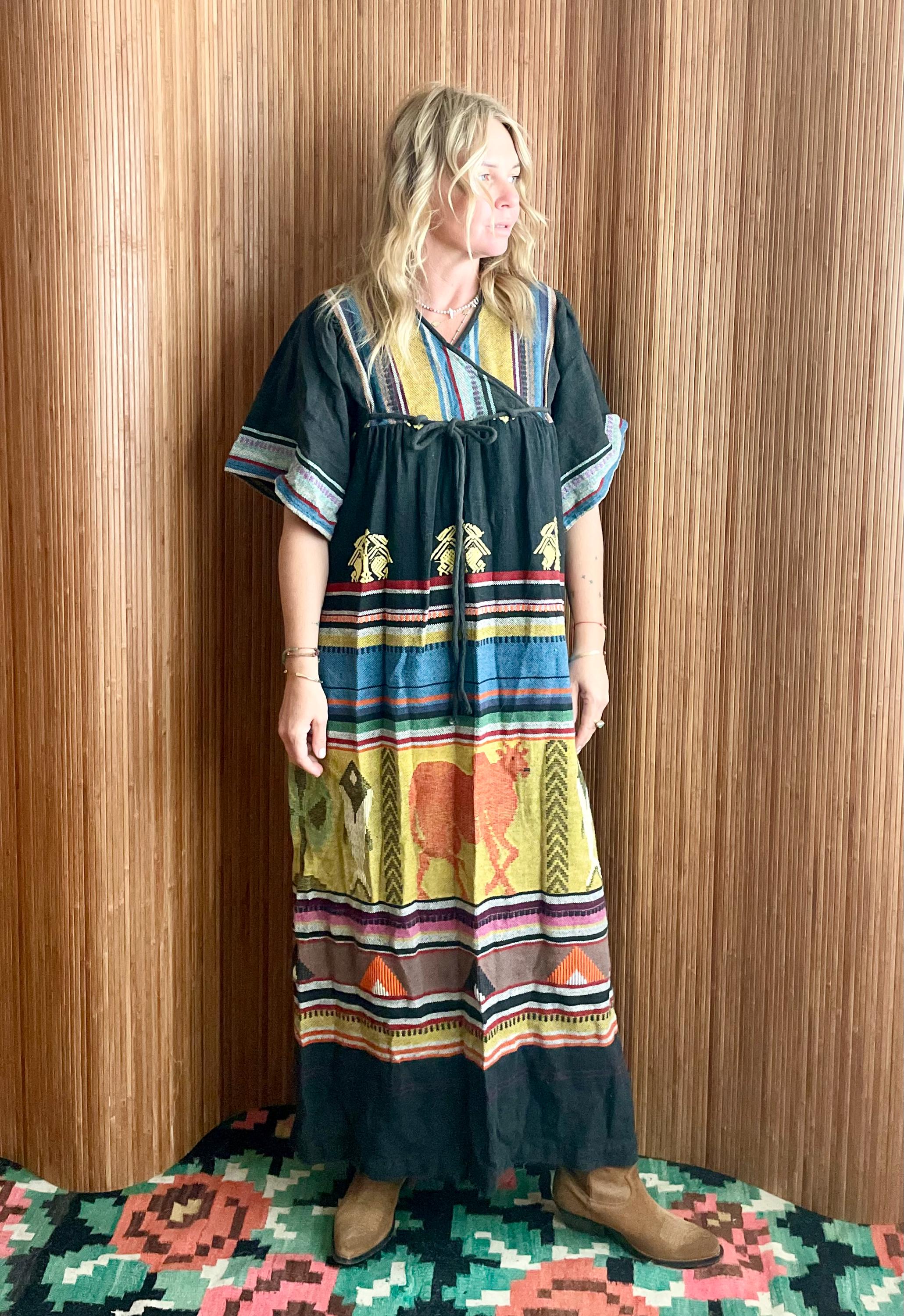 This dress is a genuine vintage find from the 70s. It features a captivating blend of patterns including bold stripes, intricate geometric designs, and charming elephant motifs, all in a stunning array of colors against a deep black background. The print tells a story