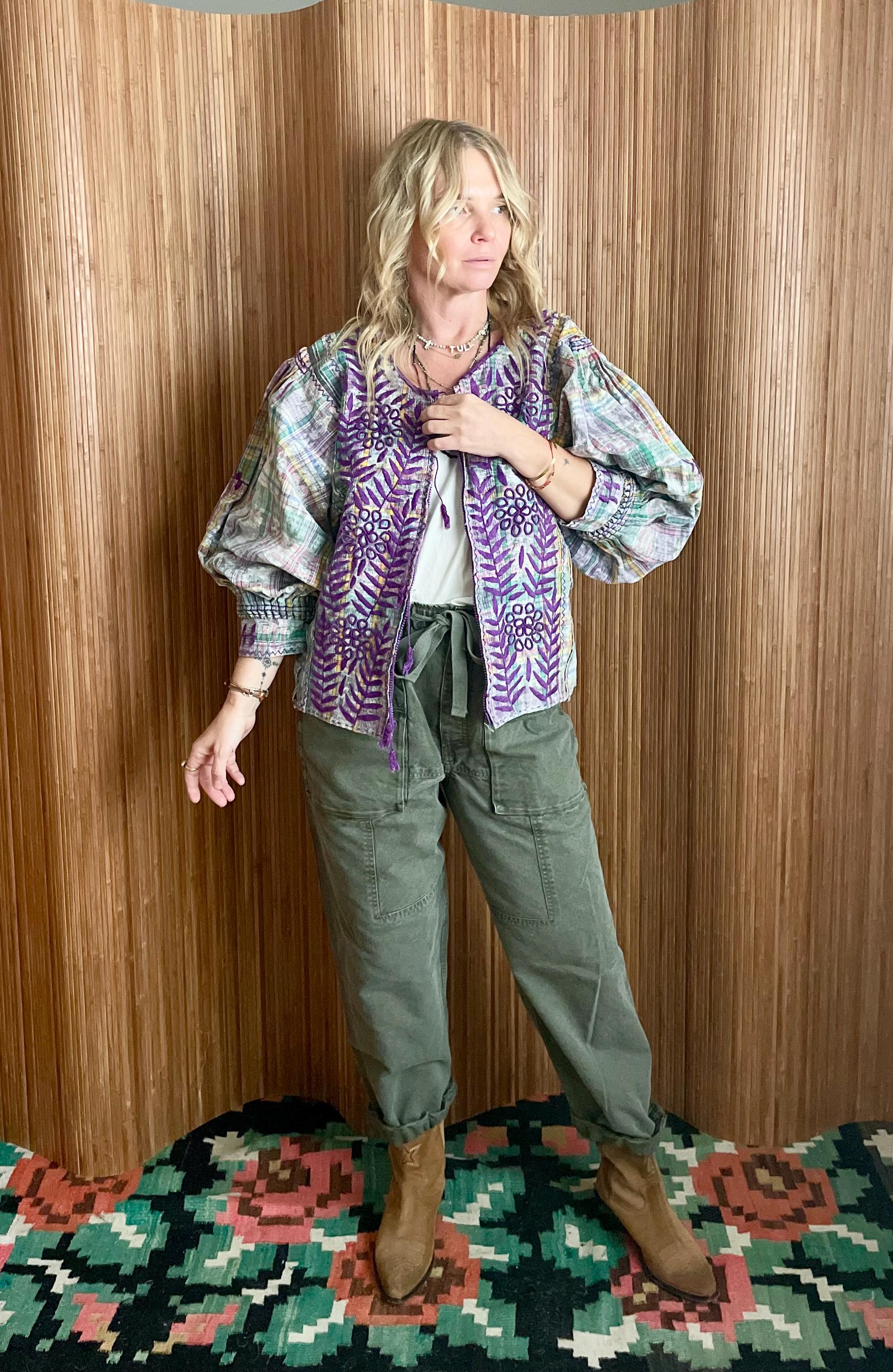 A striking vintage Chiapas jacket crafted from richly textured, ikat-inspired handwoven cotton, featuring bold purple embroidery and softly gathered sleeves. This piece reflects the vibrant textile traditions of southern Mexico, where color, pattern, and handwork tell cultural stories passed through generations.
