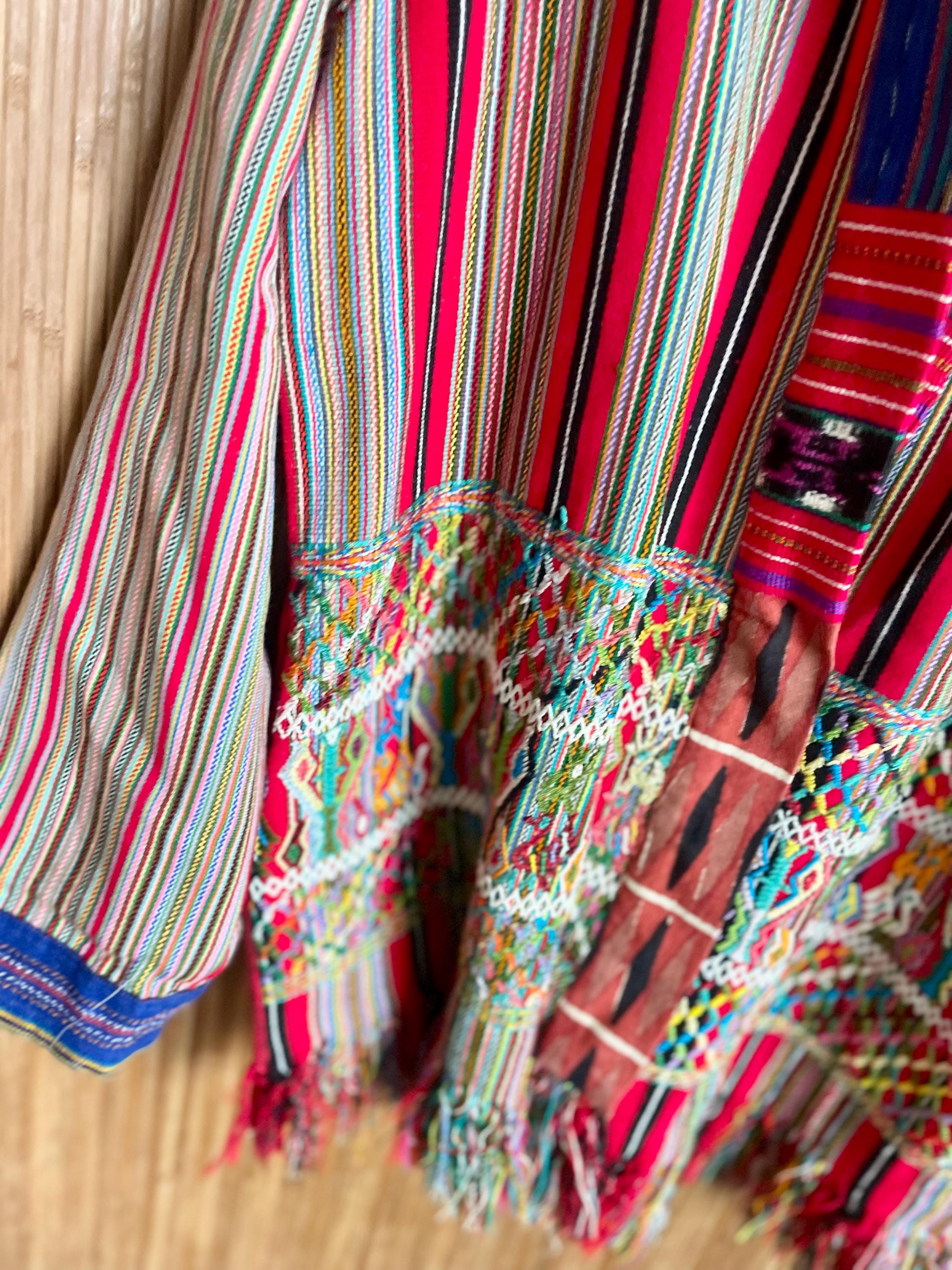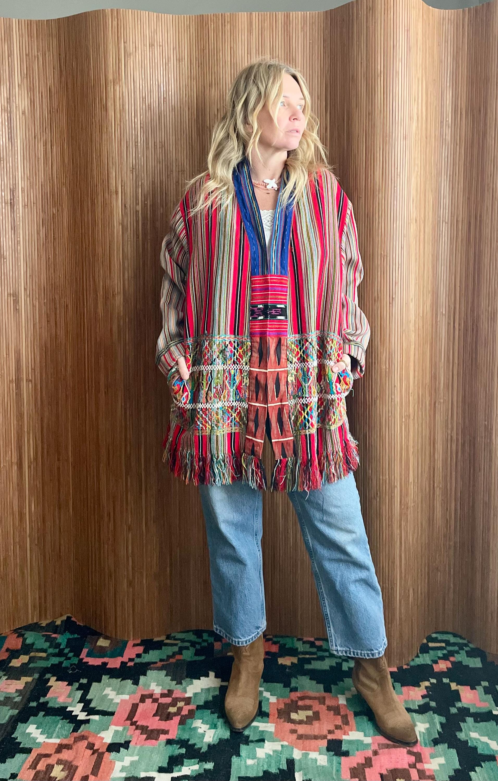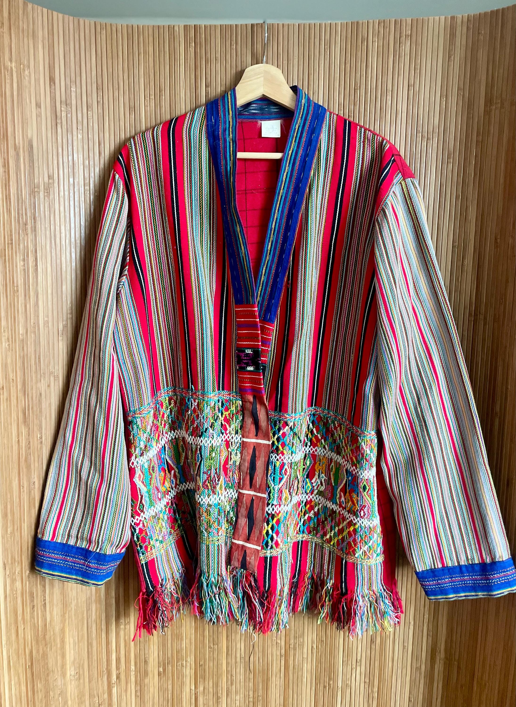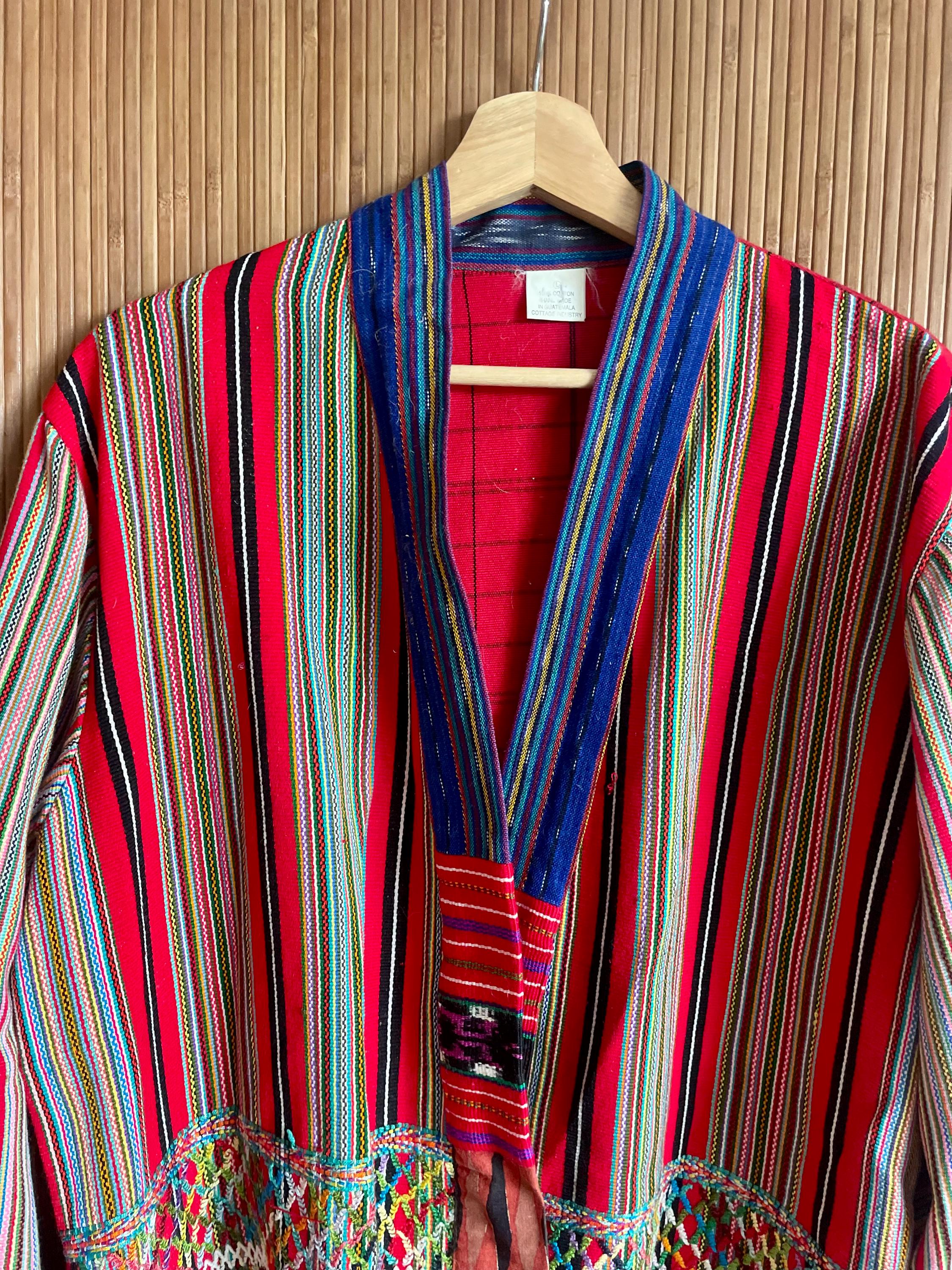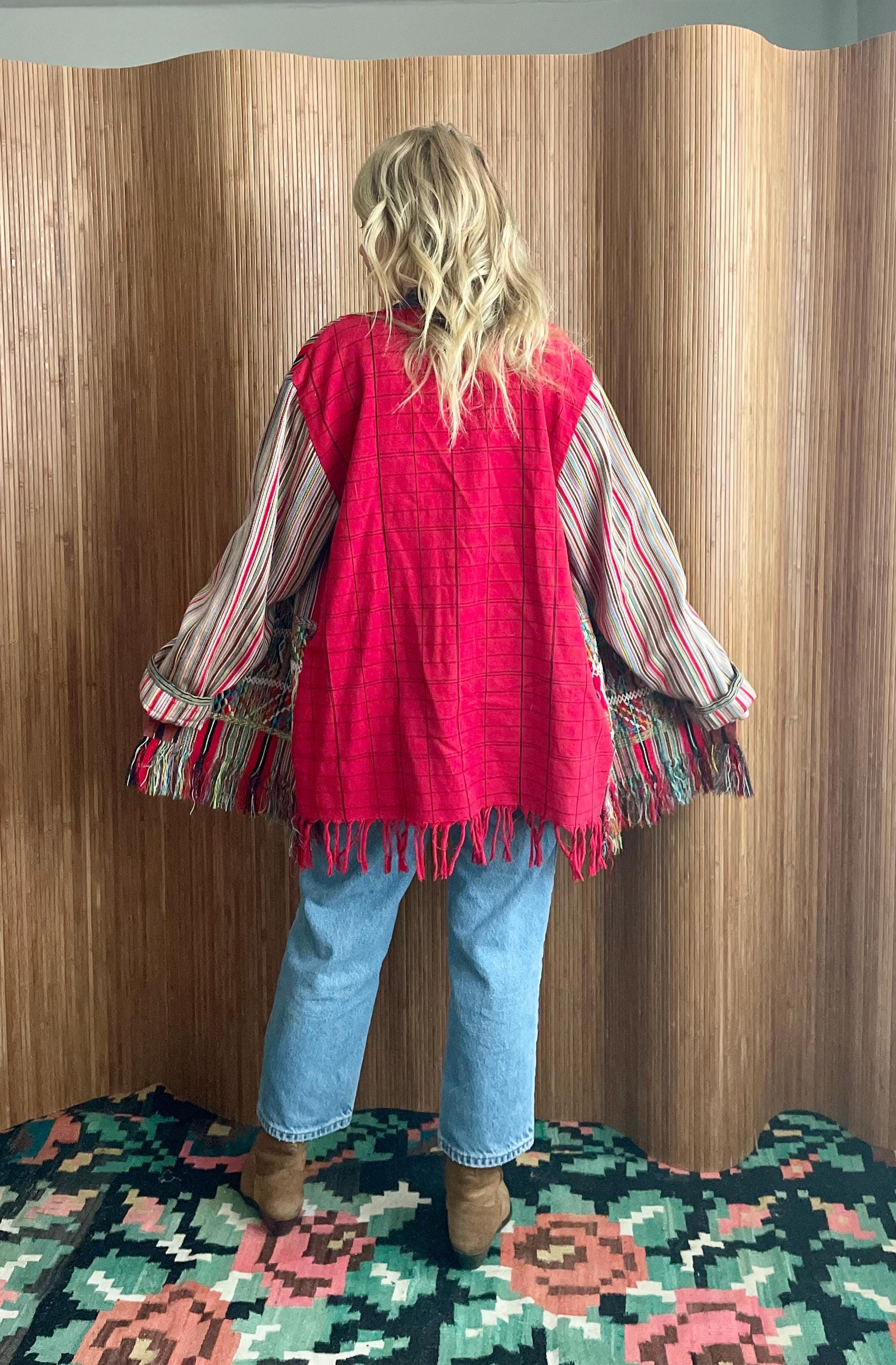 Rare vintage Guatemalan hand‑loomed corte jacket in vibrant red stripes with intricate hand‑embroidered panels and fringe. Lightweight, ethnic boho layering piece