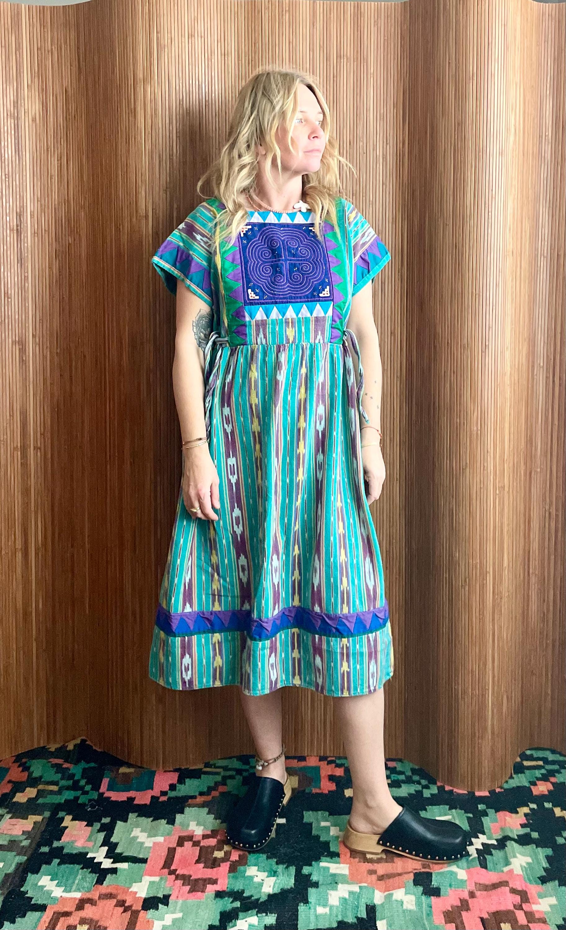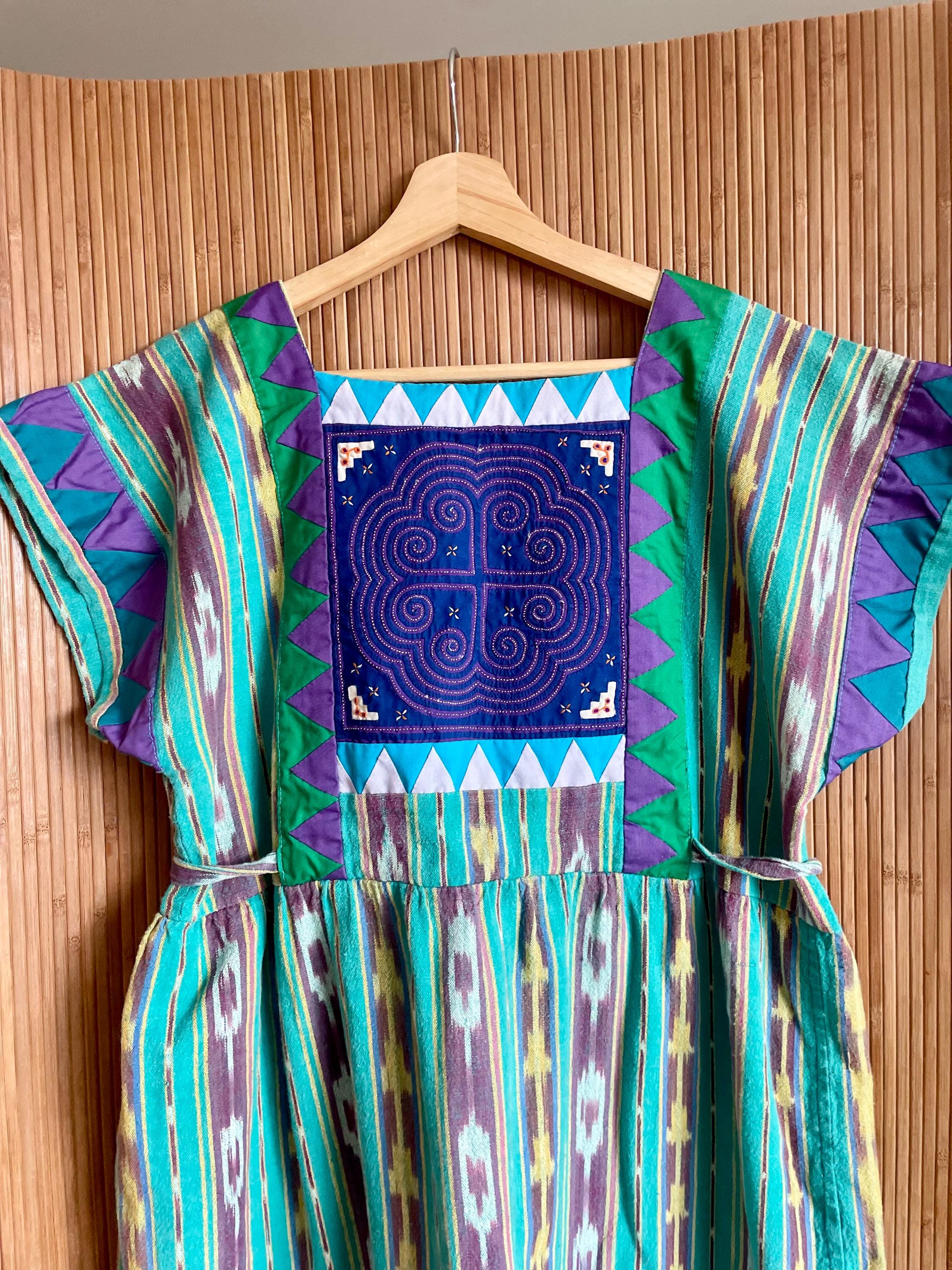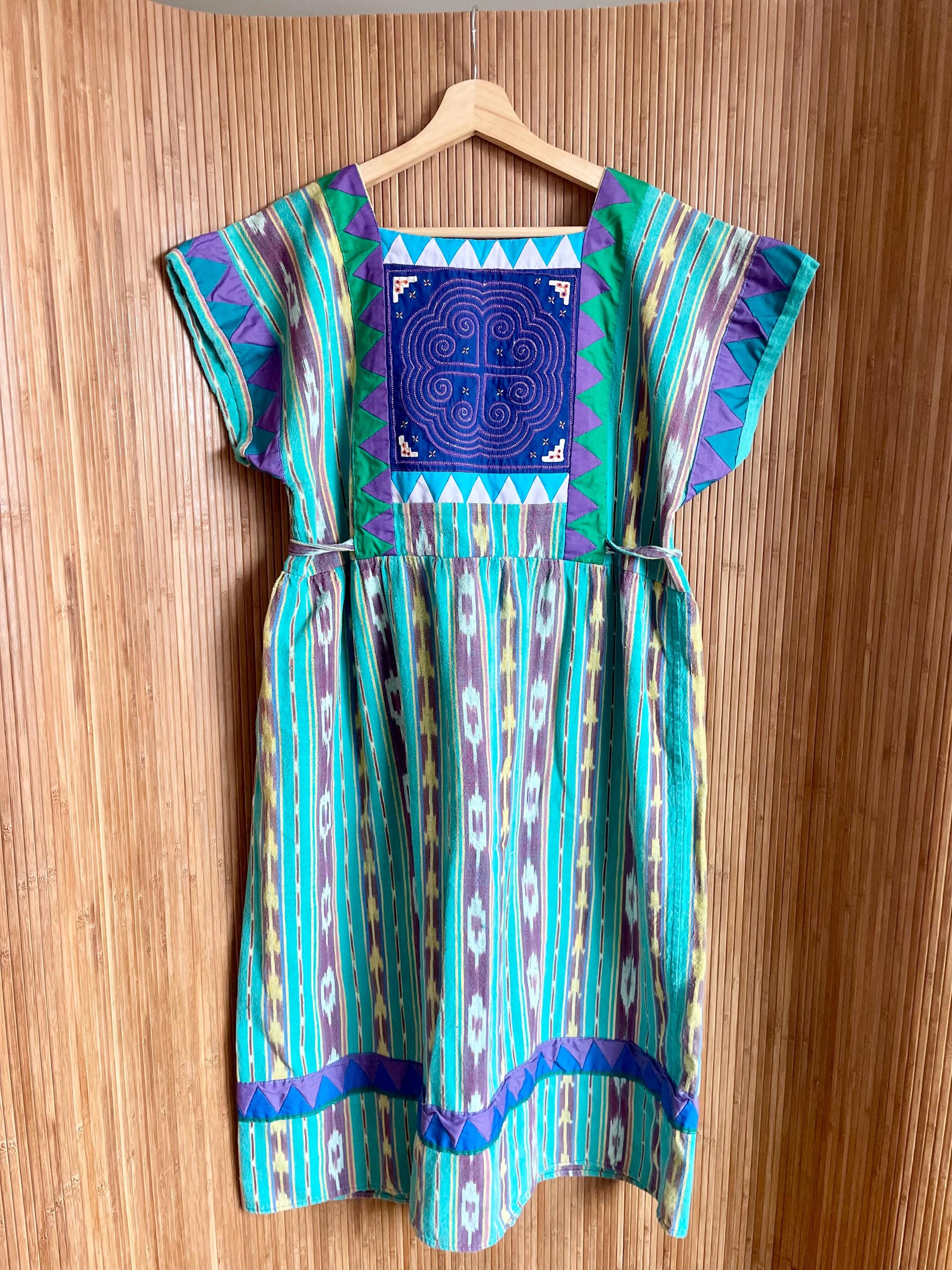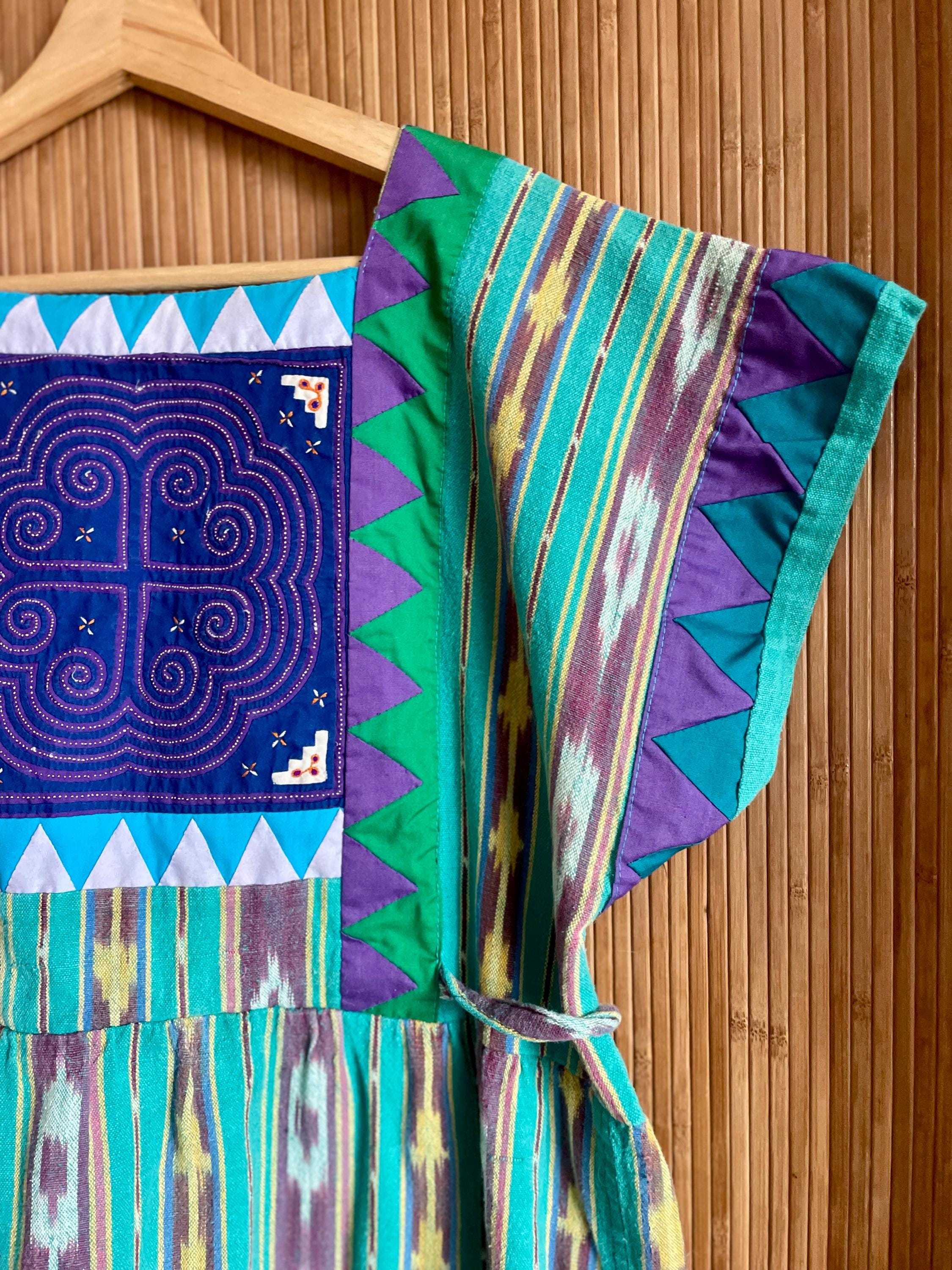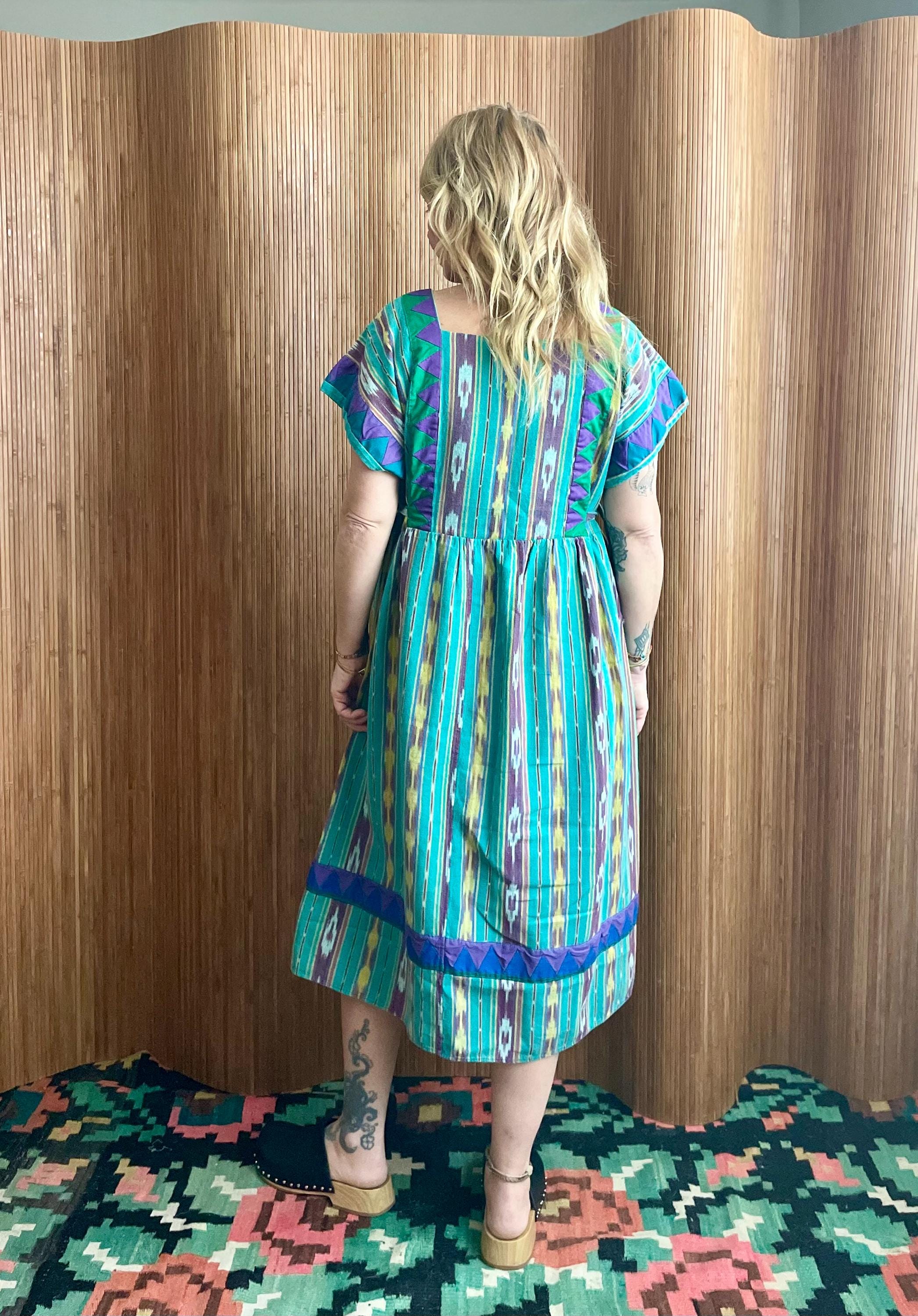 Bright vintage ethnic ikat dress with a geometric appliqué yoke and side ties. Turquoise, purple and yellow striped ikat print